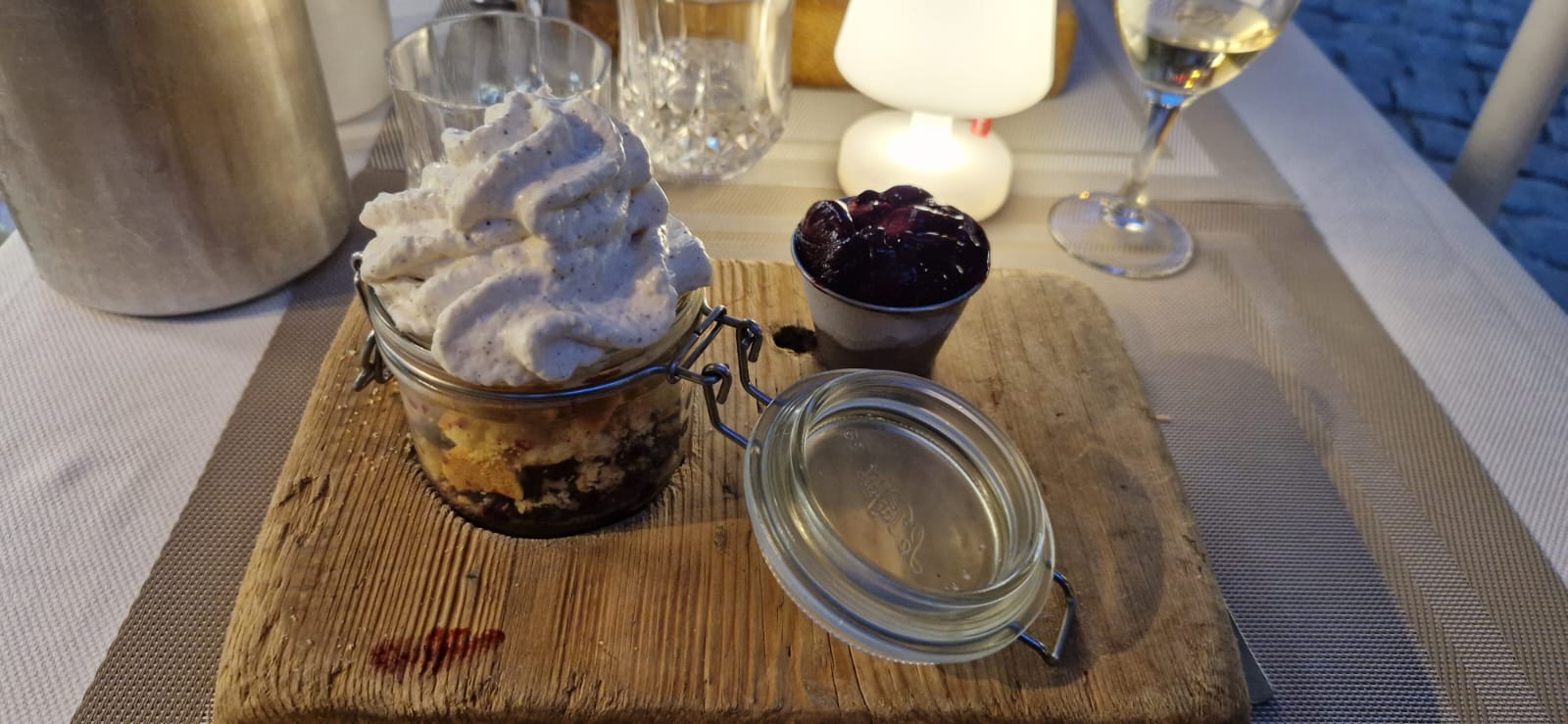 Restaurant visité en famille Un beau cadre Nous avons pris de menus et des plats variés Tout était bon même si assez moyen pour le prix demandé La tarte aux myrtilles revisitée par contre QUELLE DÉCEPTION !!! Dans un bocal qq myrtilles au fond et du coulis, de la poudre de spéculos et beaucoup trop de crème fouettée Vraiment dommage…