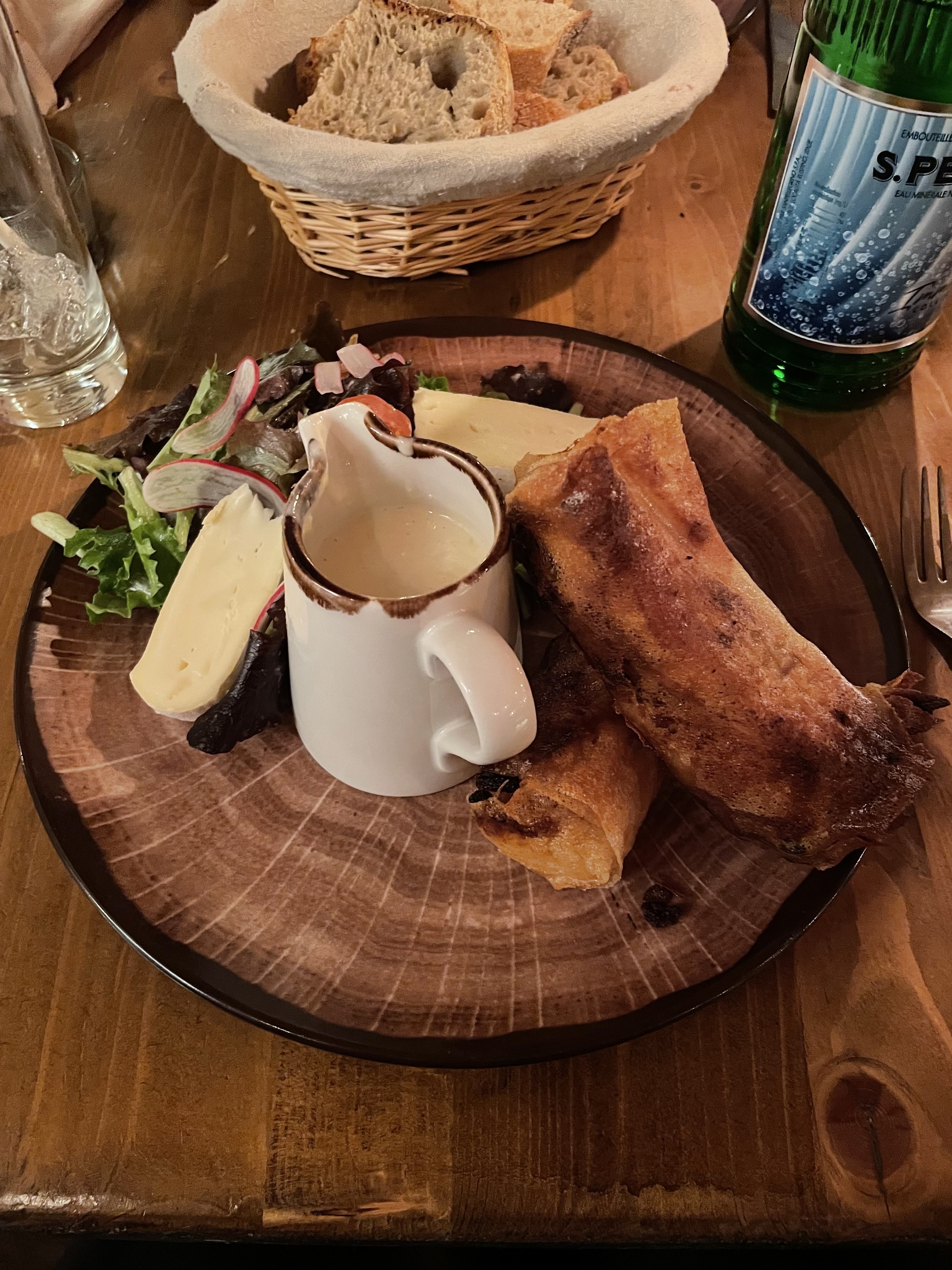 Nourriture très satisfaisante - abondante, chaleureuse, pour remplir votre ventre et vos sens. C'était comme un grand dîner de Noël chez votre grand-mère. Les portions sont grandes ! J'ai eu le menu fixe avec entrée, plat principal et dessert, et honnêtement, j'aurais pu m'arrêter à l'apéritif. Mais je suis content de ne pas l'avoir fait car le plat principal était super sympa. Le poisson était absolument magnifiquement cuit (je me suis cependant salé), avec une belle sauce aux amandes, une magnifique ratatouille et du riz sauvage/rouge qui l'accompagnait. Mon mari a eu les œufs à la truffe, ce qui était super sympa aussi. Il avait la tartiflette comme plat principal ; Je n'ai pas essayé mais il a dit que c'était bien. La sauce au fromage qui l'accompagnait était suffisante pour que je puisse tremper du bon pain français et déguster mes propres morceaux de fondue. C'était merveilleux. J'ai opté pour la crème brûlée en dessert - mangée avec brio par mon mari, mais j'ai pris quelques bouchées - et je ne le regrette pas !