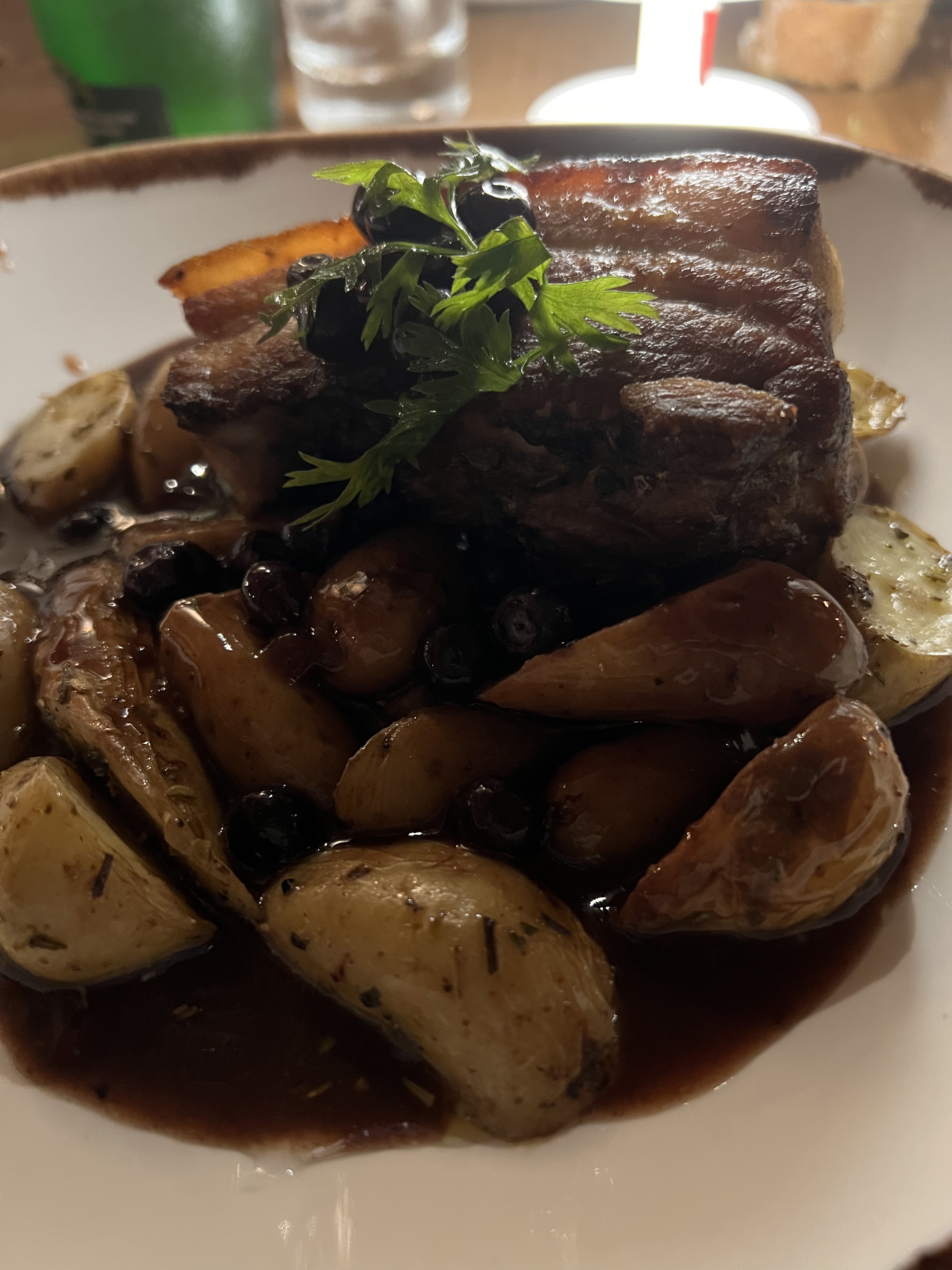 Un très joli restaurant avec une belle ambiance traditionnelle et un bon service. Cependant, la nourriture était horrible. Nous avons eu les tagliatelles au poulet et aux truffes qui coûtaient environ 40 € et n'avaient absolument aucun goût. La sauce était aqueuse, le poulet était fade et le plat dans son ensemble rappelait simplement la cafétéria comme le déjeuner scolaire. Ça vaut 5€ au mieux. La poitrine de porc cuite lentement pendant 8 heures était légèrement meilleure mais même cela était vraiment gras et la sauce aux myrtilles un peu trop sucrée. La crème brûlée aux marrons était probablement la pire que j'ai eue en France - la consistance était juste mauvaise, elle était presque liquide et gluante et elle ressemblait à de la glace fondue ou à de la crème anglaise. Je n'aime pas laisser de mauvaises critiques et le restaurant et le personnel sont vraiment adorables mais la nourriture est tout simplement terriblement mauvaise pour ce que vous payez !