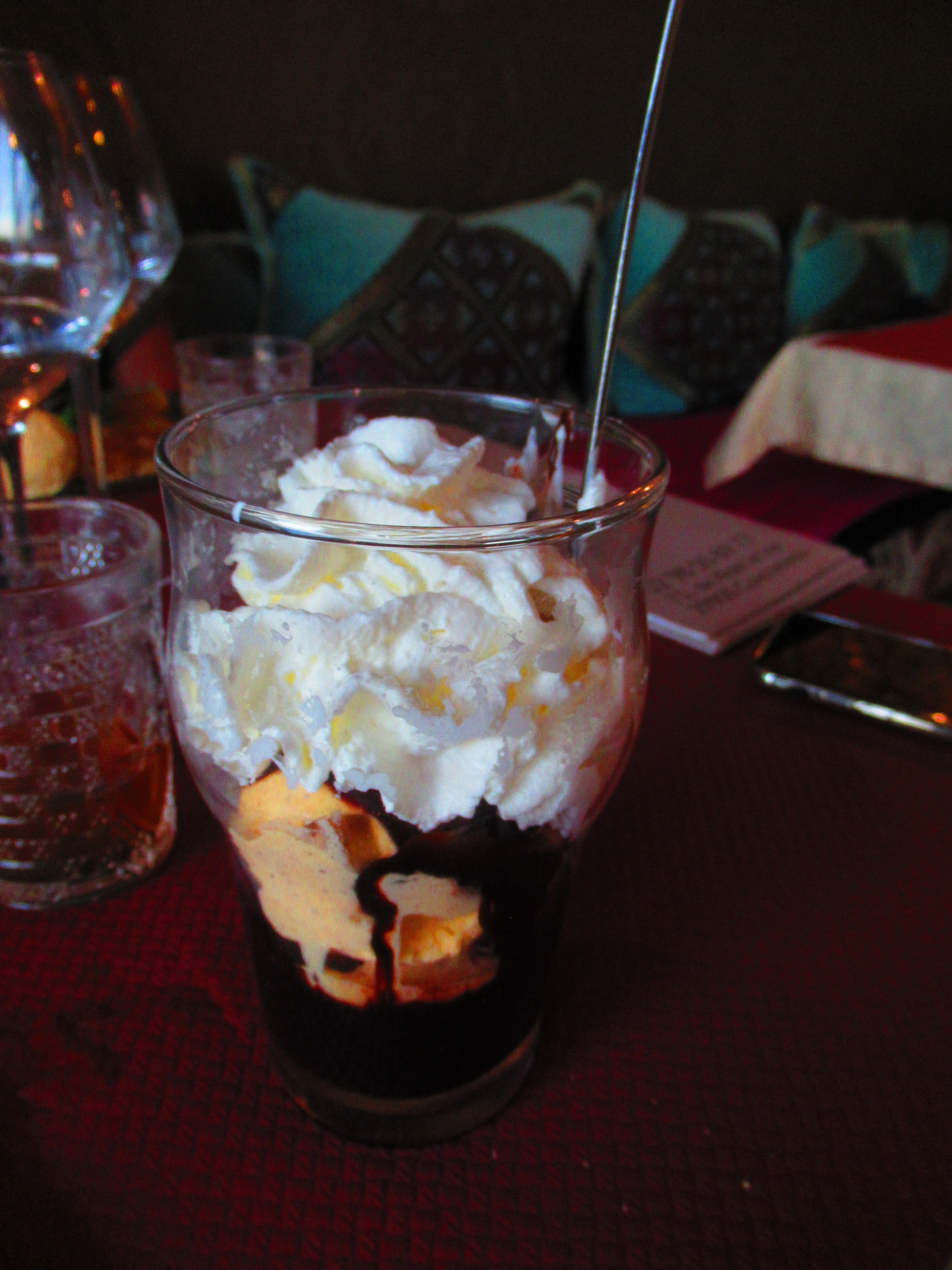 La table où nous étions était beaucoup trop petite. Risque de chute pour les verres, carafes... une très belle décoration. Pour ce qui est du repas c'était bon, mais pas assez chaud , et la semoule trop fine. Et très déçue car il n'y avait pas de pâtisseries orientales.
