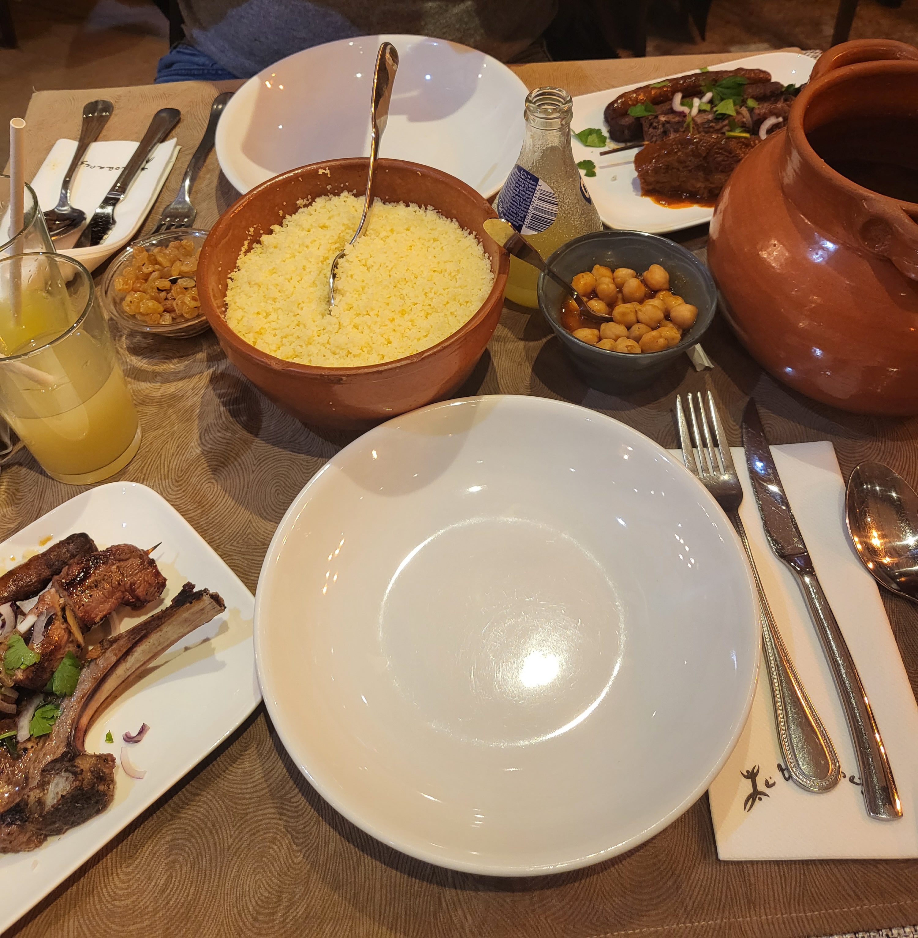 Ce n'est pas l'endroit où aller s'il y a un végétarien dans votre groupe (le couscous végétarien de mon mari avait des morceaux de bœuf visibles), mais sinon très agréable. Mon préféré était le plateau de thé à la menthe et de pâtisseries pour le dessert.