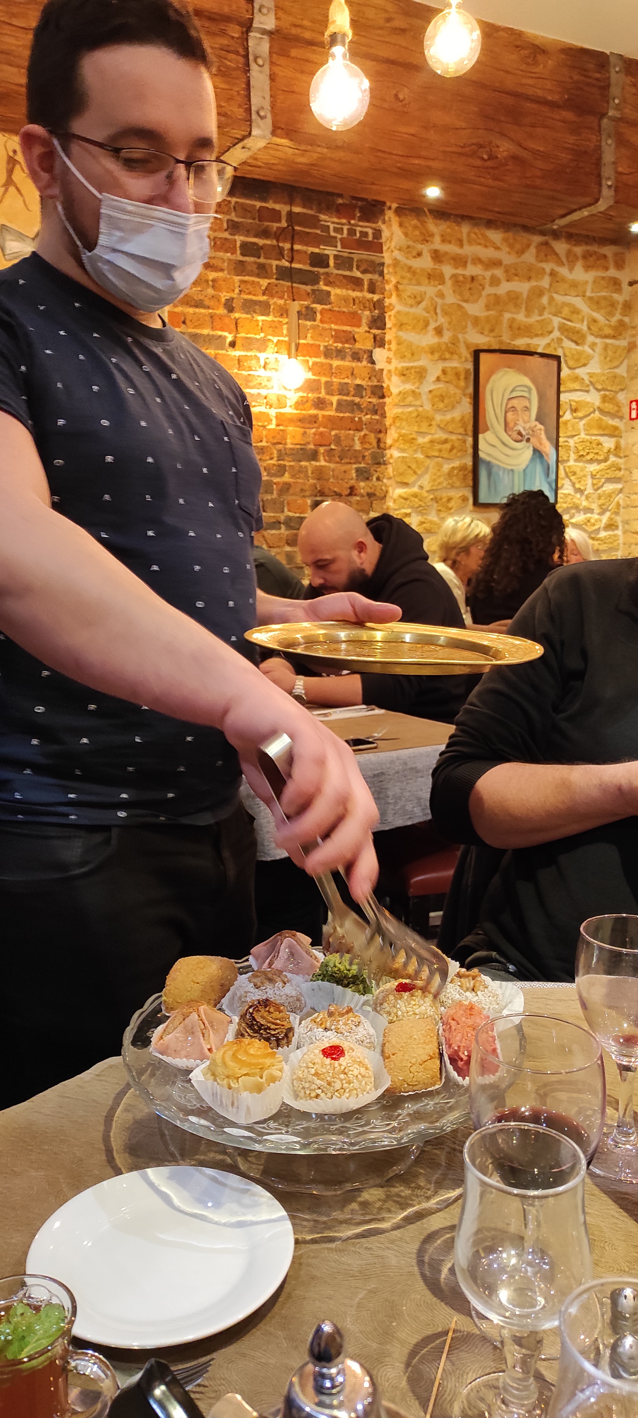 Semoule fine et légère, bouillon bien garnis en légumes variés avec des pris très raisonnables. Le patron et ses employés sont très agréable, joviaux, taquins à souhait. Les brochettes et côtelettes d'agneau étaient bonnes. J'ai trouvé pour ma part les merguez un peu trop sèche mais avec un bon piquant pour quelqu'un qui mange peu épicé. Le décors n'est pas dès plus typique, mais l'endroit est bondé et participe à l'ambiance chaleureuse. Et mention spéciale : moi qui n'ai jamais été fan des pâtisseries orientales exception faite des loukoum et zlabia, j'ai enfin pu découvrir et comprendre l'engouement de mes amis maghrébins présents pour les makroudh, baklawa, corne de gazelle etc qui étaient succulents, fondant, riche. Meilleurs que ceux de ma mère! si tant est que cela puisse donner un repère. Un restaurant que j'ai eu donc grand plaisir à découvrir, que je conseille, et où je retournerai les yeux fermés.