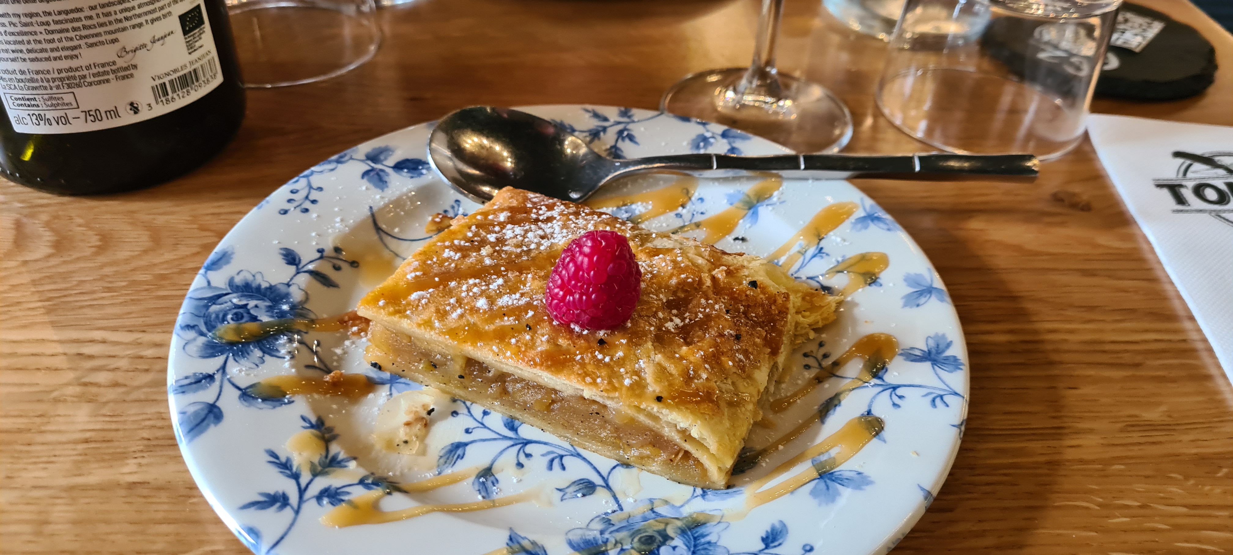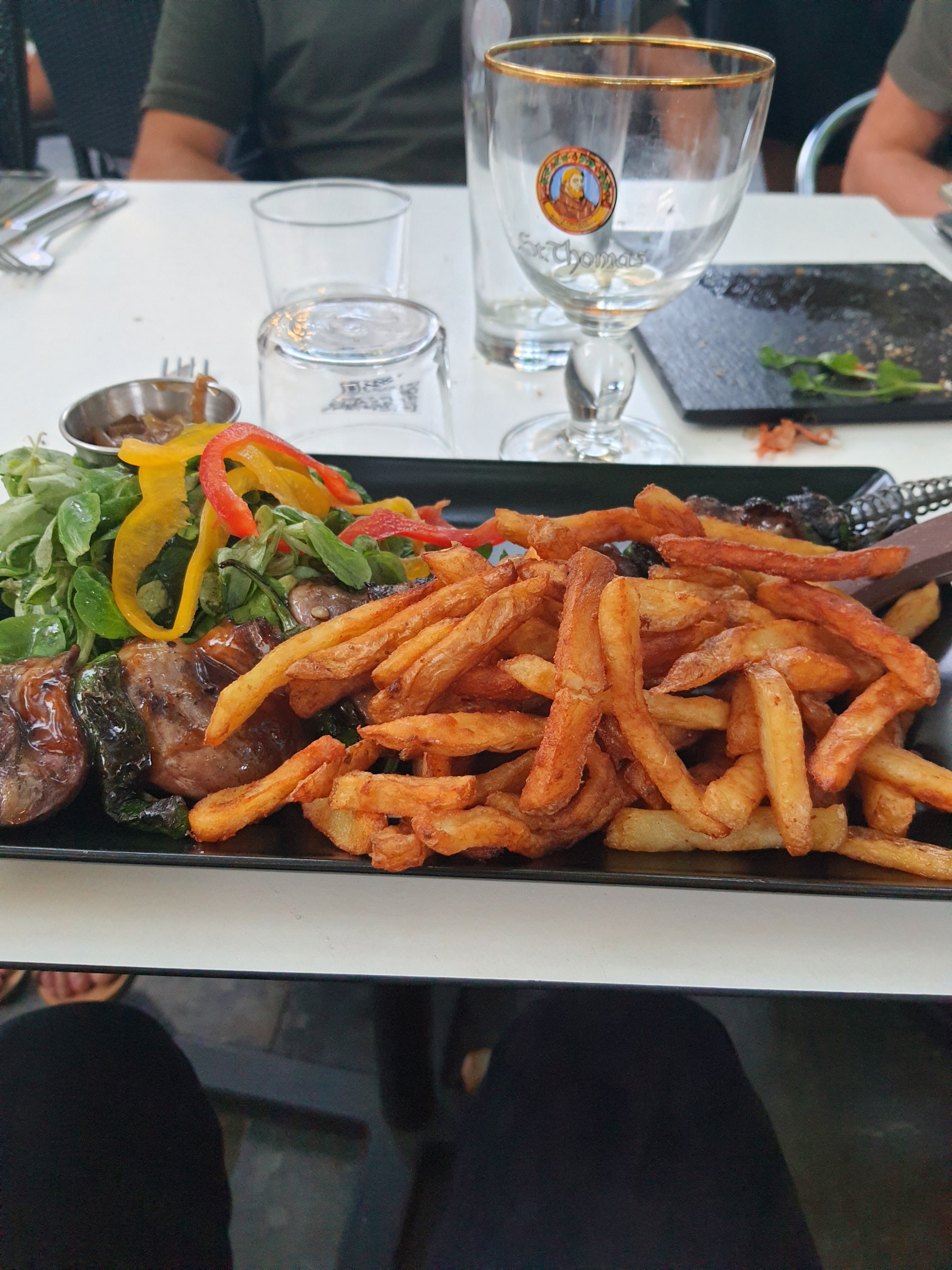 Salade au chorizo très bonne qui change de l'ordinaire, très bonne qualité de viande, j'ai prit un Onglet de boeuf il était excellent très bonne sauce au poivre, je trouve qu'il y a trop de salade qui accompagnent les plats une assiette de salade en entrée suffit. Serveurs à vos services très courtois, malheureusement j'ai eu un mégot de cigarettes dans la panière à pain, ils l'ont changer aussi tôt, la croustade pas terribles 👍