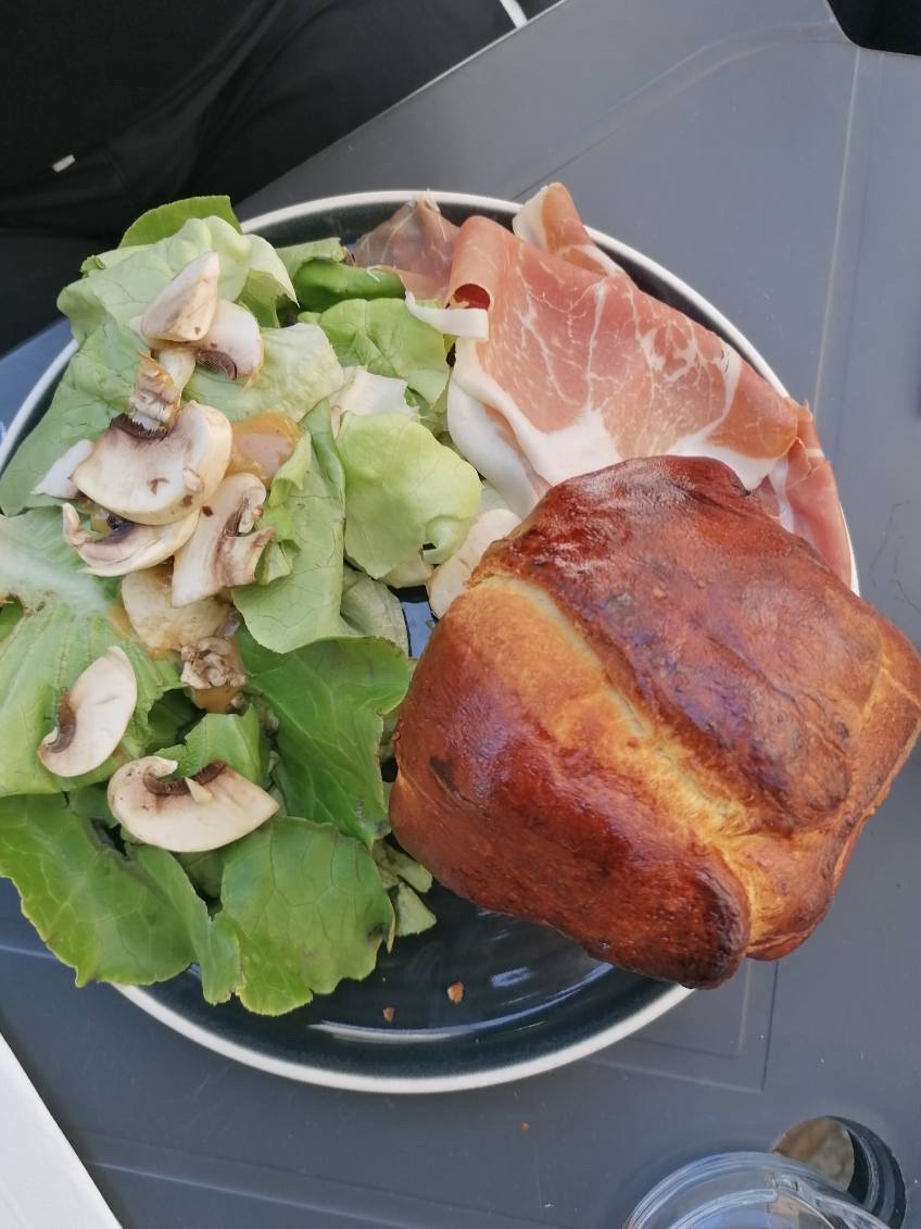 Août, journée splendide, mangé dehors sur les tables de la rue principale. Service courtois. J'ai pris un plateau de charcuterie et de fromages et une salade César. Tout est bon et frais. Coûts moyens.