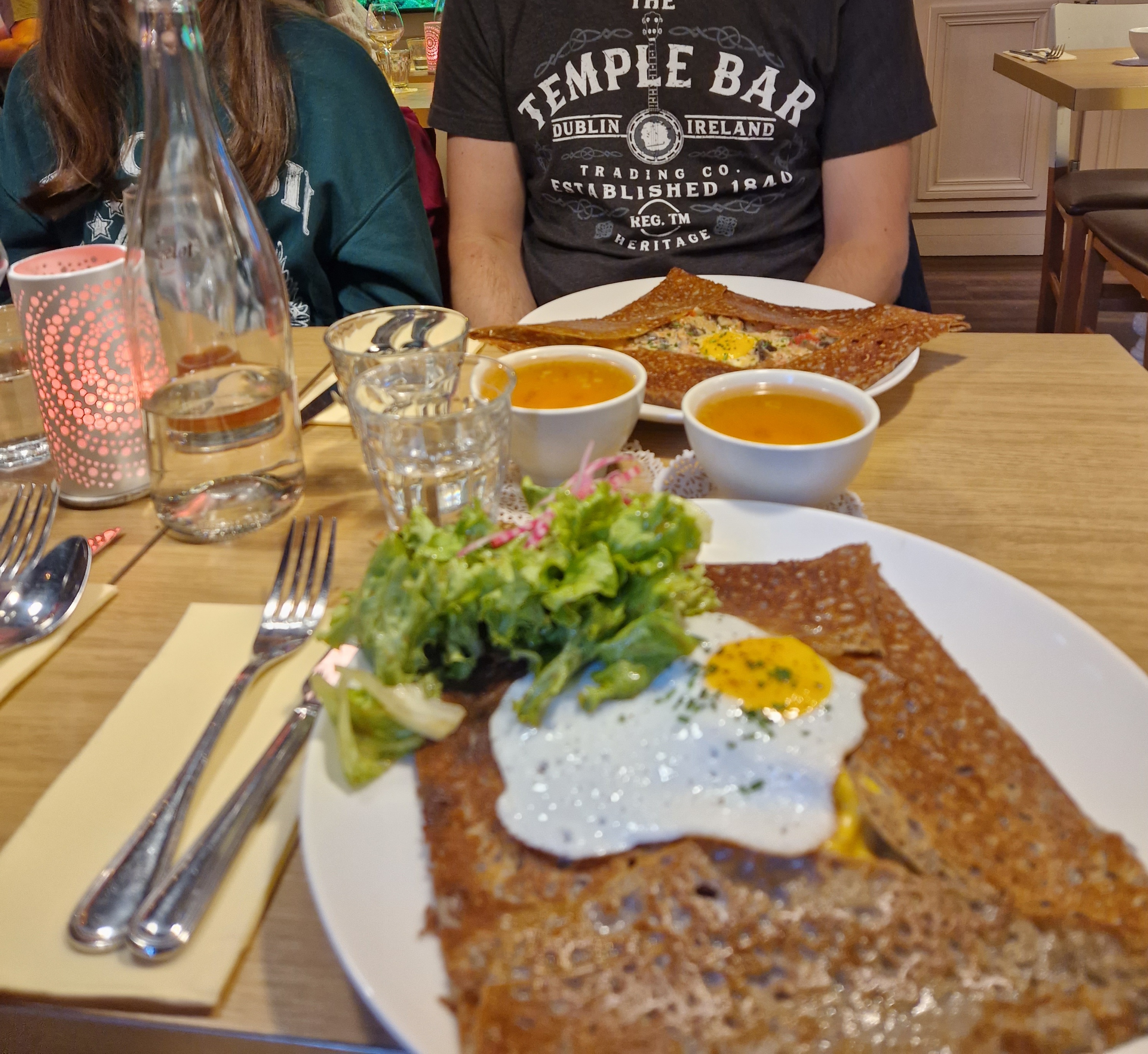 Nous avons passé un bon moment dans ce restaurant joliment décoré, le service est impeccable, les serveurs très sympas. Nous avons chacun commandé des galettes différentes, la qualité et la cuisson de la pâte à galette est excellente. Globalement très bon à quelques détails près. Le seul point négatif, les prix sont un peu chers pour ce que c'est, d'où ma note. Surtout le prix des bières, une pinte à 14 euros c'est très cher. Grosse odeur de cuisson a l'étage qui peut être un peu gênante.