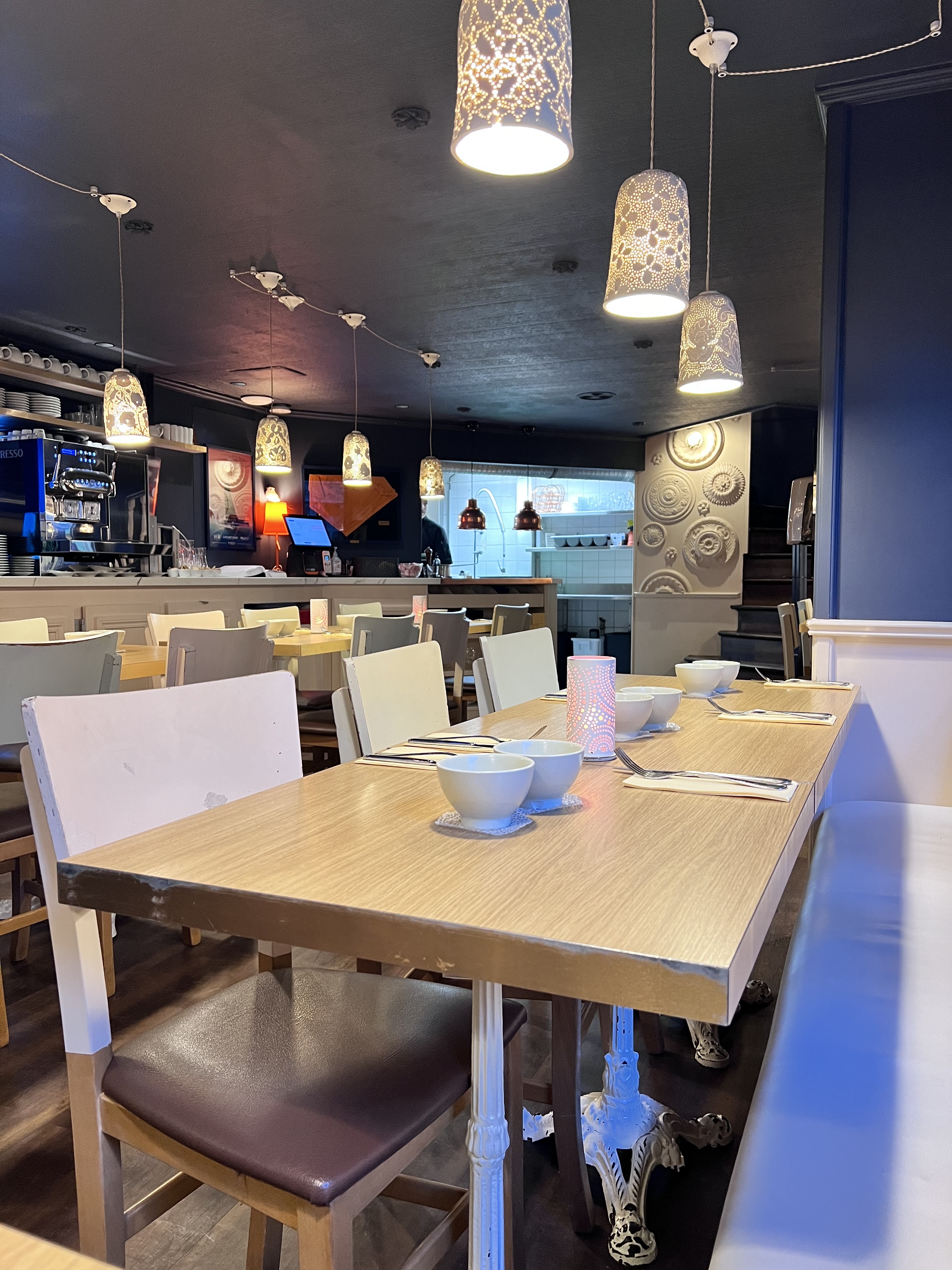 Accueil chaleureux, vaisselle propre et décoration soignée. Service impeccable et efficace. Cuisine ouverte et cuistos impeccables. Nous avons passer un excellent moment. Musique pas trop forte et agréable.