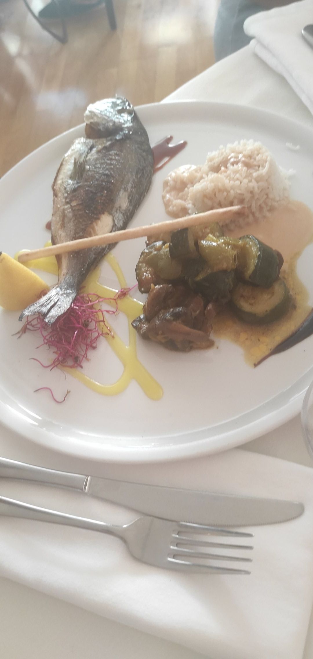 Déception sur le plat de poisson : filet de loup trop cuit, insipide, limite du comestible!.Après avoir fait la remarque auprès de la restauratrice, sa réponse: le cuisinier ne sait pas cuire le poisson, des clients se sont déjà plaints