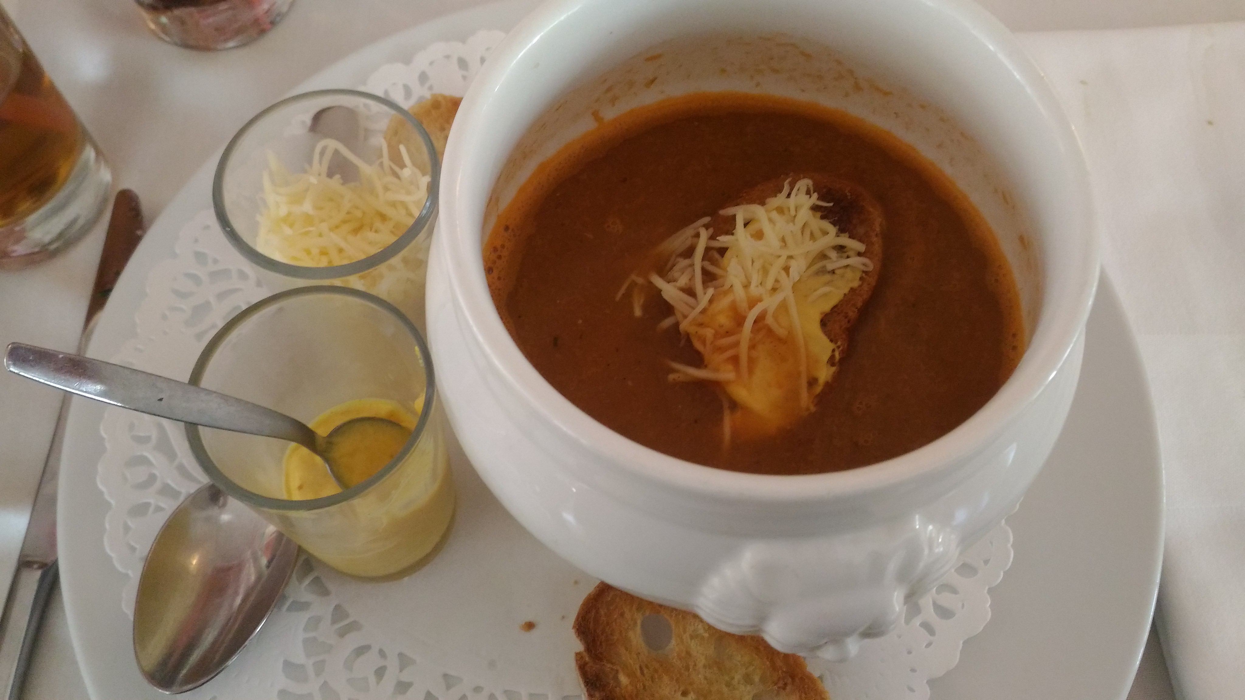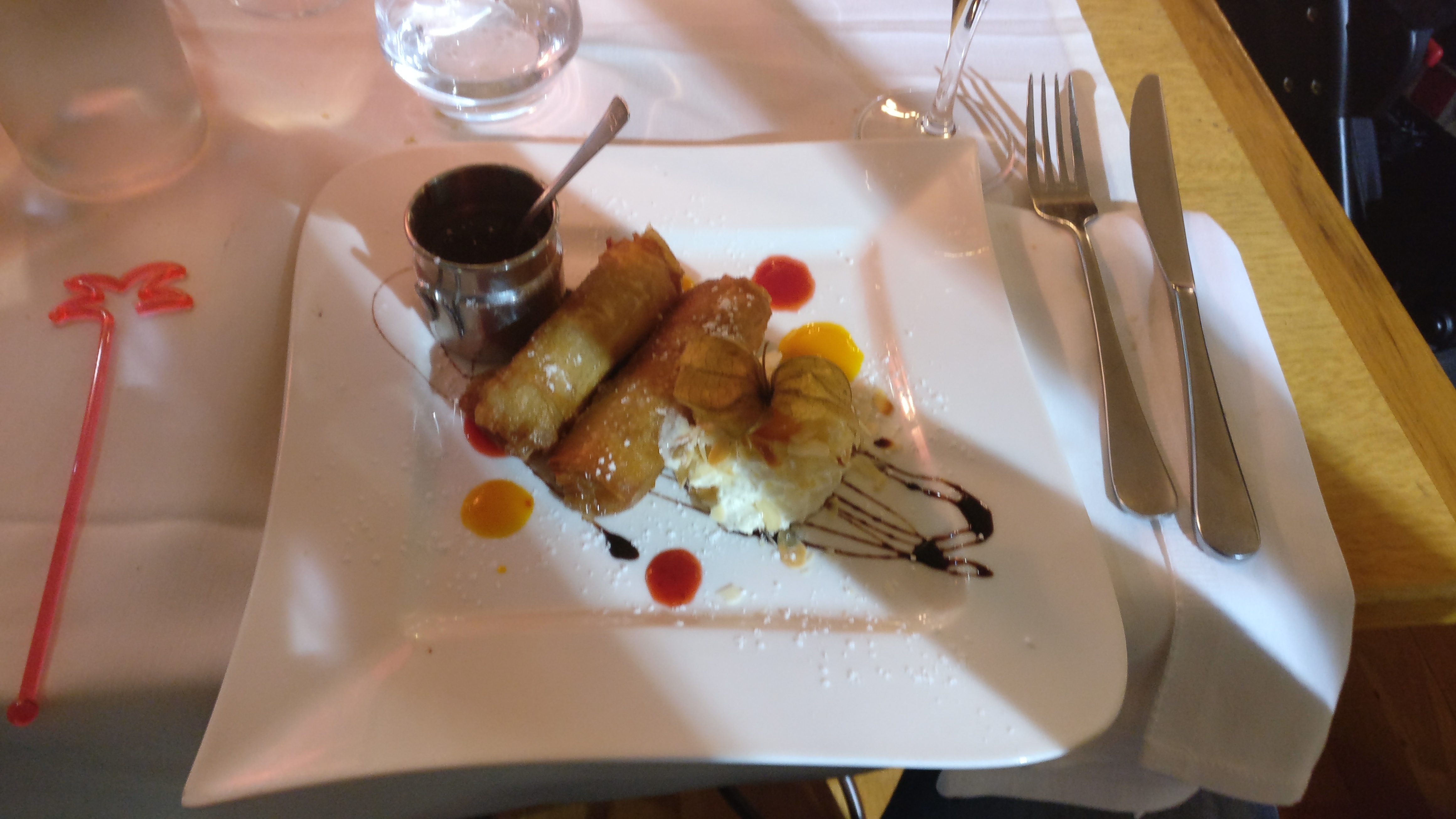 Très belle découverte un Accueil parfait rapport qualité pris rien à dire entrée plat dessert pour 24 euros très bien servi la soupe de poisson en entrée y avait largement pour deux suivi d'une souris d'agneau grilée un délice (pas de photo pour surprise) et un très bon dessert nem banane chocolat une tuerie...