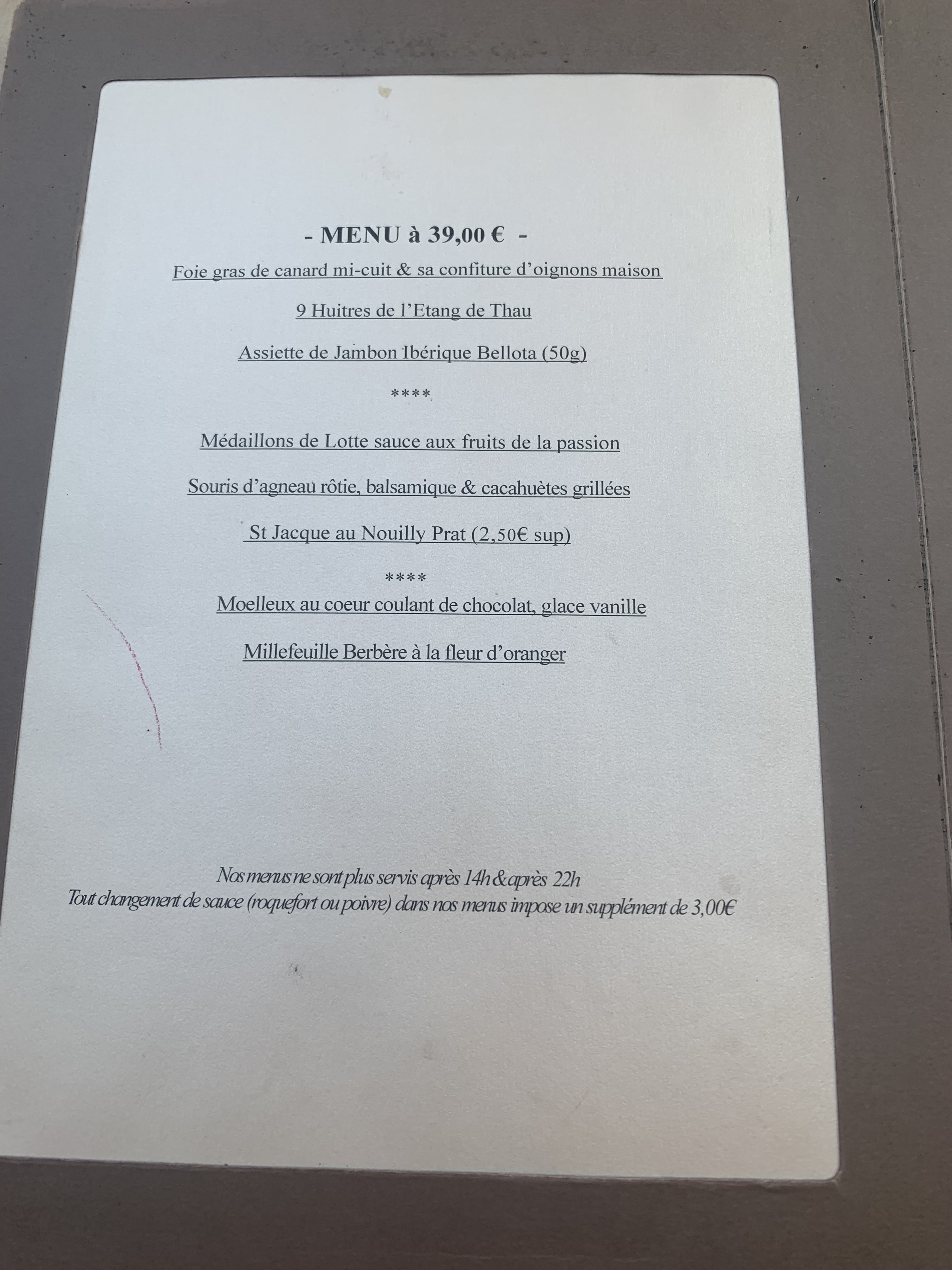 Bien que la musique ne soit pas assez intime, l’ambiance est agréable. Il est important de réserver car ce restaurant est prisé! Très bel extérieur, j’en ai pris une photo, ce qui n’est pas dans mes habitudes. Les Plas sont cuisinés à point, et le goût passe avant l’impression visuelle. Je regrette que les légumes d’accompagnements soient si peu représentés, même si le principal (souris d’agneau) soit généreux et parfait. Desserts agréables Nous avons pris des menus à 29€ (plus supplément) J’aurais bien pris à 36€ mais les entrées ne me correspondaient pas 🙁. Les tartines de cabécout m’ont enchanté car souple et non dés croûtons comme souvent. Merci pour cette si bonne idée 👍