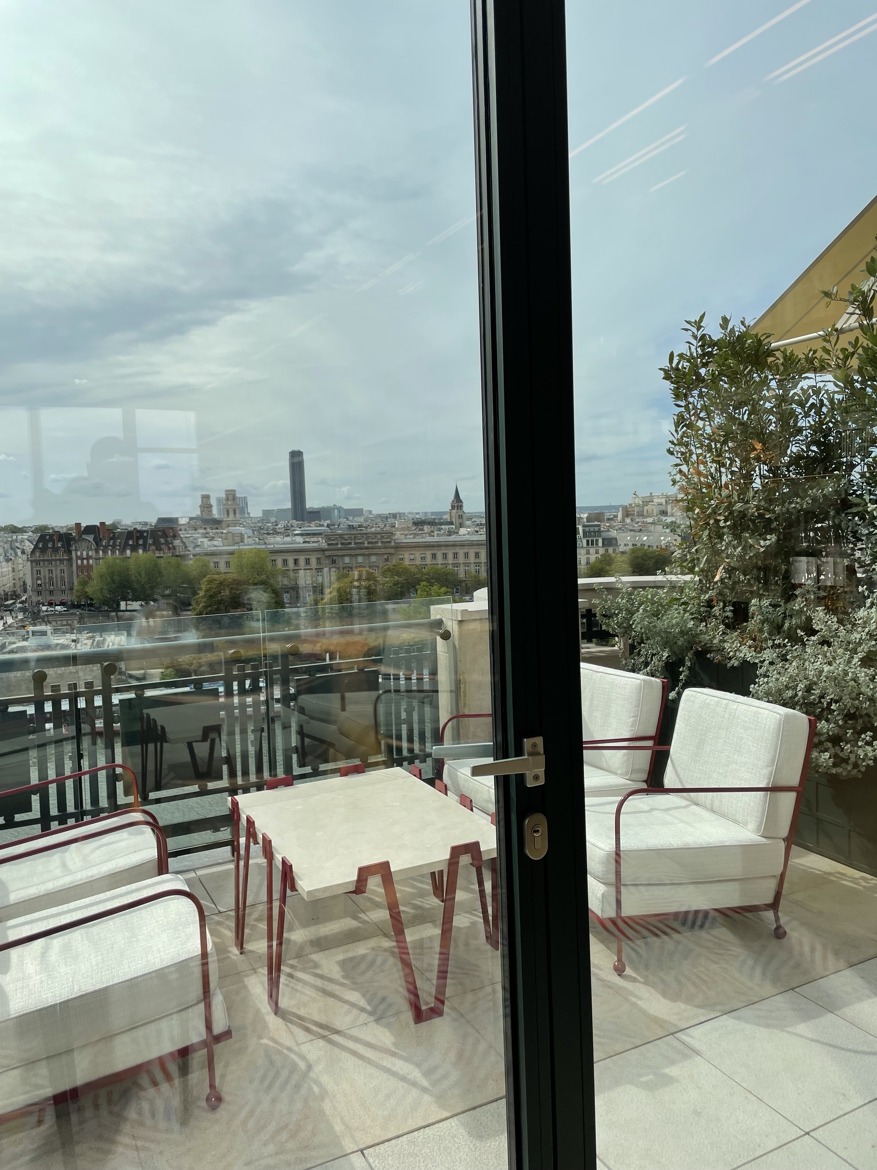 Palace grand luxe mais terrasse réservée aux clients situé à côté de la samaritaine. Très belle vue sur Paris et belle décoration avec un accueil chaleureux. Nous sommes venus juste pour boire un café et voir la terrasse. Ascenseur avec image en direct sur les alentours. Très original.