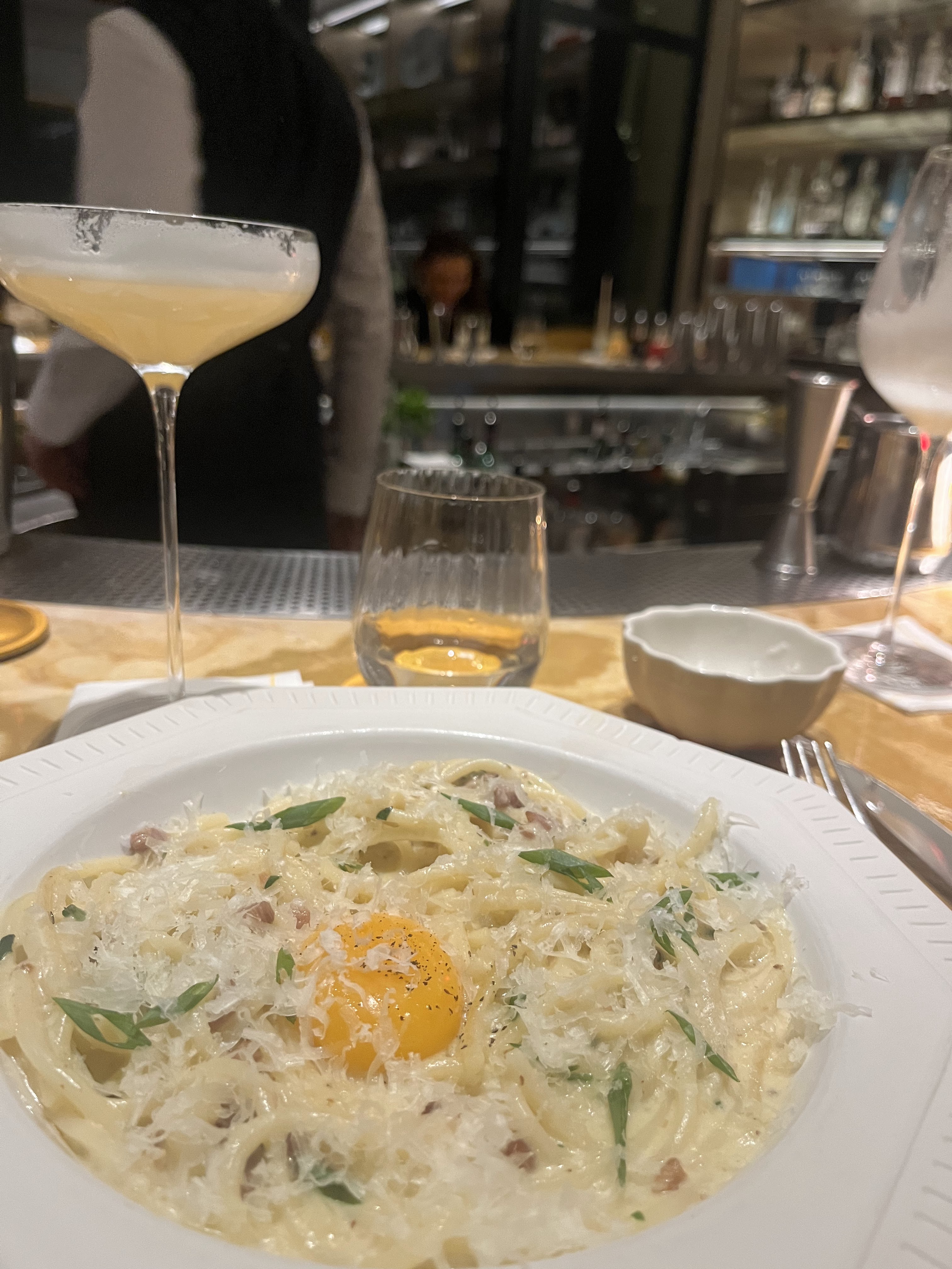 Supers cocktails et une très belle vue sur la Seine et la Tour Eiffel depuis la terrasse. Pâtes à 28€