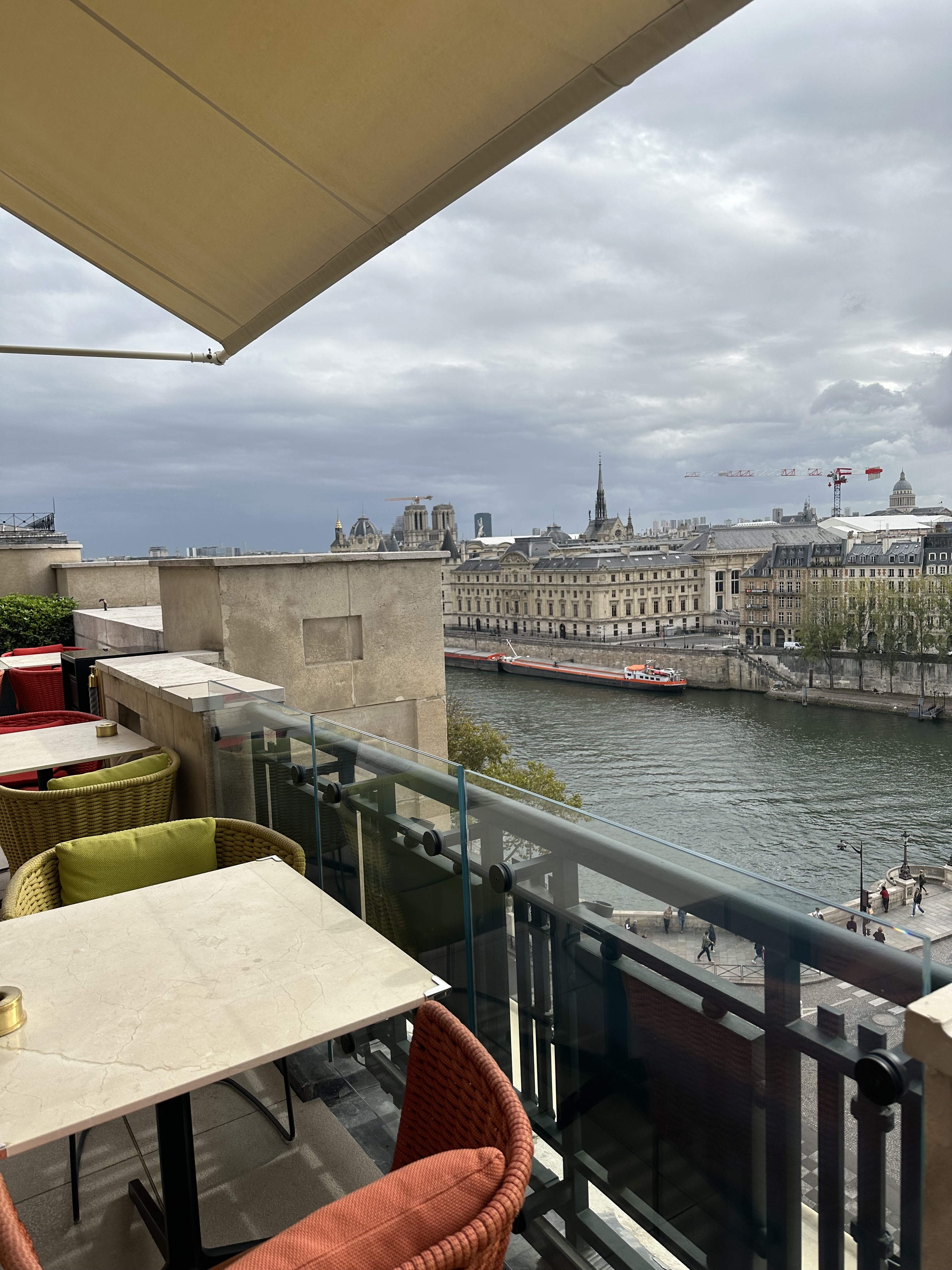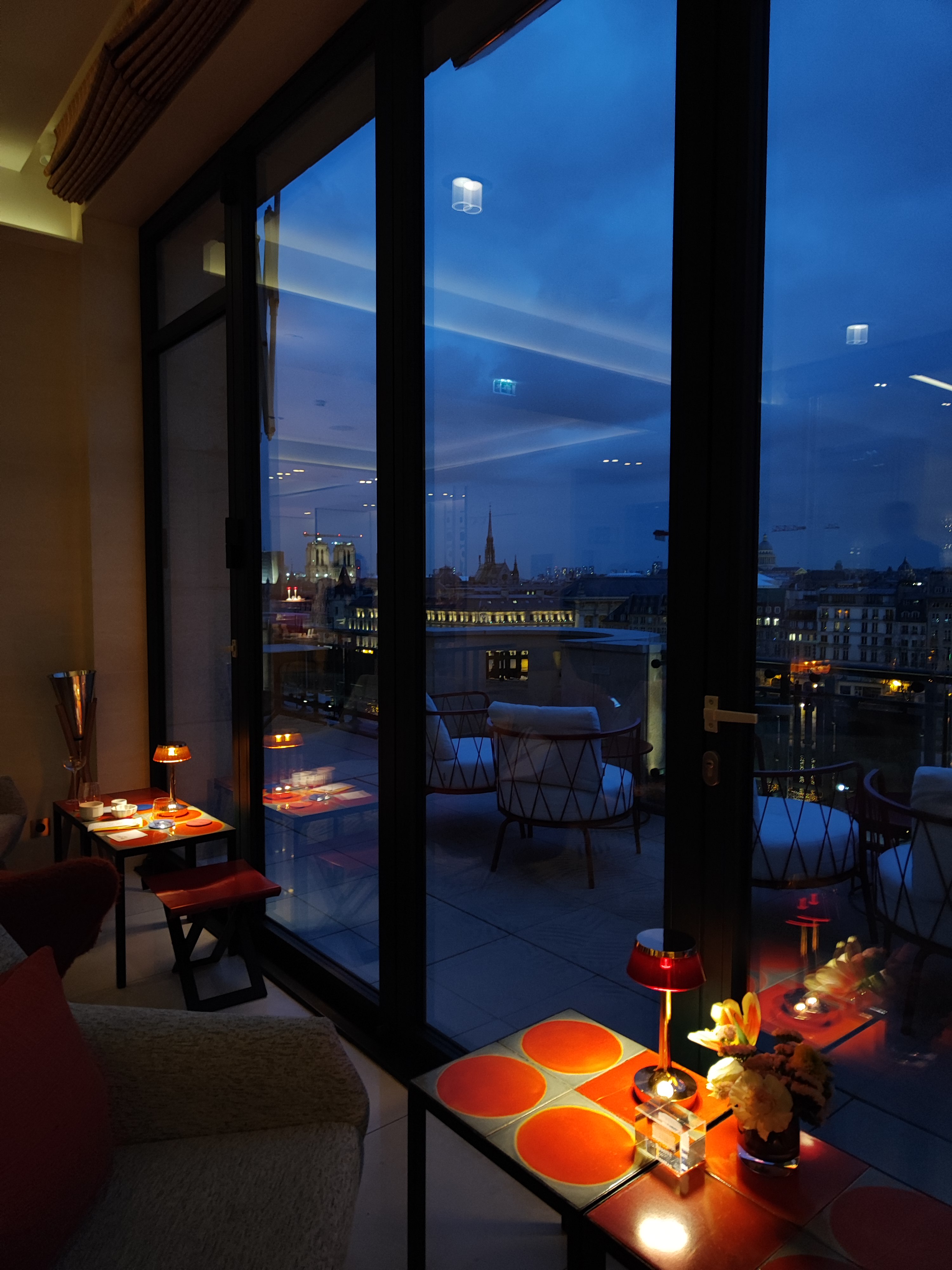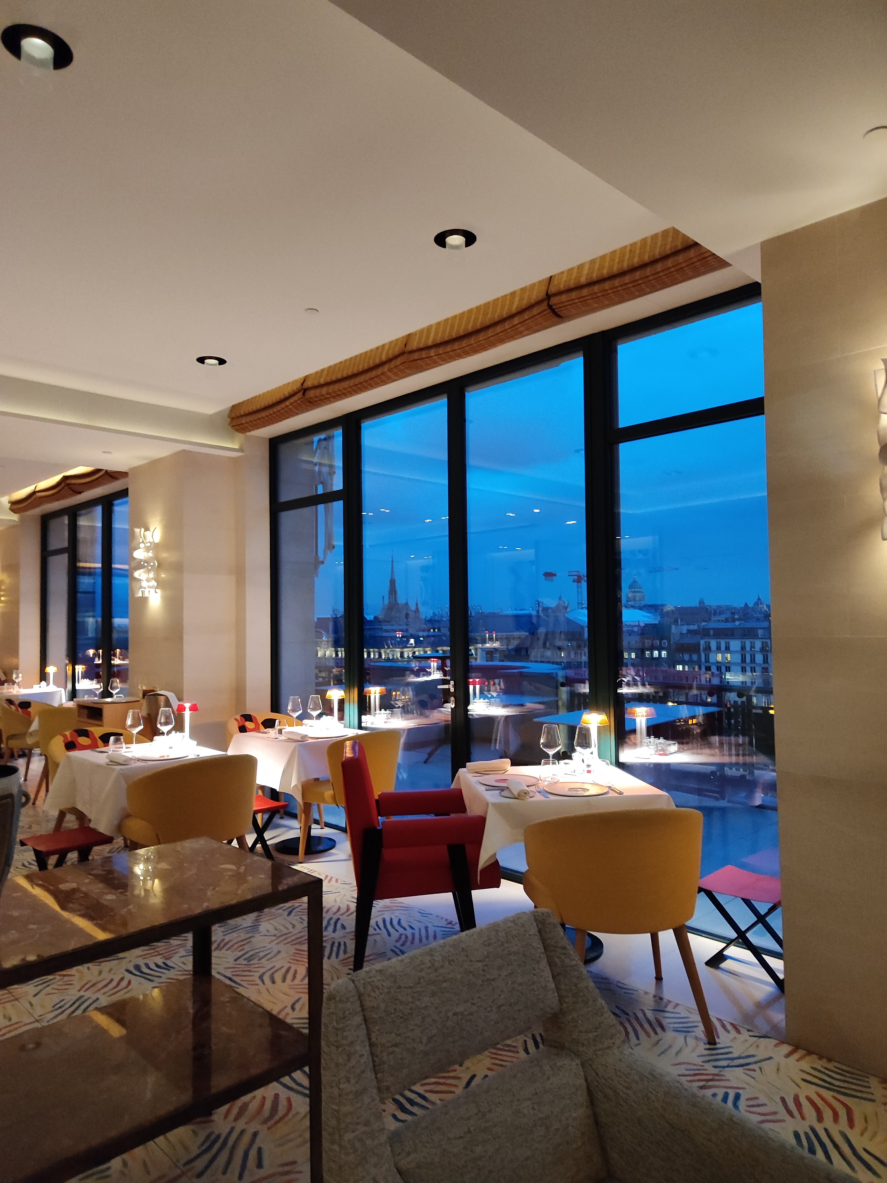 Un restaurant raffiné dans un cadre superbe : celui d'un roof top au nord de la Seine, avec vue sur la rive gauche. Sacré cœur, Sainte-Chapelle, Panthéon... Accueil feutré et effet waooo lorsqu'on pénètre dans la salle. Cuisine de haute qualité : Gravelax (Cravelax) de dorade royale, agneau rosé et sa sauce aux piquillos (cuisson de la viande : parfaite). Condrieu au verre un peu trop frais (dommage pour un tel nectar). Un quasi sans faute depuis les amuse-bouche jusqu'au café. Le pain est excellent. Le beurre divin. Le service de bonne qualité, avec un bon rythme. Nous étions dans un box ou l'on est bien assis. Si vous êtes plusieurs, vous aurez la chance d'être sur une table ronde face à la grande baie vitrée. Astuce : les box sont légèrement surélevés donc on voit parfaitement.