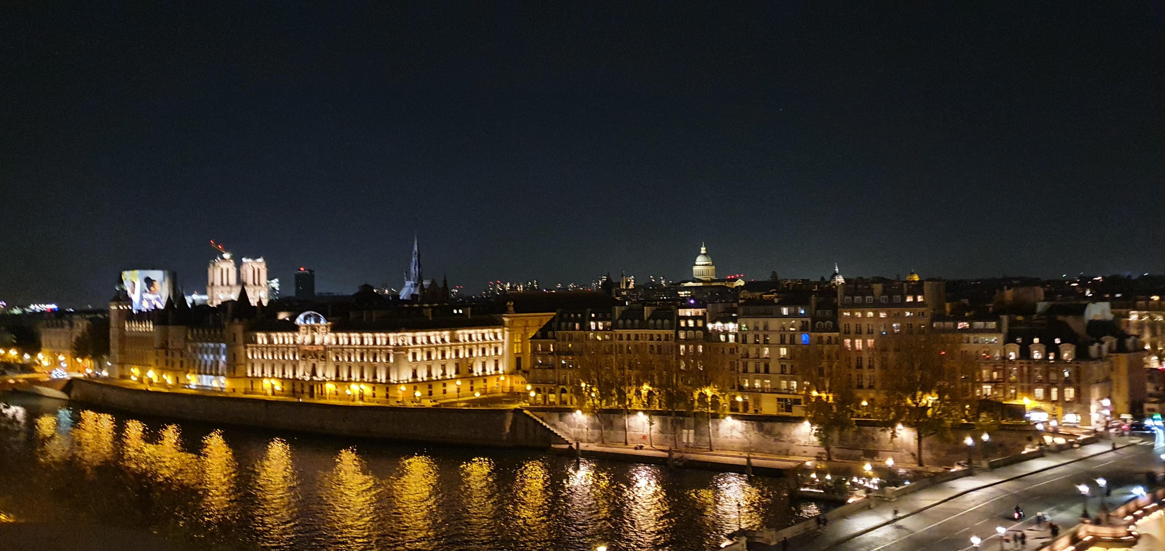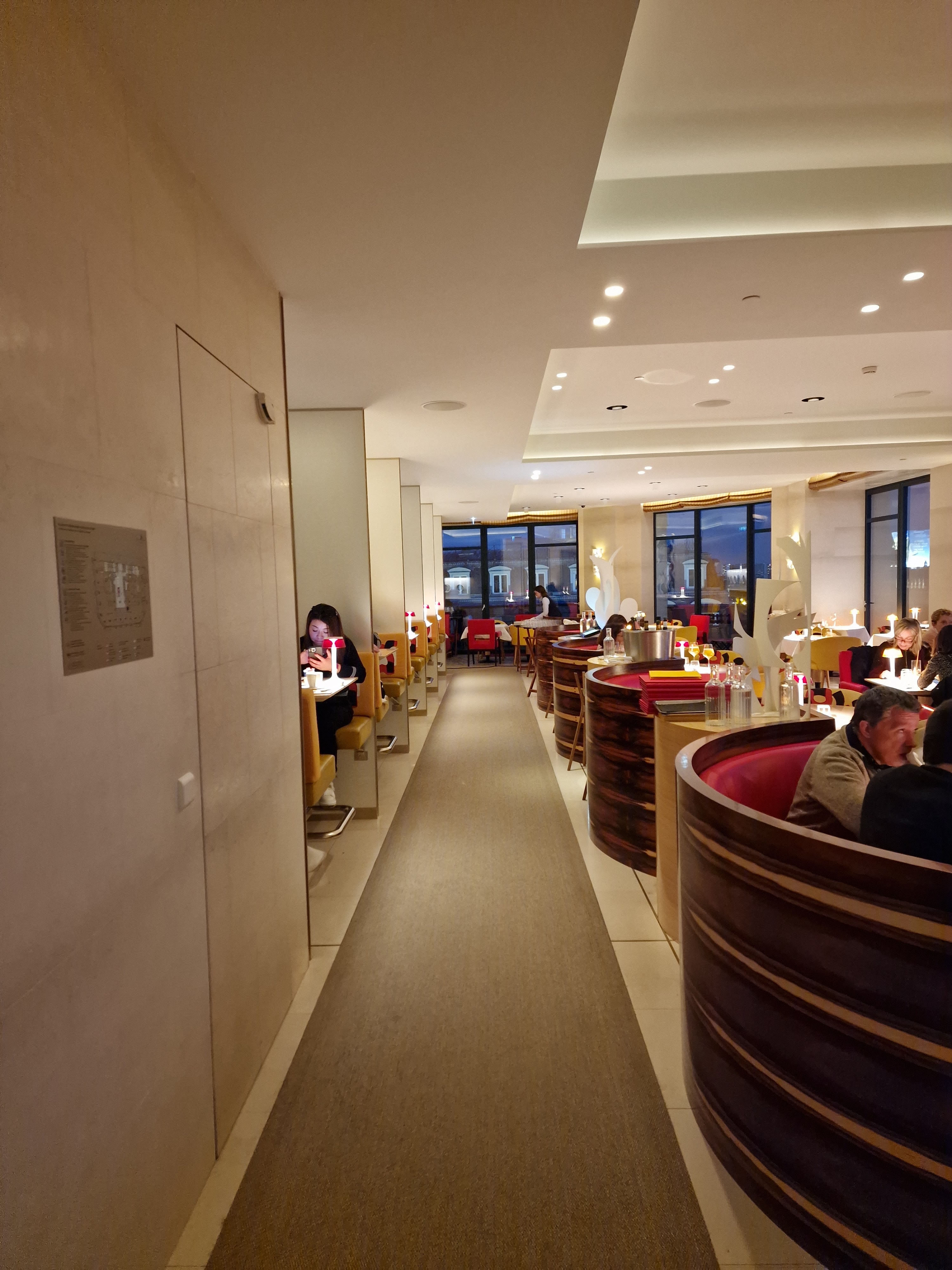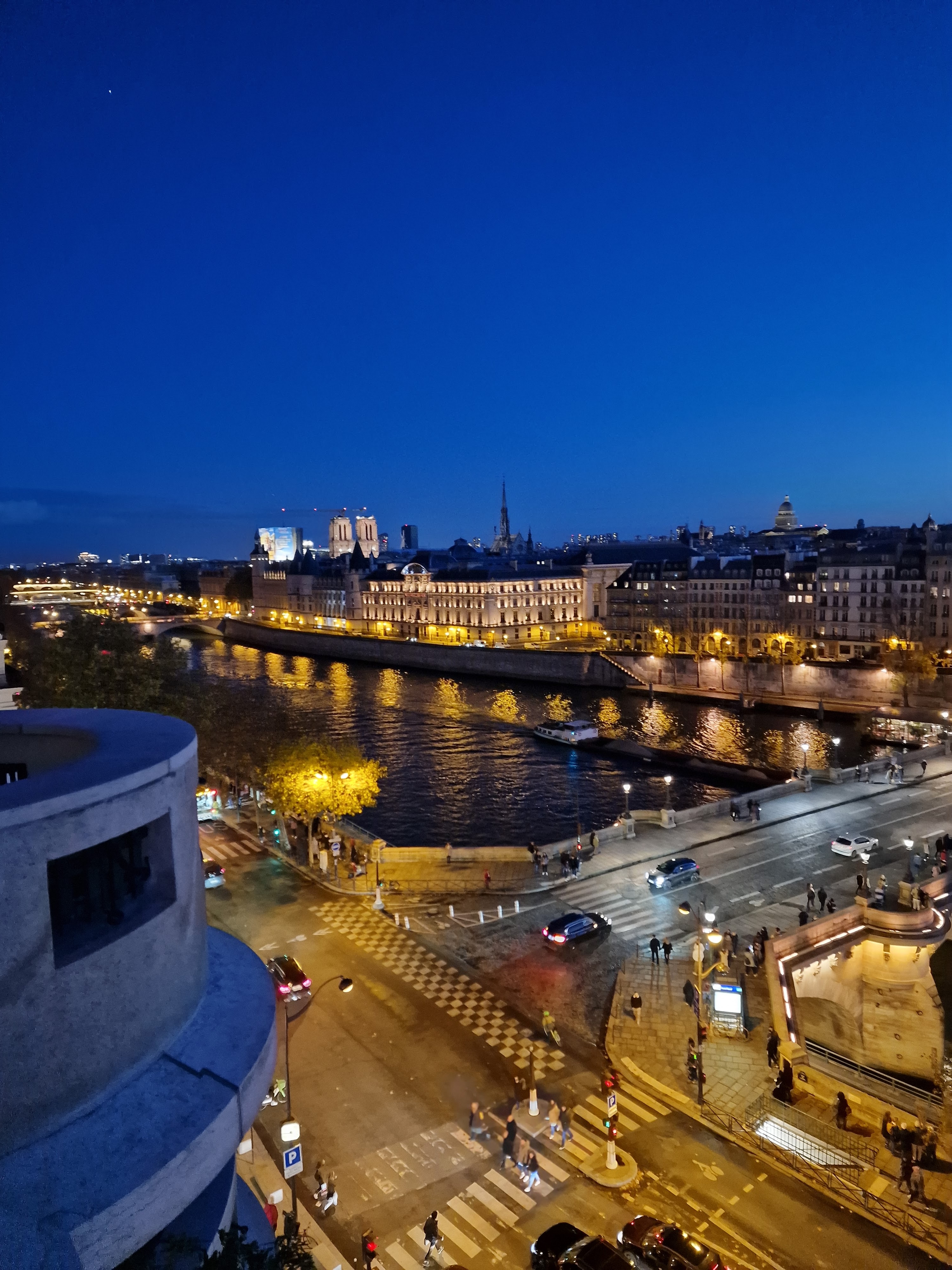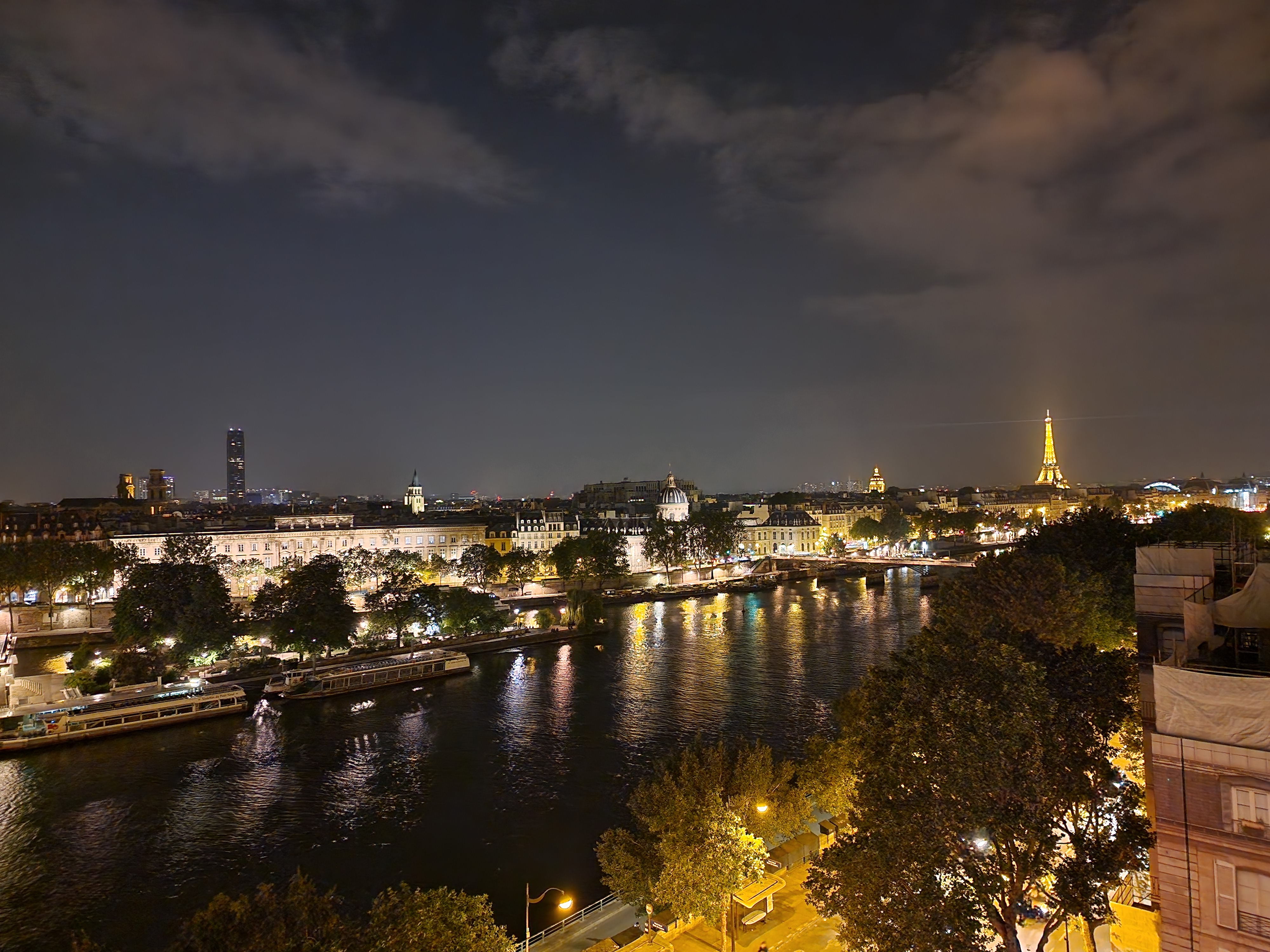 Un restaurant raffiné dans un cadre superbe : celui d'un roof top au nord de la Seine, avec vue sur la rive gauche. Sacré cœur, Sainte-Chapelle, Panthéon... Accueil feutré et effet waooo lorsqu'on pénètre dans la salle. Cuisine de haute qualité : Gravelax (Cravelax) de dorade royale, agneau rosé et sa sauce aux piquillos (cuisson de la viande : parfaite). Condrieu au verre un peu trop frais (dommage pour un tel nectar). Un quasi sans faute depuis les amuse-bouche jusqu'au café. Le pain est excellent. Le beurre divin. Le service de bonne qualité, avec un bon rythme. Nous étions dans un box ou l'on est bien assis. Si vous êtes plusieurs, vous aurez la chance d'être sur une table ronde face à la grande baie vitrée. Astuce : les box sont légèrement surélevés donc on voit parfaitement.