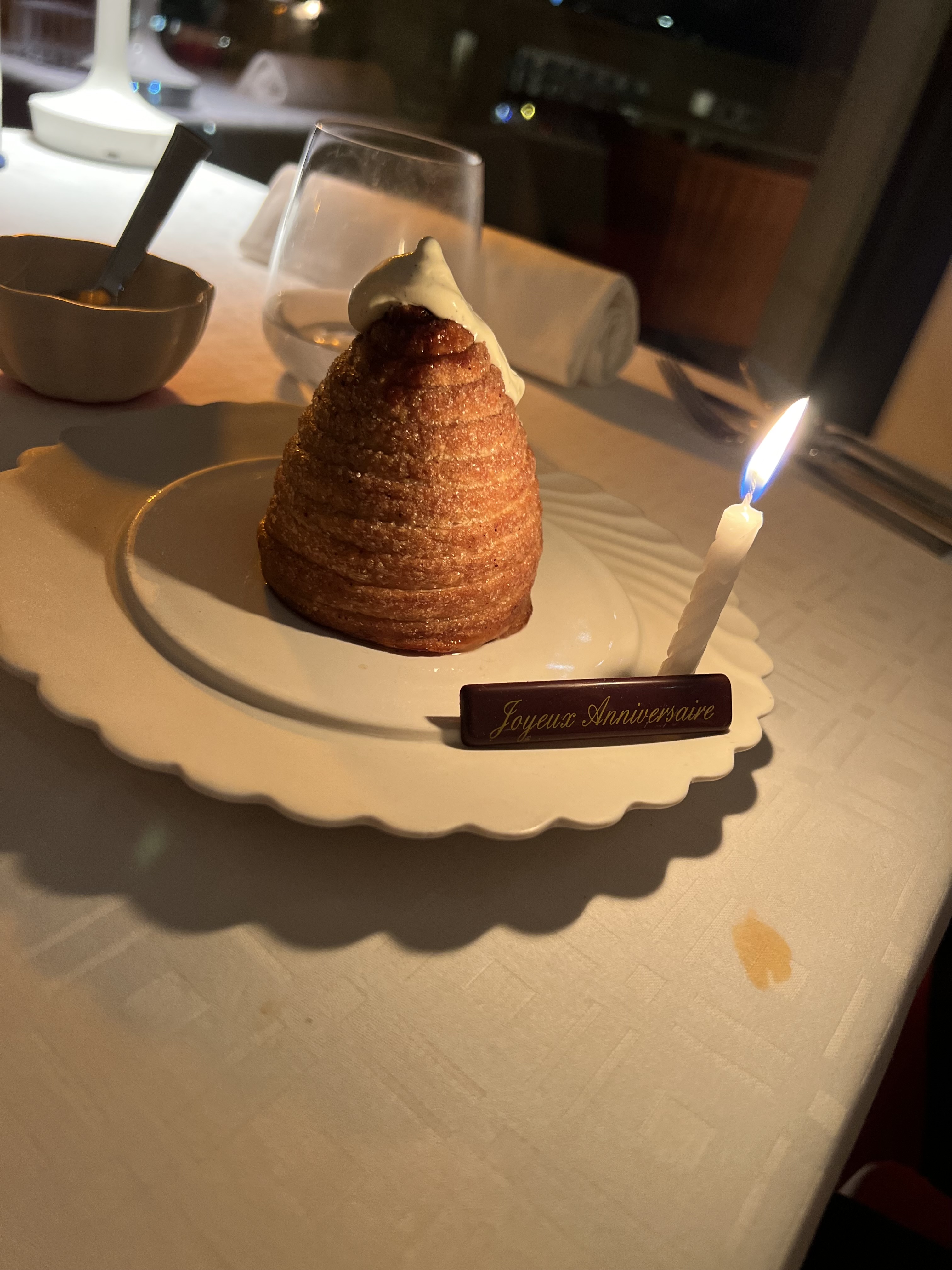 Magnifique expérience pour un anniversaire surprise. Le cadre est somptueux, de l'entrée au dessert nous nous sommes régalés. Le service était très bien, aux petits soins sans trop en faire. A refaire le soir pour profiter de Paris illuminé. Le seul bémol, et qui me fait mettre 4 étoiles et non 5, j'ai réservé il y a un moment, en indiquant que c'était pour un anniversaire surprise et que je souhaitais une table très bien située. Je pense que ce ne fut pas le cas car d autres tables étaient vraiment face à la baie vitrée ce qui aurait rendue le moment encore plus inoubliable. Hormis cela , je recommande vivement ce lieu