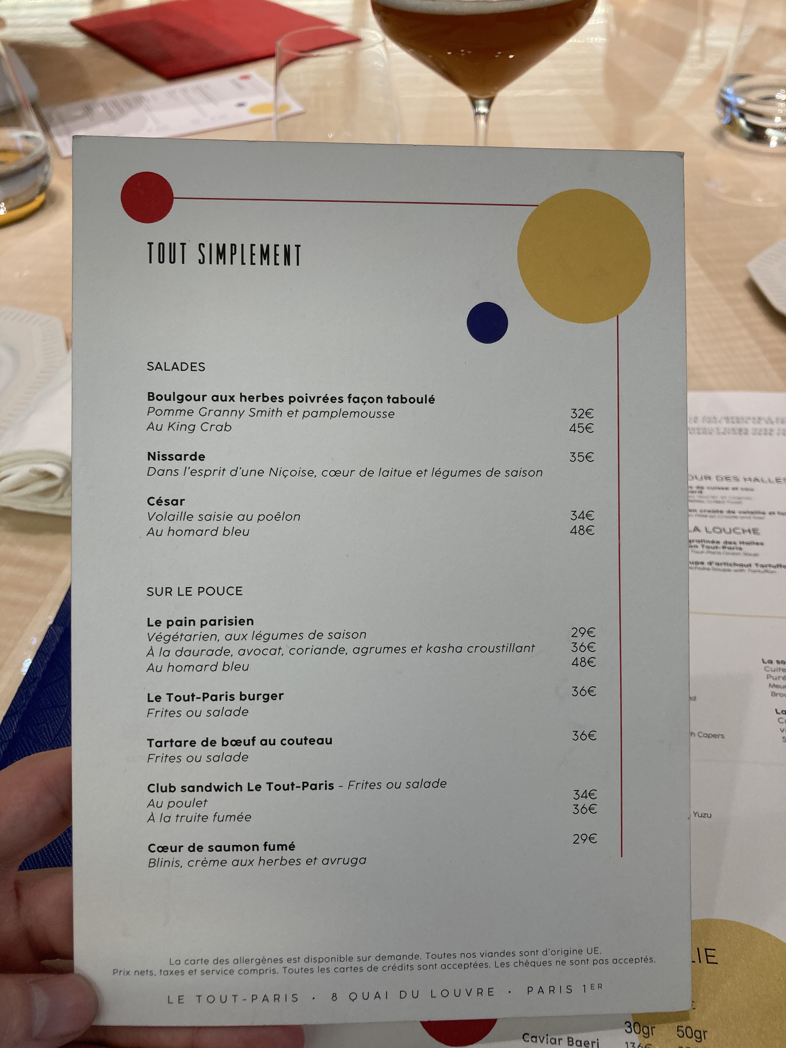 Mardi 05.10.2021 : déjeuner à la brasserie LE TOUT PARIS au sein de l’hôtel Cheval Blanc Paris. 2 couverts 205 €uros (arrivée 13h départ 14h30). Service à table assuré de « main de maître » par un jeune chef de rang Guillaume B. (136) éduqué à Le Bristol^^. Ce n'est qu'un avis personnel mais je n'ai pas été conquis par cette nouvelle brasserie. Je vais en revanche prochainement tester l’autre restaurant italien de l’hôtel « LE LANGOSTERIA » je verrai bien. Voir mon post complet sur TripAdvisor.