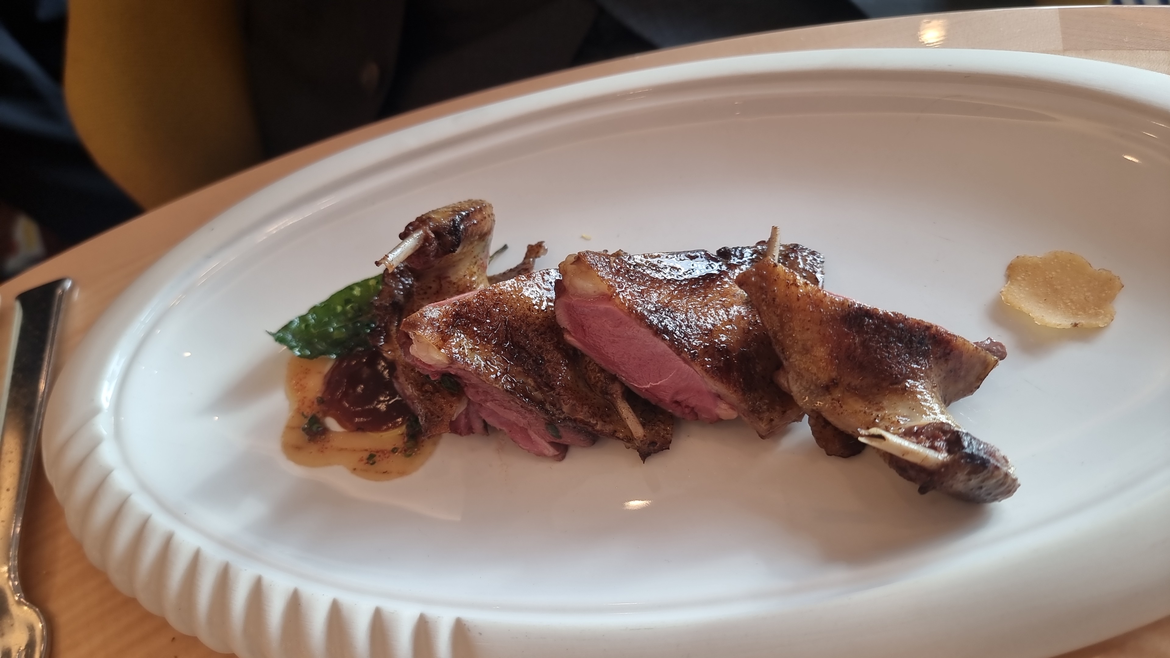 Les plats étaient divinement bons. Sans mentir, le pigeon en crapaudine était de loin le meilleur que j'ai pu manger jusqu'ici. Une cuisson parfaitement maîtrisée sans parler des sauces. Le vin était également délicieux avec un bouquet très expressif. L'accueil depuis le rez-de-chaussée jusqu'à l'entrée du restaurant a instauré une ambiance très agréable. Cependant, je relève deux points qui viennent ternir cette première partie fabuleuse. La personne en charge de notre table avait une élocution très faible. Nous avons dû à plusieurs reprises demander à d'autres personnes car nous n'avions pas compris lorsqu'il parlait. Et deuxièmement et sûrement là le point qui m'a réellement contrarié, j'ai retrouvé un long morceau de film plastique dans mon fromage. Je l'ai notifié au personnel et....c'est tout? Je m'attendais au minimum à un mot si ce n'est à un geste peut-être? Cela n'enlève pas le travail de la cuisine qui a été formidable tout au long de cette soirée !