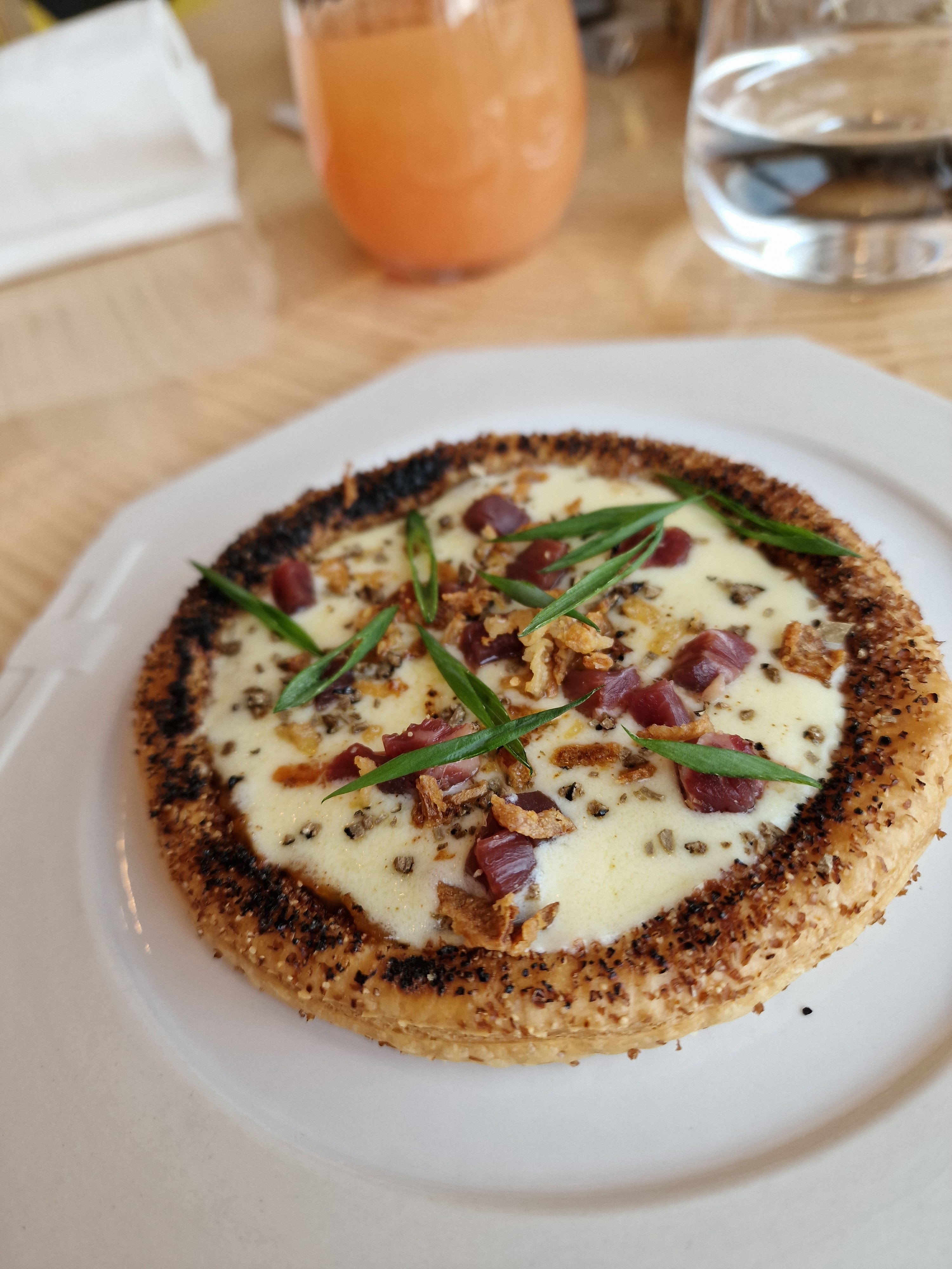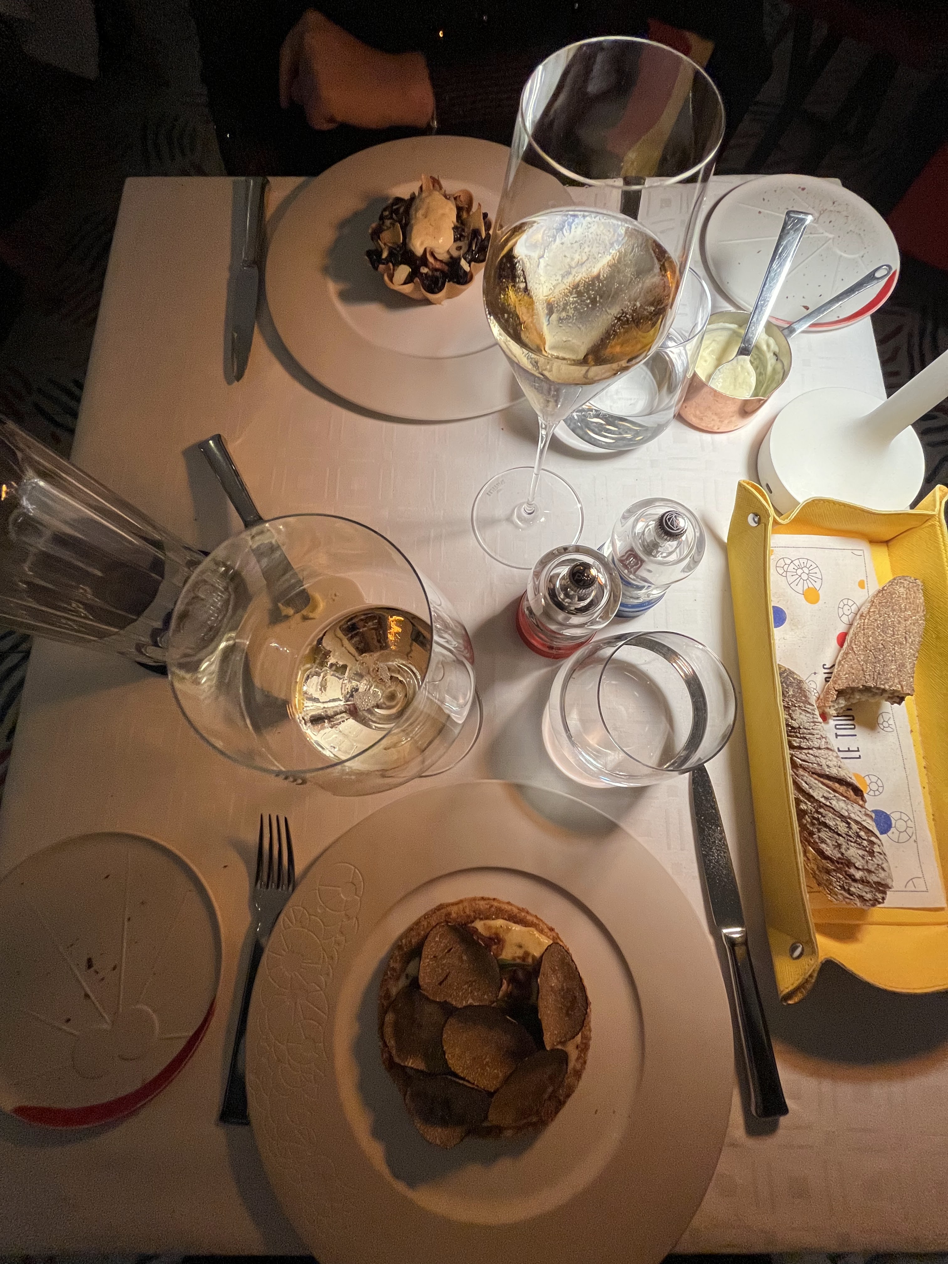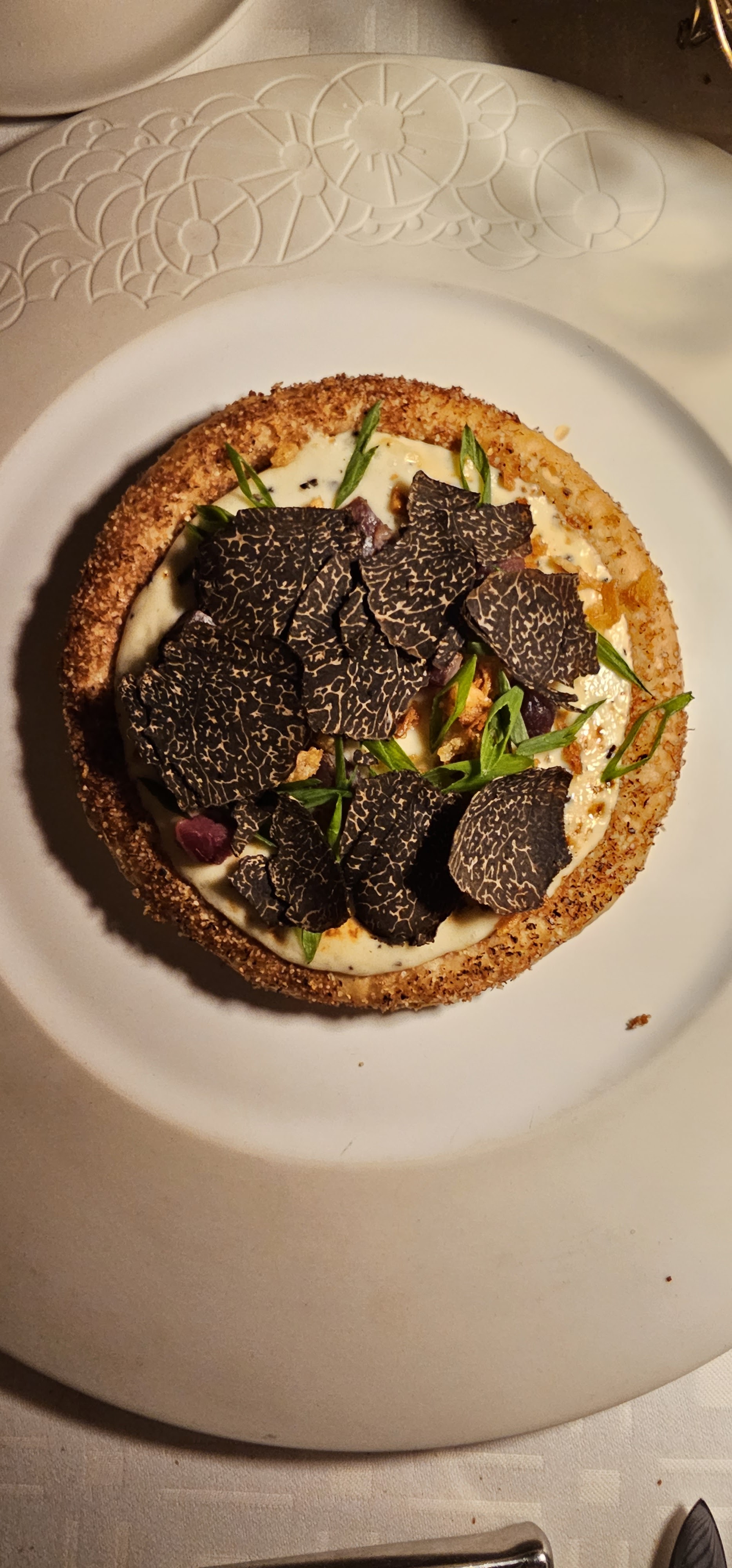 Une expérience inoubliable avec un service irréprochable. Tellement rare de nos jours. Tous les plats étaient divins et appréciés de la table. Sauf un la flamekueche au truffe ou le fromage bien trop fort prend Tellement le dessus sur la truffe qu'elle disparaît totalement. Une erreur de conception de plat assez incompréhensible d'ailleurs vu la qualité des autres. Alors oui les tarifs sont élevés, mais c'est cela l'excellence !!