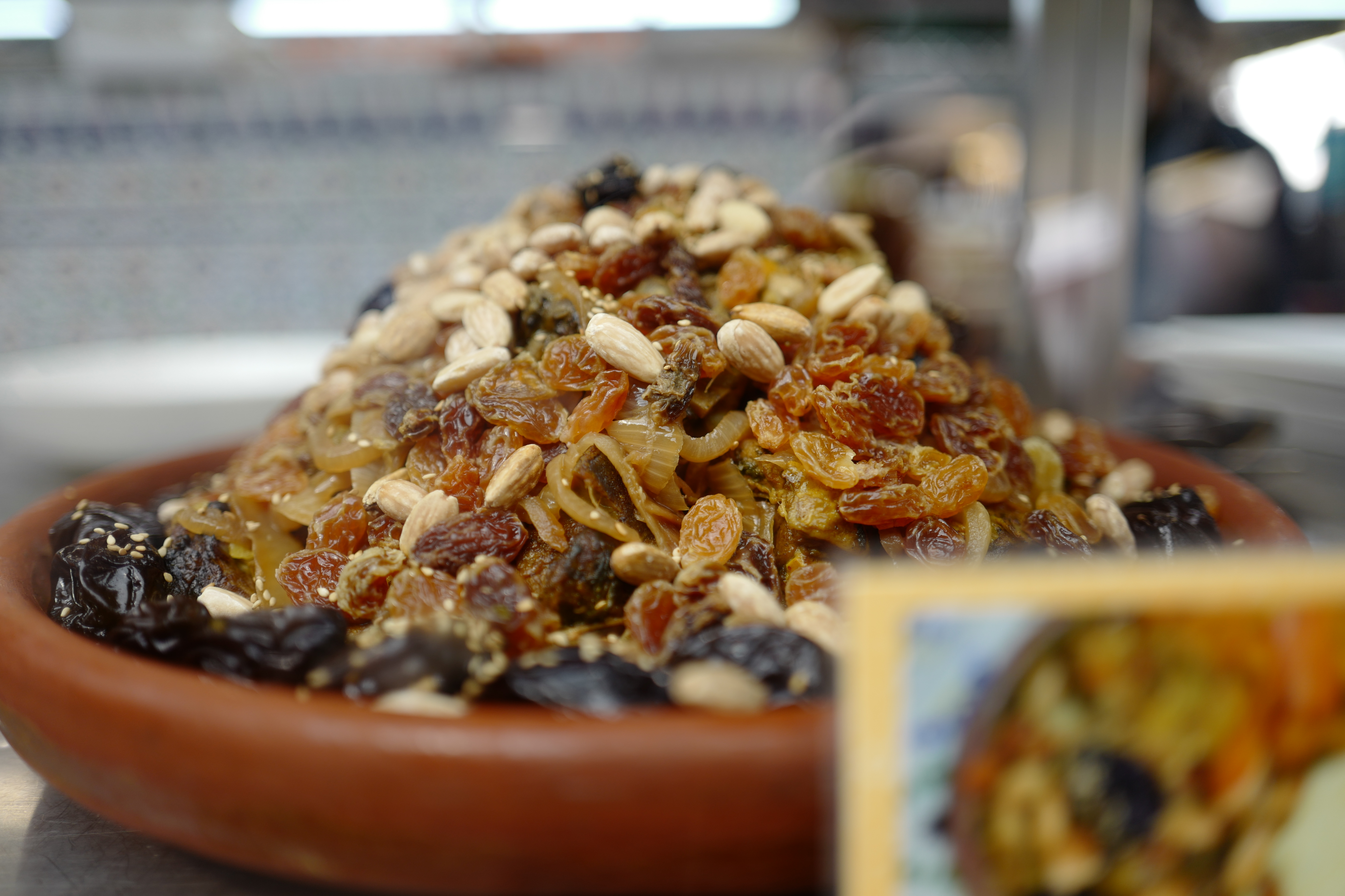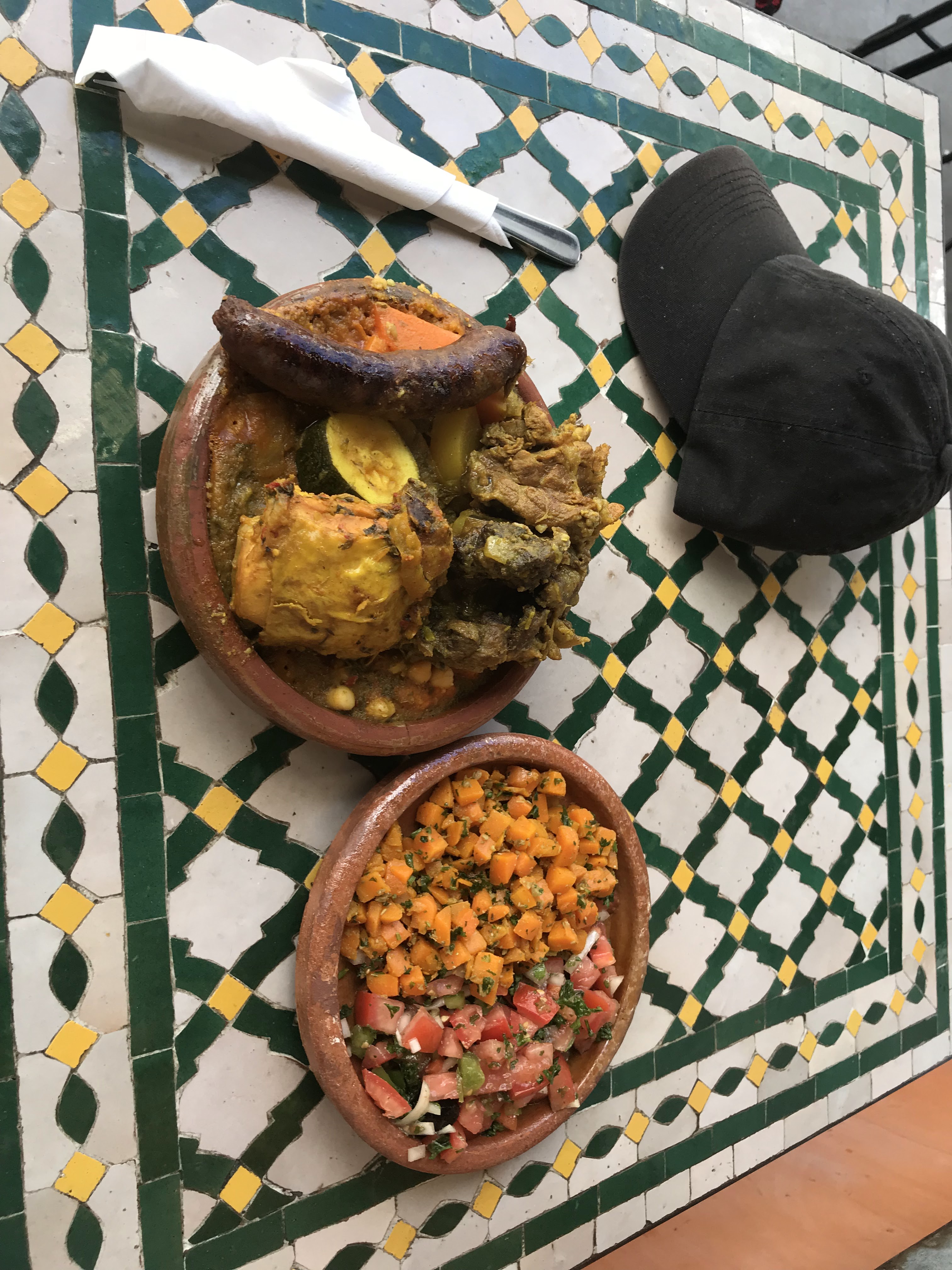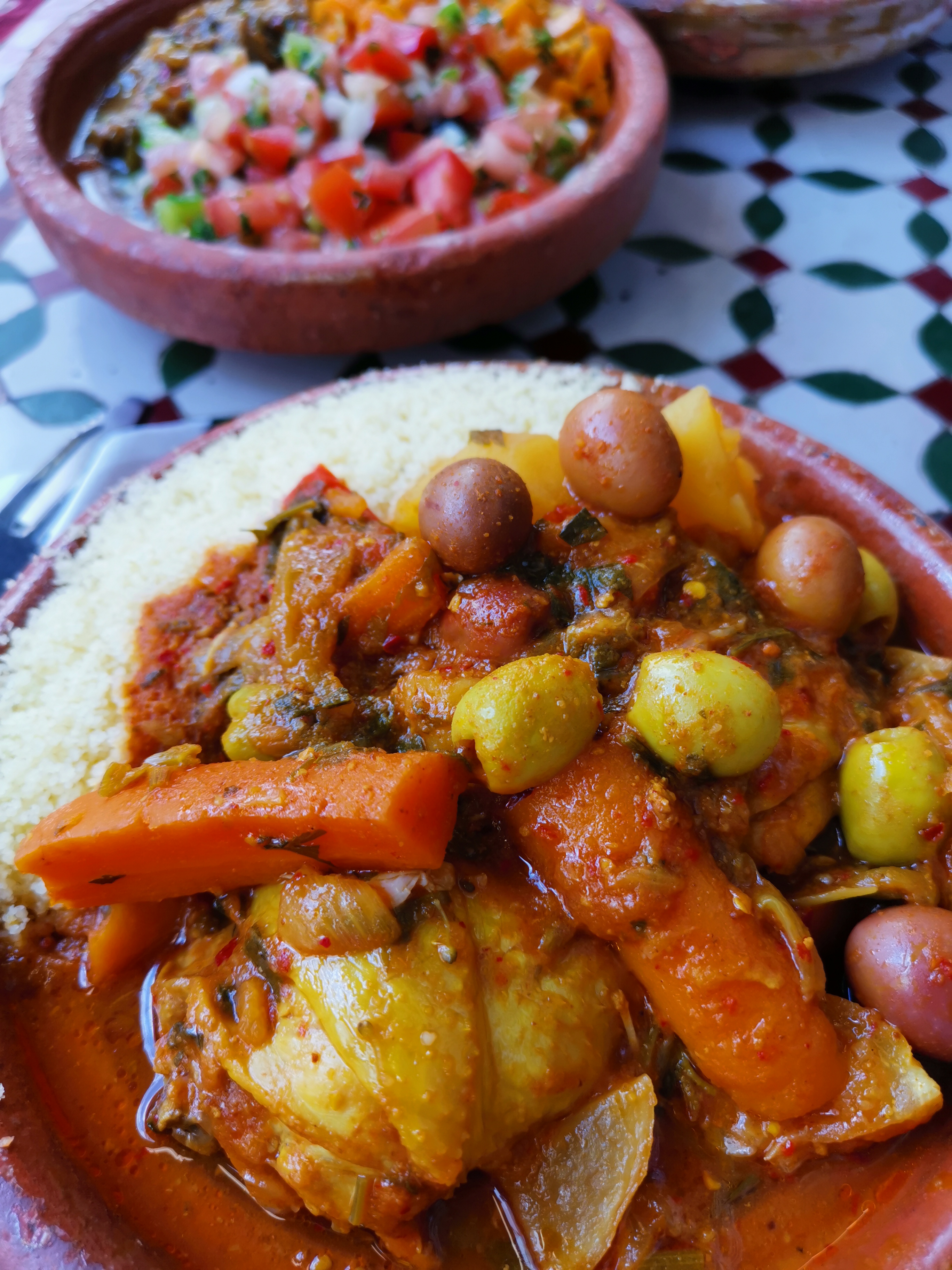 Merveilleuse cuisine marocaine dans un beau marché. Le tajine de poulet aux olives et citron salé était divin.