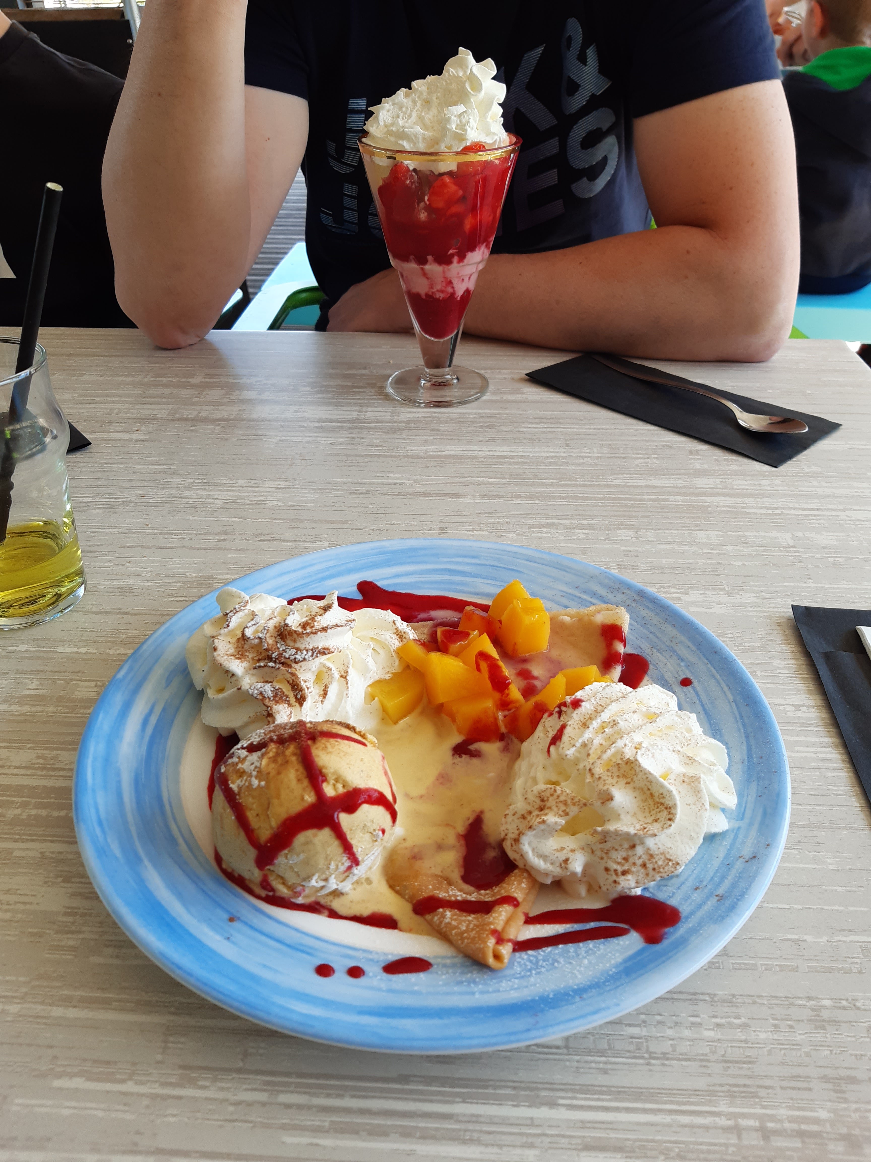 Quelle déception La pizza, sans plus, mais ok, c'est le mois d'août. Par contre… la crêpe, quelle mauvaise idée. Immangeable, comme du plastique. Pratiquement impossible à la couper au couteau. Après réclamation, la serveuse avoue que ce sont surement des crêpes de la veille (oups !!) et nous propose gentiment de nous les changer et là surprise, même type de crêpe. Une honte de crêpe qui reste dans son plat. Nouvelle réclamation et là elle avoue qu’elle ne doit pas être mauvaise, car el est du matin (je dîne à 20h00…) Je suis scandalisé et le fais savoir et de surcroit, seront facturées. Pourquoi ne pas nous avoir proposer une alternative sachant que les nouvelles crêpes sont du même style et ne devraient pas nous satisfaire. Un réel manque de respect et un commentaire culoté m’indiquant que mon collègue l’a terminée et donc mangeable (il est vrai qu’avec de la chantilly, ça peut mieux passer, mais moi au sucre, imaginez, dure, sèche, froide…) et à la différence qu’ils étaient allemands et pas forcément spécialistes en la matière.