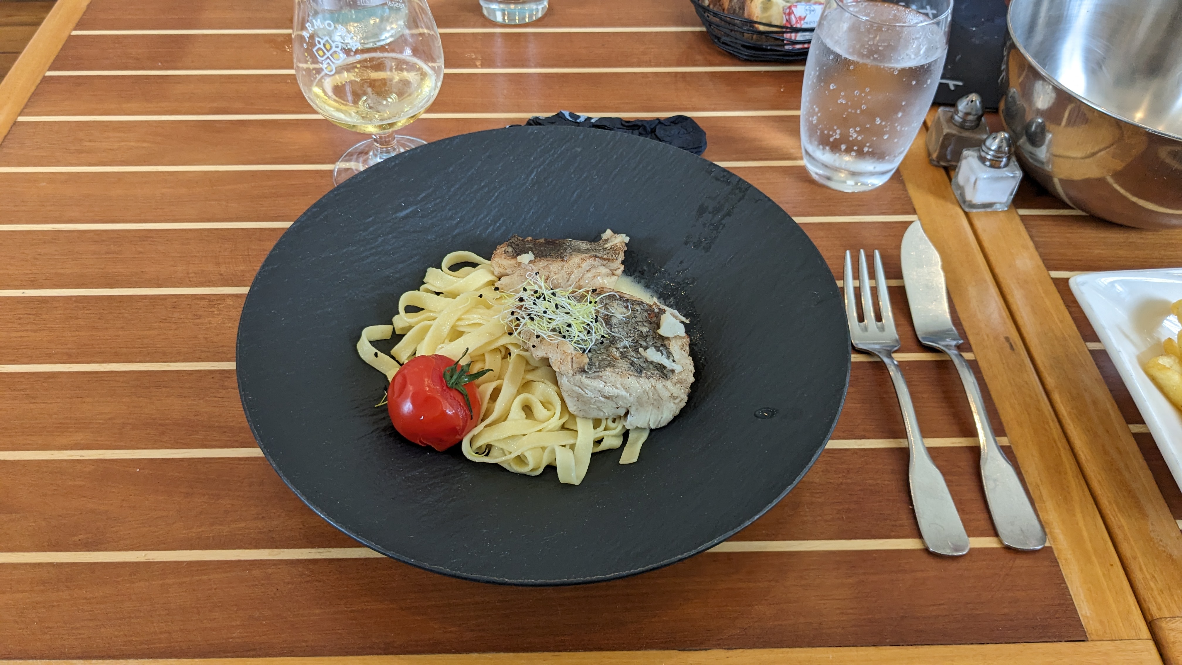 Lieu jaune et pâtes à l'encre de seiche arrivées tièdes, réchauffées probablement au micro-ondes, trop cuites et sans goût, quant à la sauce, inexistante... Quant à la réaction du service à ma remarque, à la limite du dédain. Dommage, pour les 26 euros, c'est la première fois que j'ai l'impression en Bretagne d'être pris dans un piège à touristes.... La galette végétarienne de mon épouse était bonne....