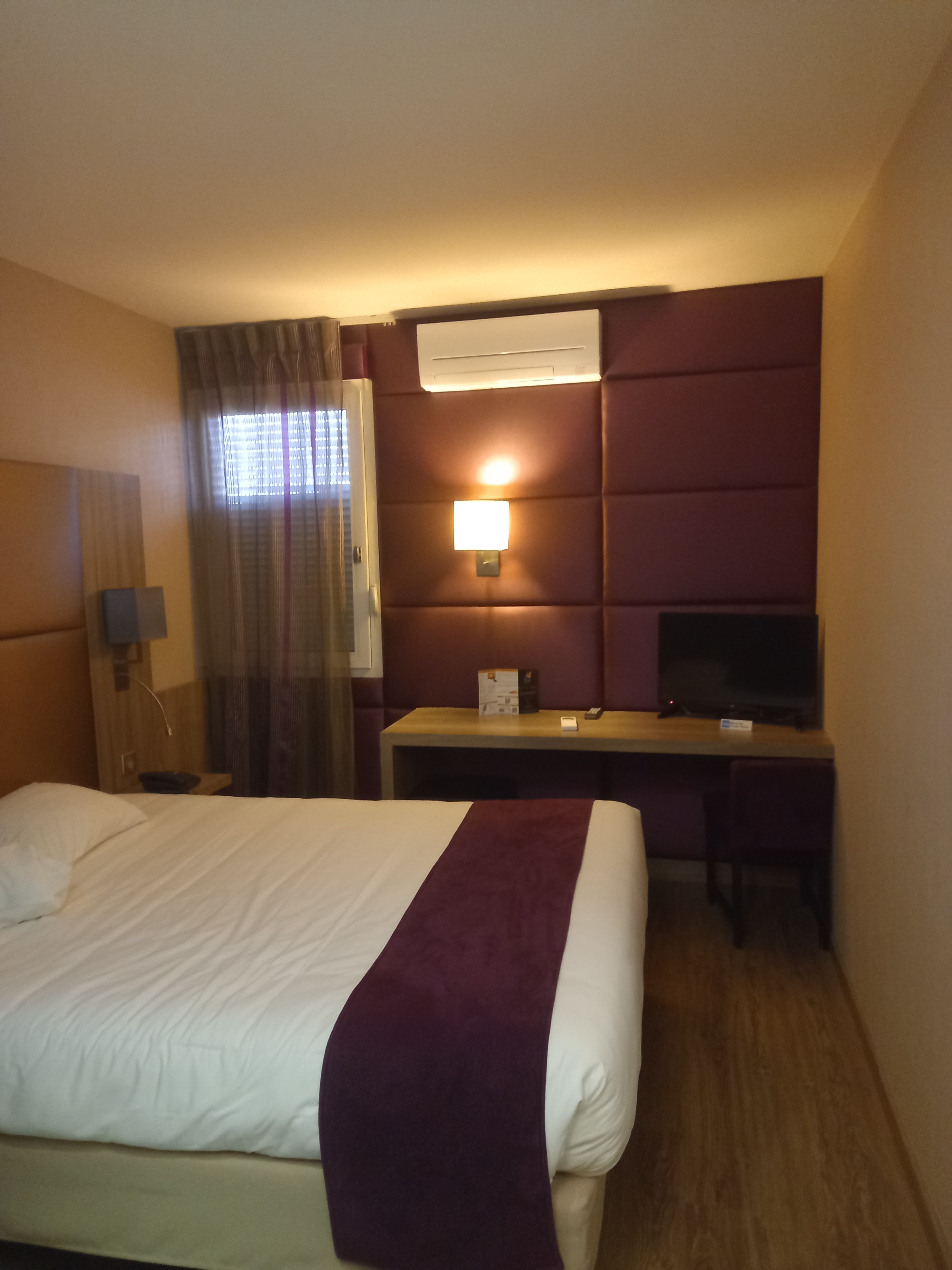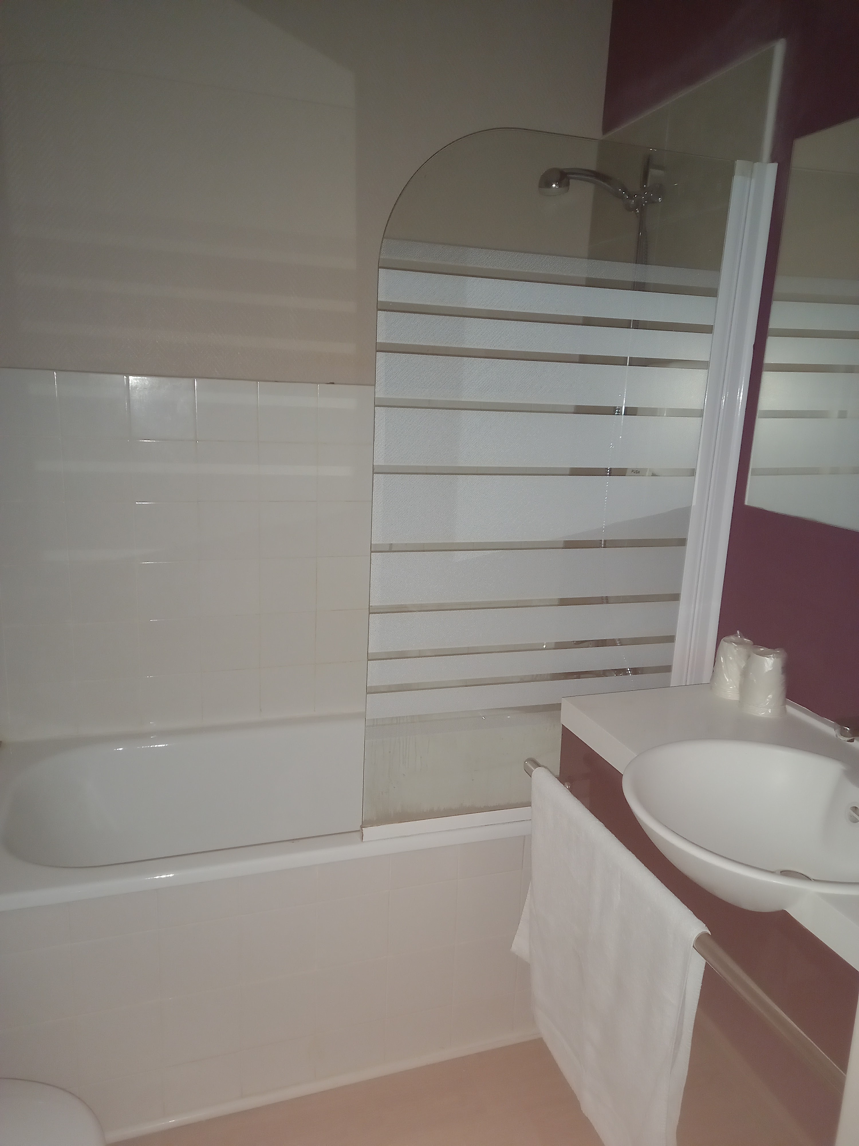 Ventilation salle de bain en panne tête de lit dégradée chambre sombre couleur lie de vin tele toute petit il manquait un jeu de serviette. Deco vieillotte. Rapport qualité prix cher pour la prestation