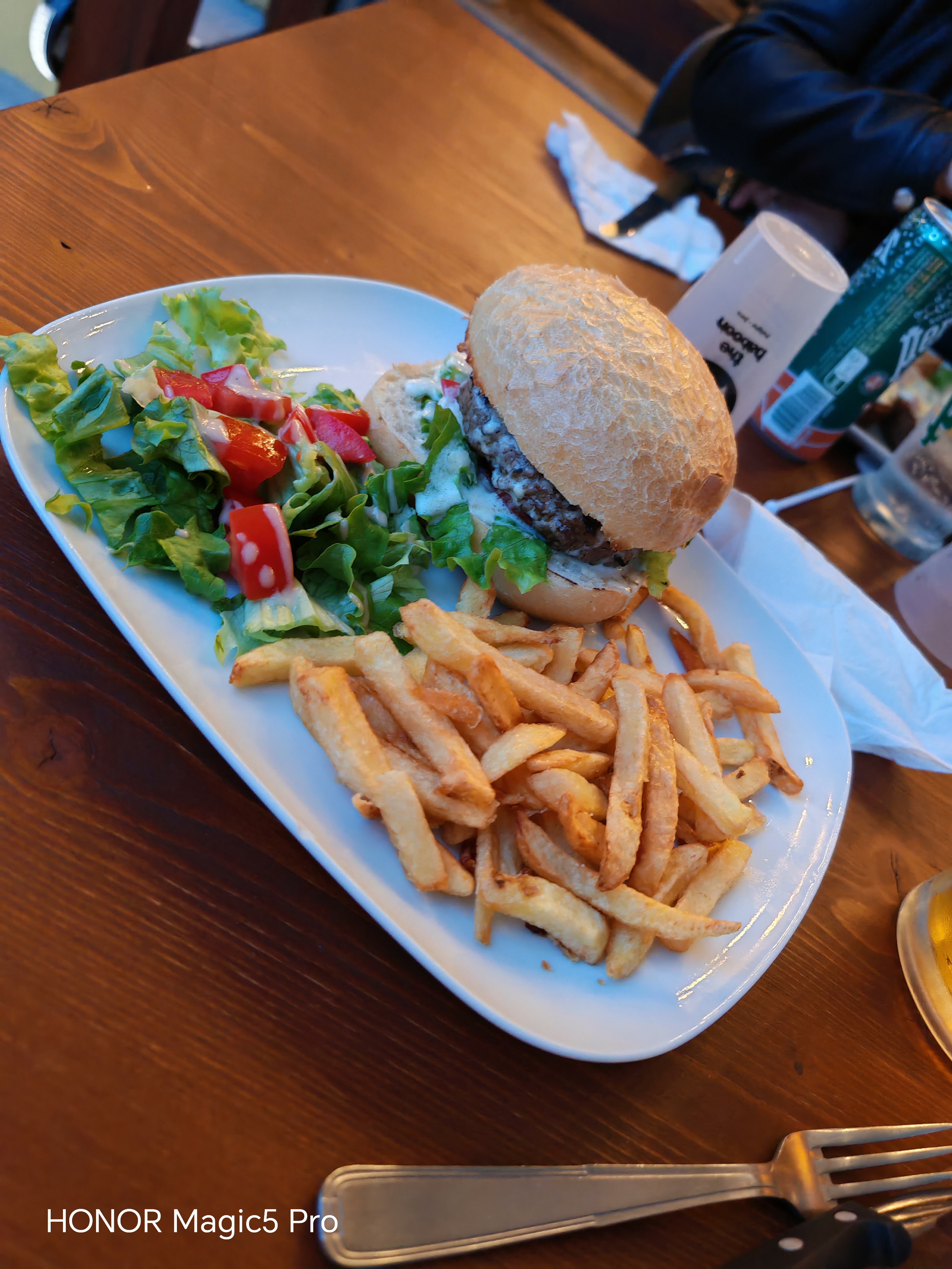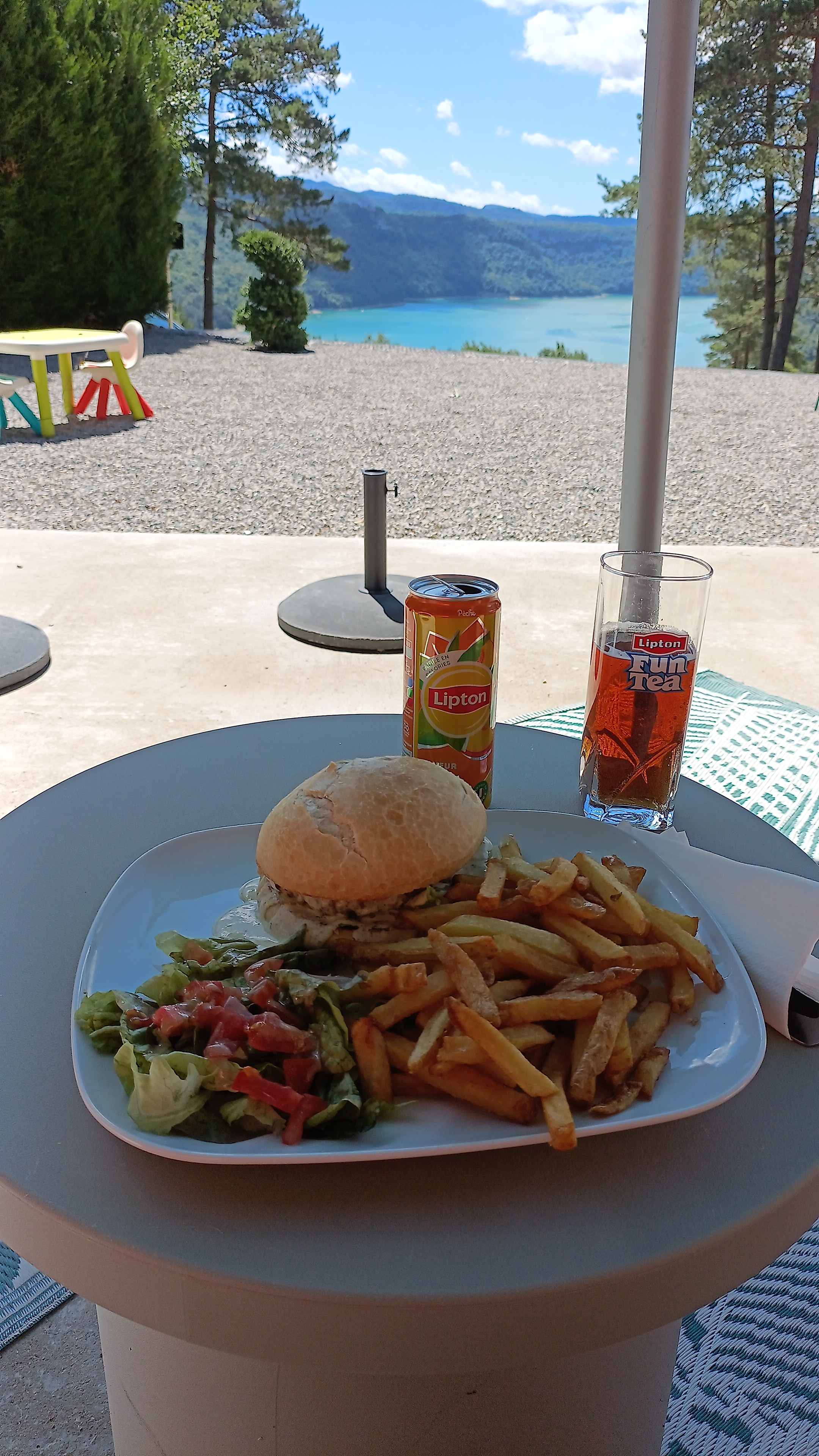 De passage express, petit arrêt pour un dîner solo face au lac. J’ai rarement (jamais…) été aussi bien accueillie lorsque je demande une alternative au burger pour qu’il soit totalement végétal. Je me suis vu apporter une énorme assiette avec un pain spécial rempli de bon légumes frais, sauce vinaigrette, salade avec émincés de tomate, et les frites copieusement servies et délicieuses ! Mes remerciements au service m’ont valu un agréable « avec plaisir, nous sommes là pour ça !» Merci aussi pour le spot van 🙏🏼!