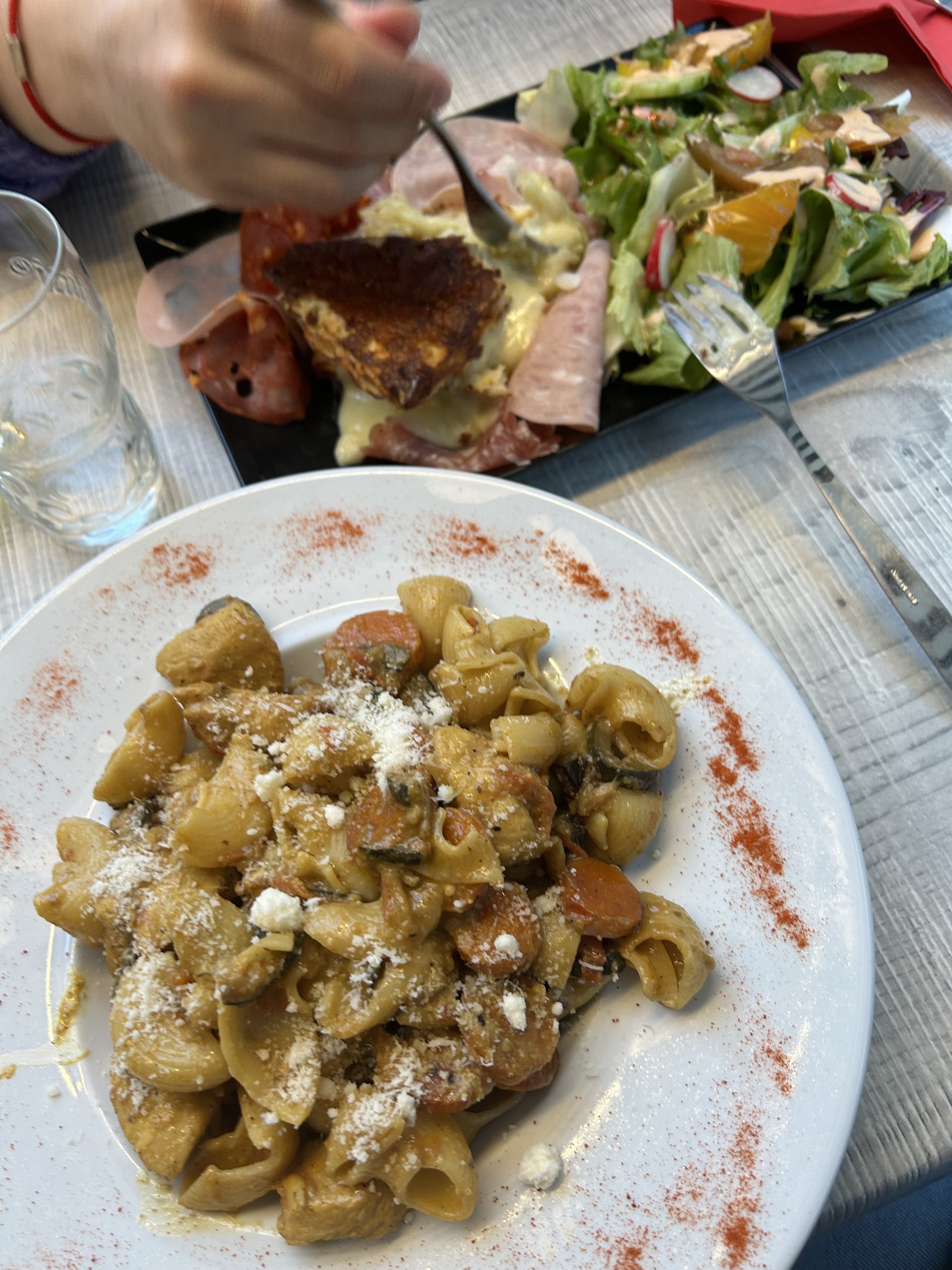 Menu du jour servi le soir (plat dessert) avec bonne humeur assurée par le patron cuistot serveur ! Et ce soir c'était camembert au four sur une assiette de salade, charcuterie et pommes de terre, arrosé d'un demi de rouge (forcément bon ici), un limoncello après le dessert. Y'avait plus qu'à profiter 🤩
