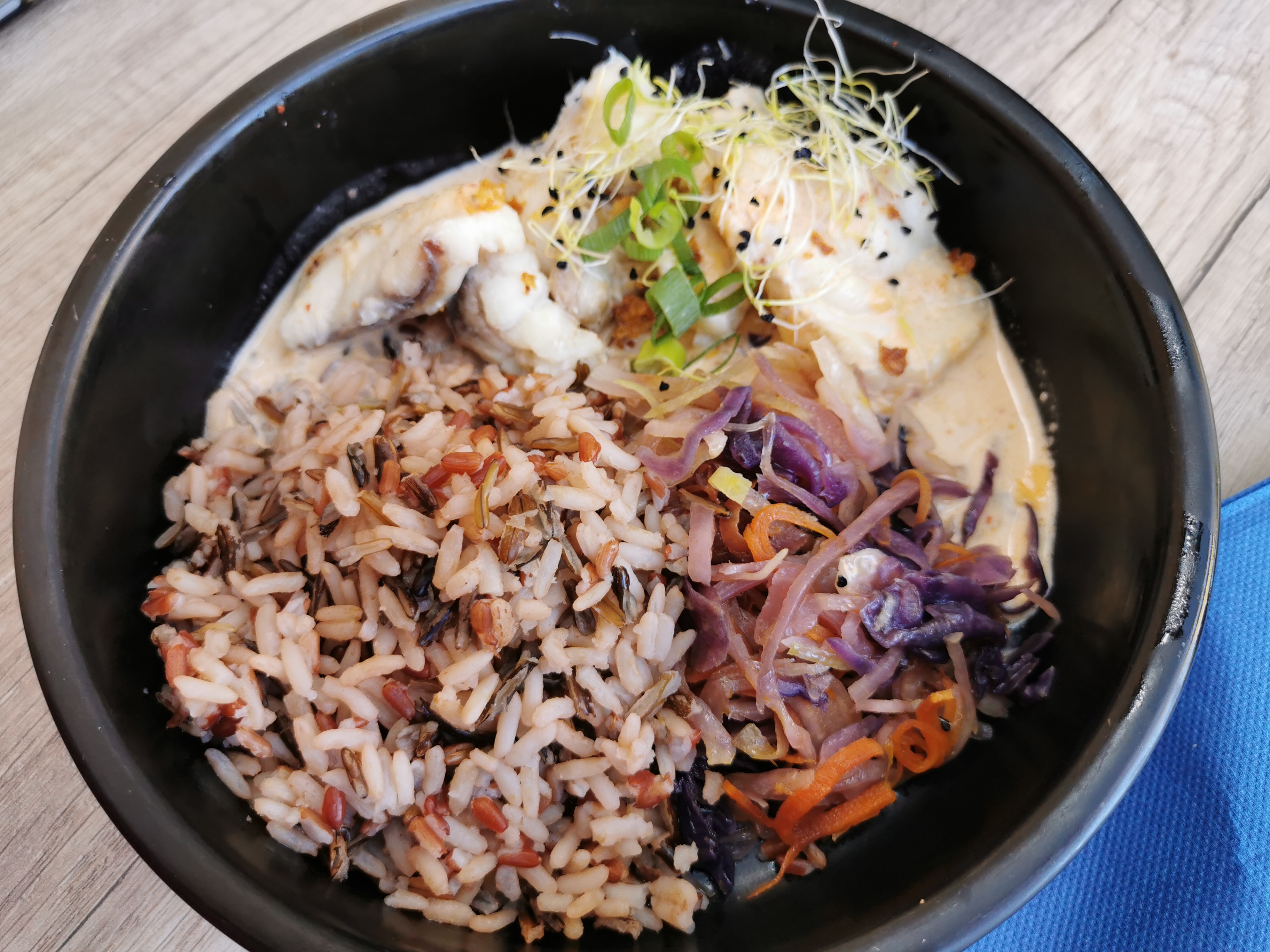 Très bon service, rapide et efficace. Ambiance sympa et tranquille. Bonne cuisine: lotte roulée au lard et espadon au curry, l'amok de 3 poissons (truite, lotte, espadon) aurait pu être bon si la sauce avait été moins sucrée. Le vin rouge bio du Larzac était excellent.