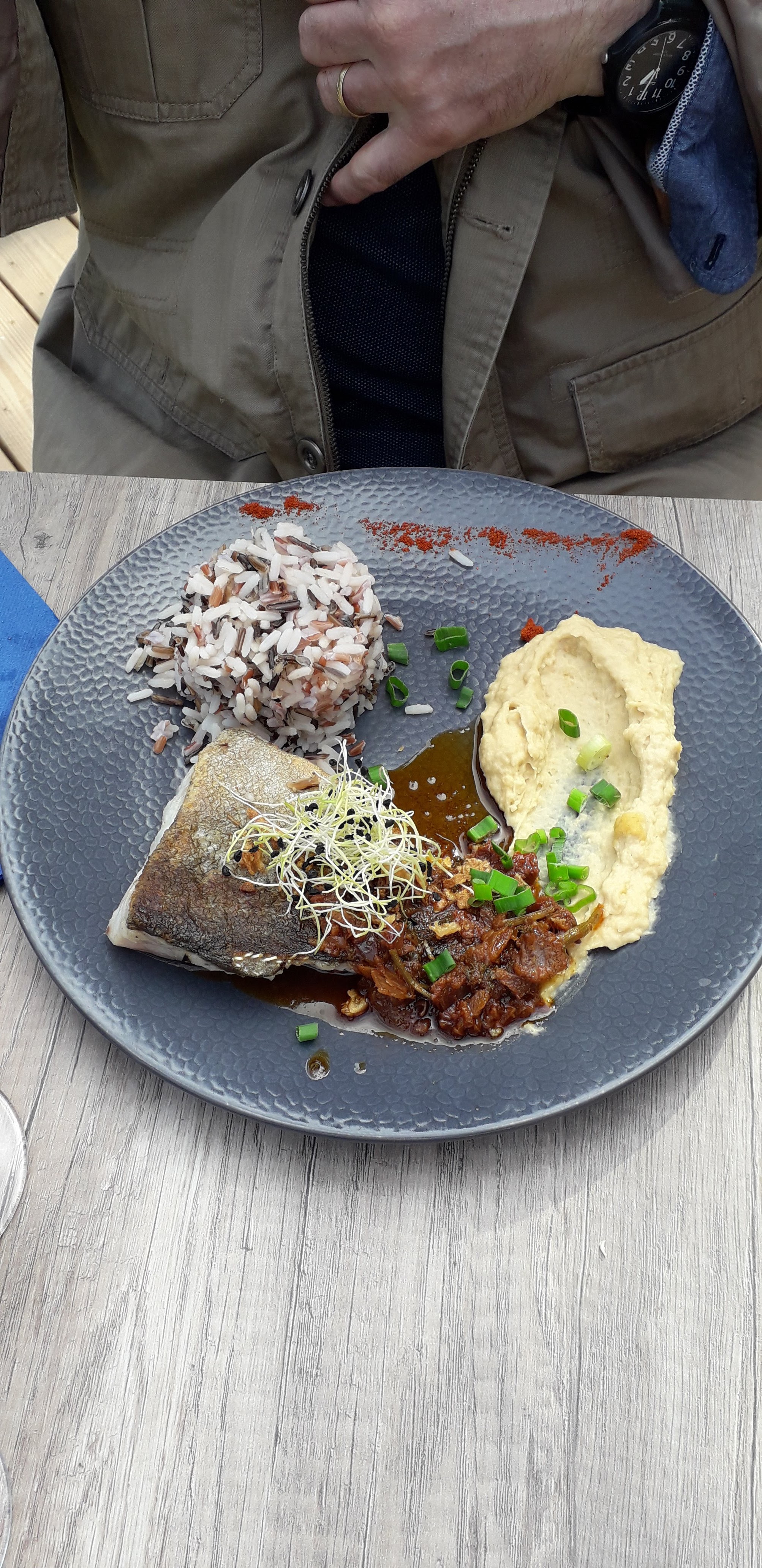 Une vue sublime si l’on réserve la bonne place la veille pour le lendemain. Globalement notre plat était bon mais bien trop peu de poisson et de quantité au vu du prix assez élevé du plat. Un tout petit pot de riz et 4 petits bouts de lotte. Rapport qualité prix de ce fait trop élevé je trouve.