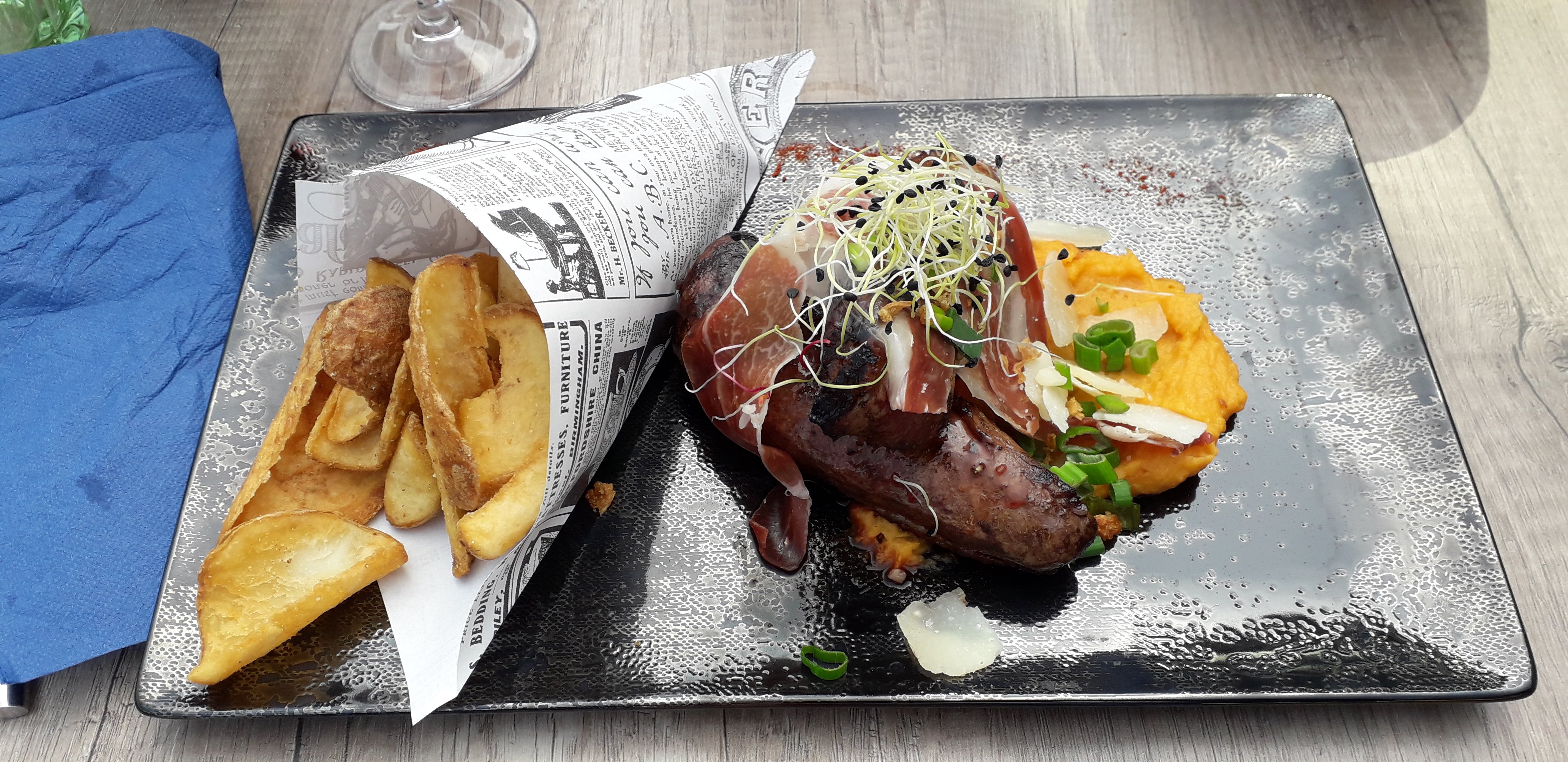 Content d'être tombé sur ce restaurant à conseiller vivement !! Ou l'on sert des frites fraîches. C'est d'une rareté dans le monde de la restauration. Super service! Super accueil! Superbe cadre à l'avant comme â l'arrière du restaurant. Petite critique pour les plantes plastiques en déco, je ne suis pas fan. Mais cela ne change rien à la qualité que l'on vous sert. Très bon rapport qualité prix....