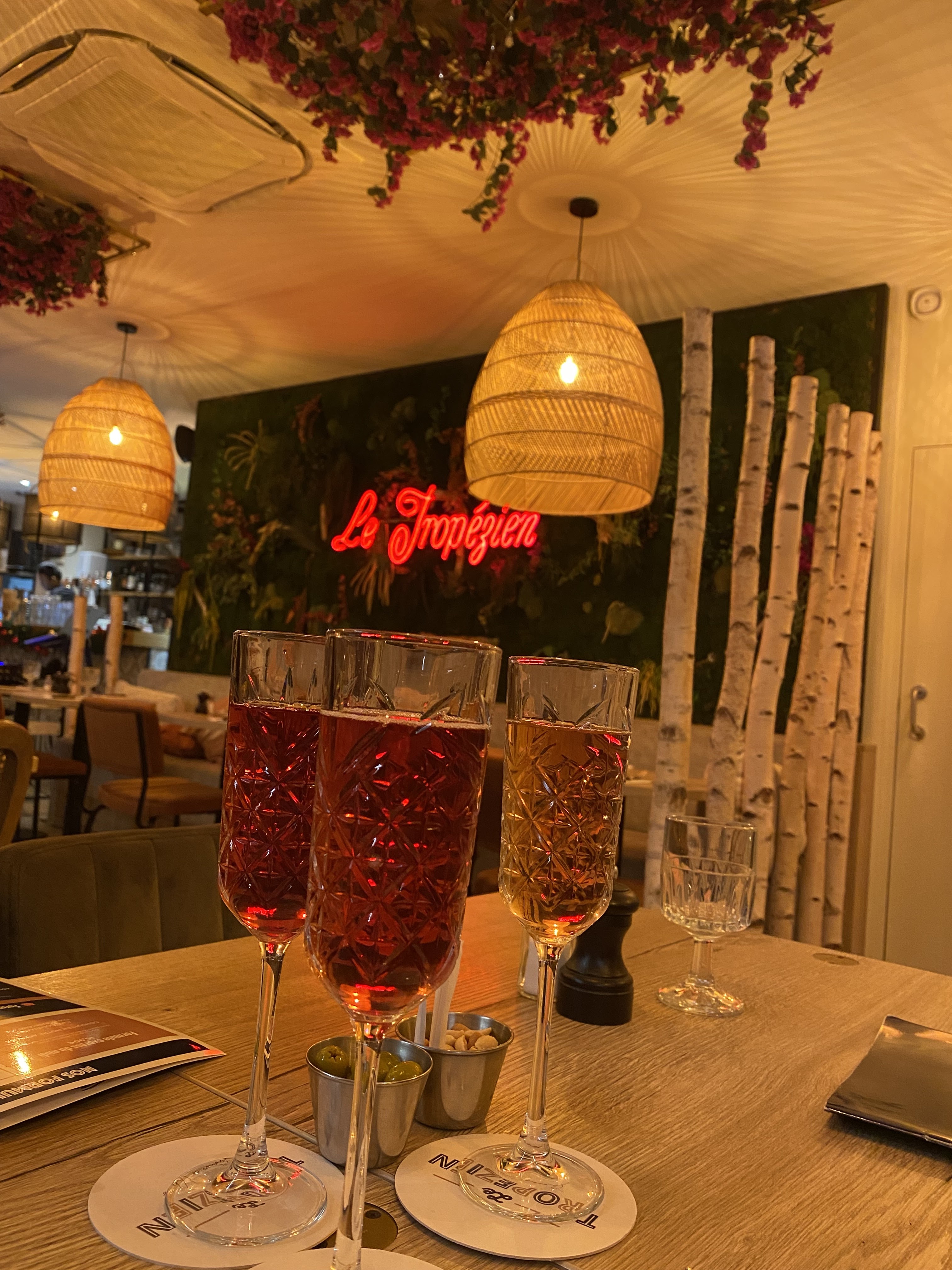 Belle soirée passée au Tropézien ce soir. Le décor est très sympathique, les plats copieux et savoureux. Une belle découverte des cocktails signature, le Cosmo est une merveille. La présence d'un DJ aux platines ce vendredi soir était un plus, en revanche, la musique était un peu trop forte, nous avons eu du mal à nous entendre parler et nous n'étions que 4. Merci aux différents serveurs qui ont tous été d'une extrême gentillesse.
