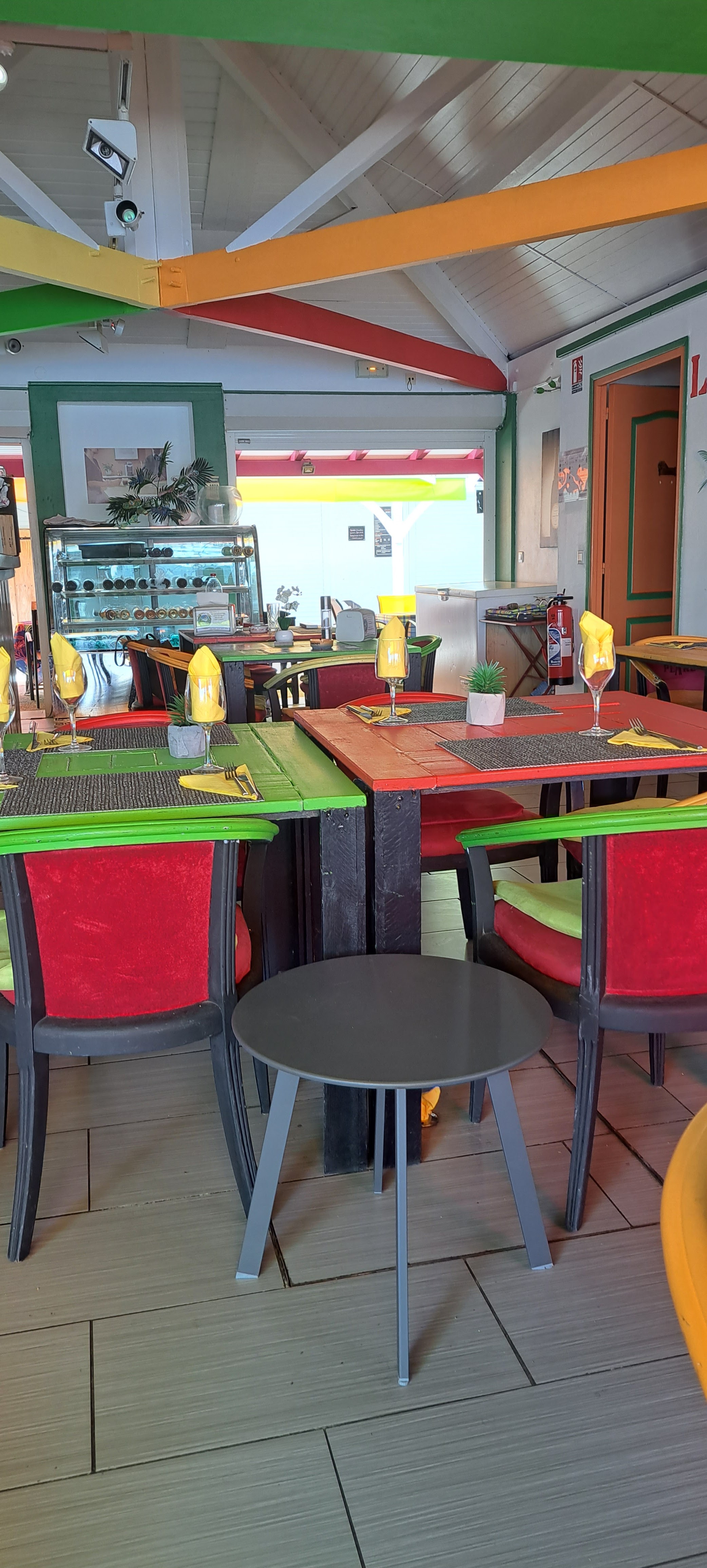 Ce resto attire l'attention avec tout ces couleurs un peu partout sur les murs les chaises les tables brefs je ne dirai pas que c'est harmonieux mais c'est joli et chaleureux le serveur est très sympa et avenant les plats sont délicieux les cocktails sont bien dosé en fonction de la demande vraiment je recommande vivement ce resto avec la belle vue sur la marina et sans les odeurs de sargasses