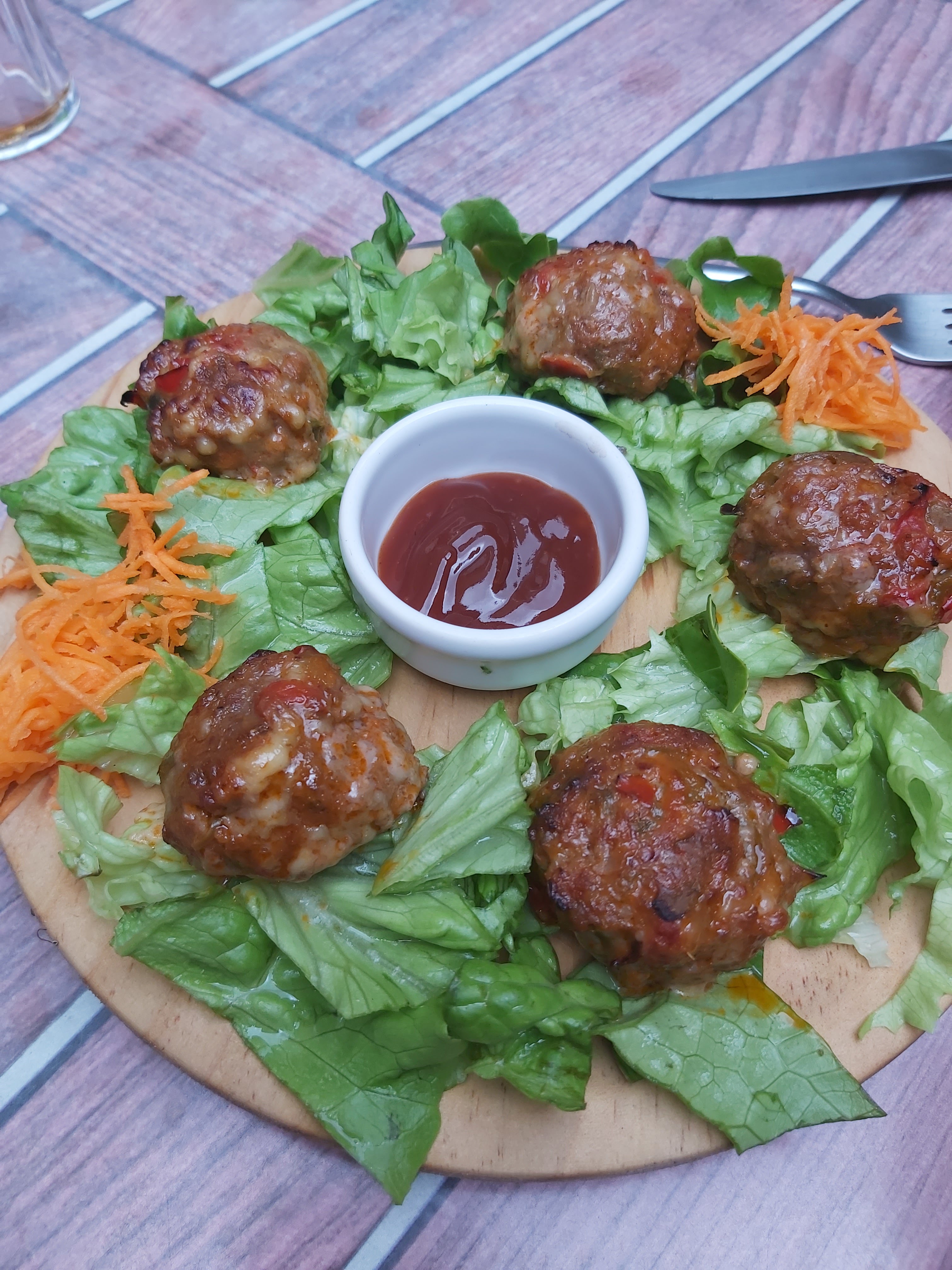 Repas mitigé. En entrée, beignet de crevette, bon, un peu gras. Toutefois, trop d’effort sur la présentation au détriment de la pratique. Petite assiette en ardoise, vous n’aurez pas le droit à l’erreur. Salade mal lavée et pas de sauce. Pour le plat principal, les frites bonnes, la salade correcte, la viande demandée « à point » était plutôt bien cuite et dure à mâcher. Nous étions déçu par le service, peu de sourire, il a fallu demander de l’eau et du pain, pas de couteau approprier pour la viande.