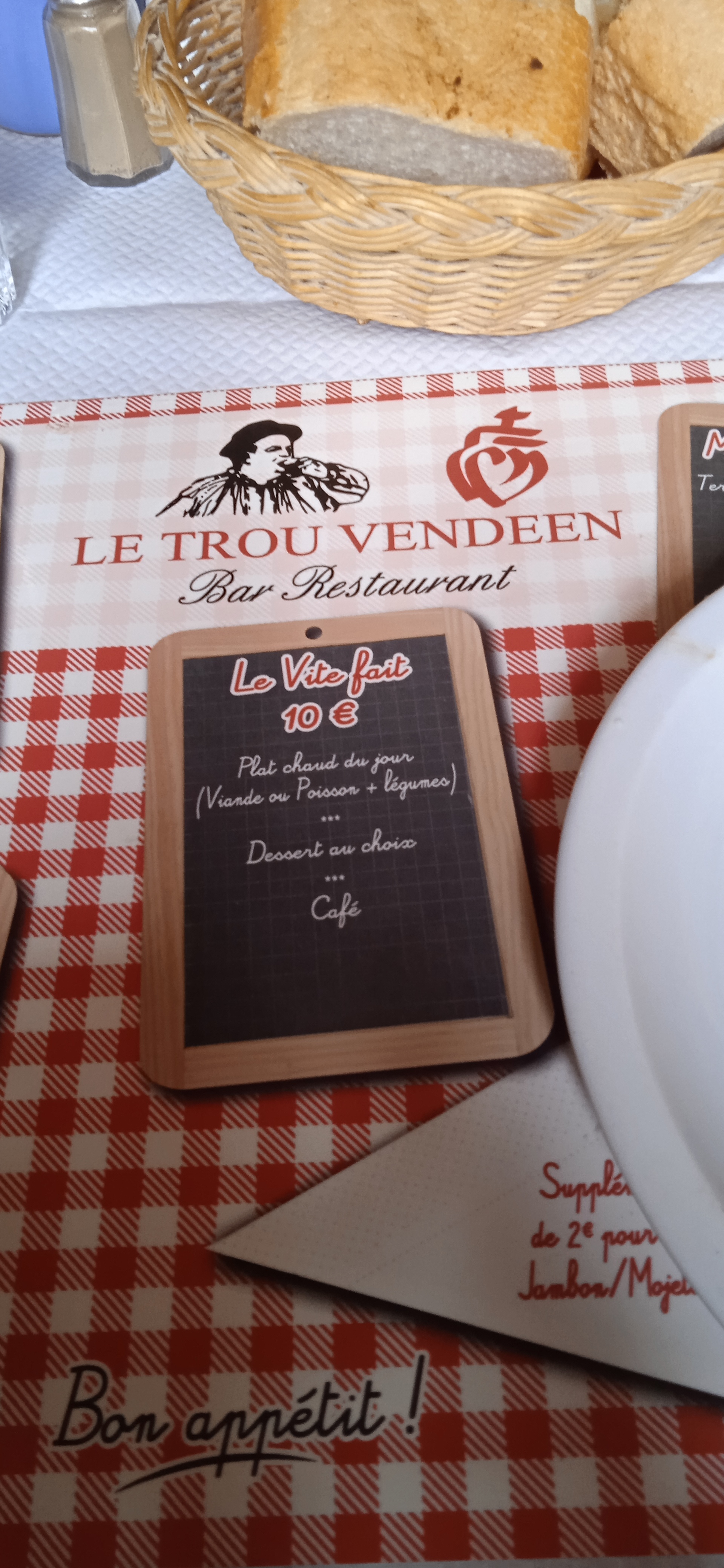Le 14/04 De Bergerac à CAUDAN par l' autoroute à midi on cherche un petit restaurant et on est tombé sur le Trou Vendéen. Dans un cadre calme et reposant avec un accueil très chaleureux (on n' avait pas réservé un dimanche) de la patronne, on s' est régalé avec les cuisses de grenouille et auparavant les terrines excellentes . Et en cadeau les cuisses de grenouilles restantes on fait notre menu du lundi midi à la maison. On retournera dès qu' on passera dans la région.