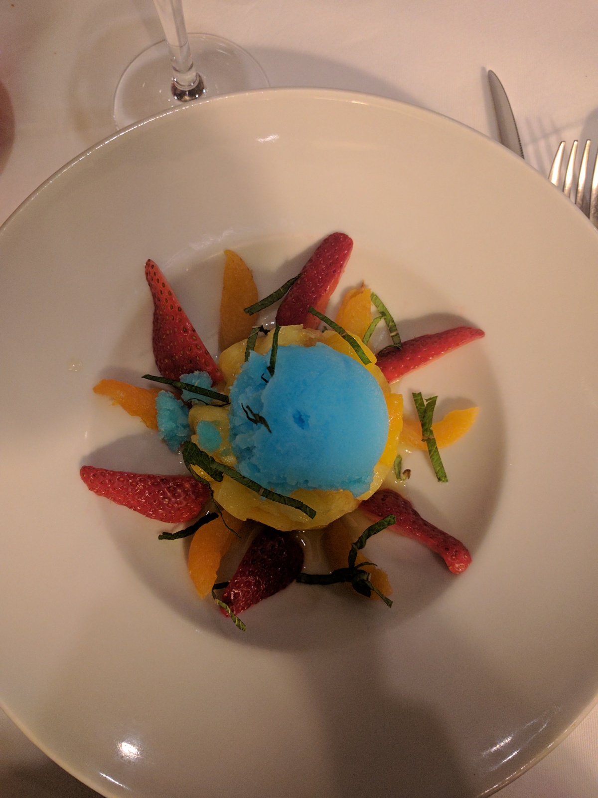 Nourriture géniale, adaptée aux enfants. Casser des chips. Entrée de sorbet Bloody Mary. Qu'y at-il à dire? J'aurais aimé rester pour le pudding.