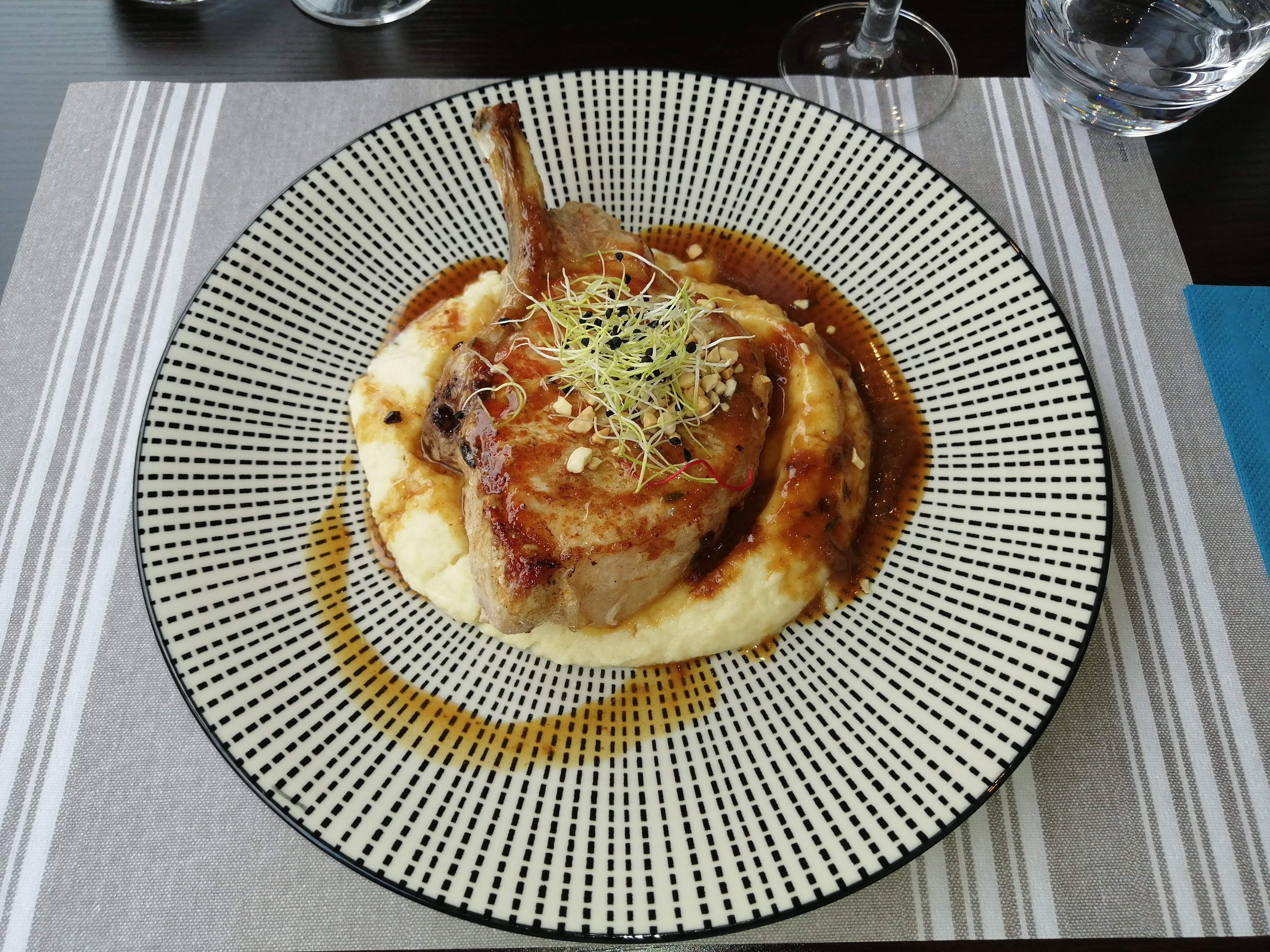Nous avions vraiment envie de manger à nouveau de la viande et sommes tombés sur ce restaurant. Nous y étions peu avant 19 heures/heureusement. Nous avons pu entrer malgré notre chien car heureusement, notre chien se couche toujours sous la table dans les restaurants et est calme. Les chiens ne sont probablement pas strictement interdits, mais ils doivent pouvoir se comporter et être silencieux pour que les autres invités ne soient pas dérangés car ils souhaitent eux aussi profiter d'une belle soirée. Nous avons pu savourer un bon repas. Nous avions un menu complet. Mon mari a choisi les raviolis avec ricotta/steak et assiette de fromages. J'ai eu des œufs avec de la crème et des asperges/steak et mousse au chocolat. Les menus coûtent 28 euros pièce. Tout était très bon. Une réservation aurait probablement du sens, car le restaurant se remplit très rapidement et il ne restait plus de tables. Le service est sympathique et pas intrusif. Nous pouvons fortement le recommander.