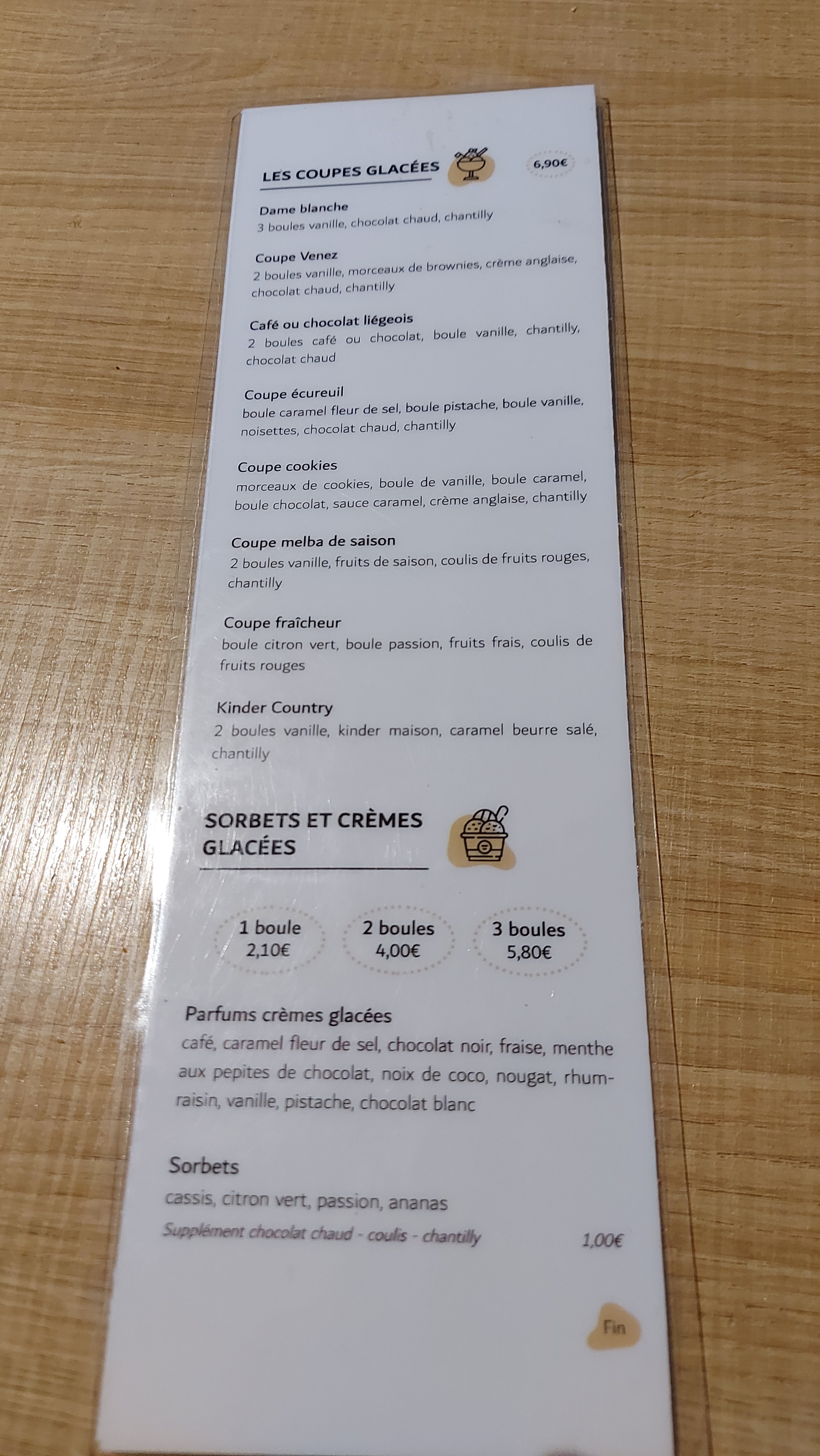 Ce jour, le 24/06/2023 Je commande 2 coupes de glaces. 7,50€ chacune Déjà, j'attends 25 minutes On nous ramène les glaces, sans cuillères. 25 min qu'on attend, on vous dépose les glaces devant le nez, mais vous ne pouvez pas les manger 🤔 Visiblement ça n'a choqué personne ! Je me déplace pour demander 2 cuillères Passons à la glace : je n'ai pas vu les 3 boules mentionnées sur le menu, la qualité de la glace (j'en rigole😂) même la marque de Lidl est meilleure ! À moitié fondu, enfin bref... Très mauvaise expérience !!! Pourtant à l'intérieur pas loin de 8 membres du personnel. Je vous déconseille vivement les coupes de glaces dans cette établissement. Pourtant jusqu'à ce jour, je voyais cet établissement comme de qualité. Très déçu 😤vraiment dommage !