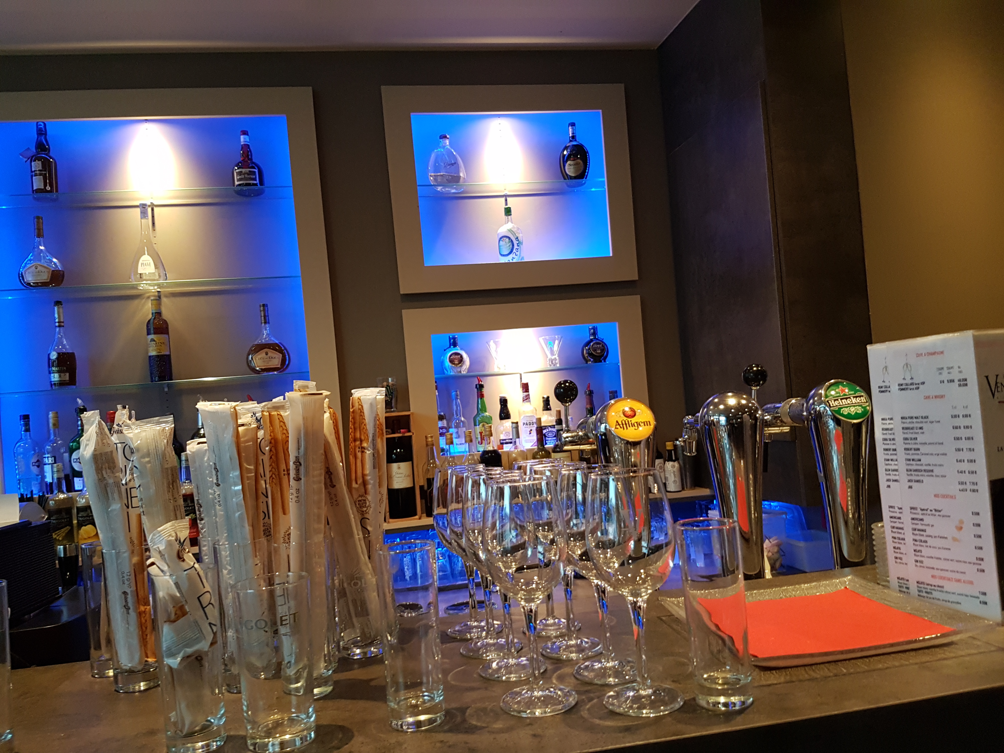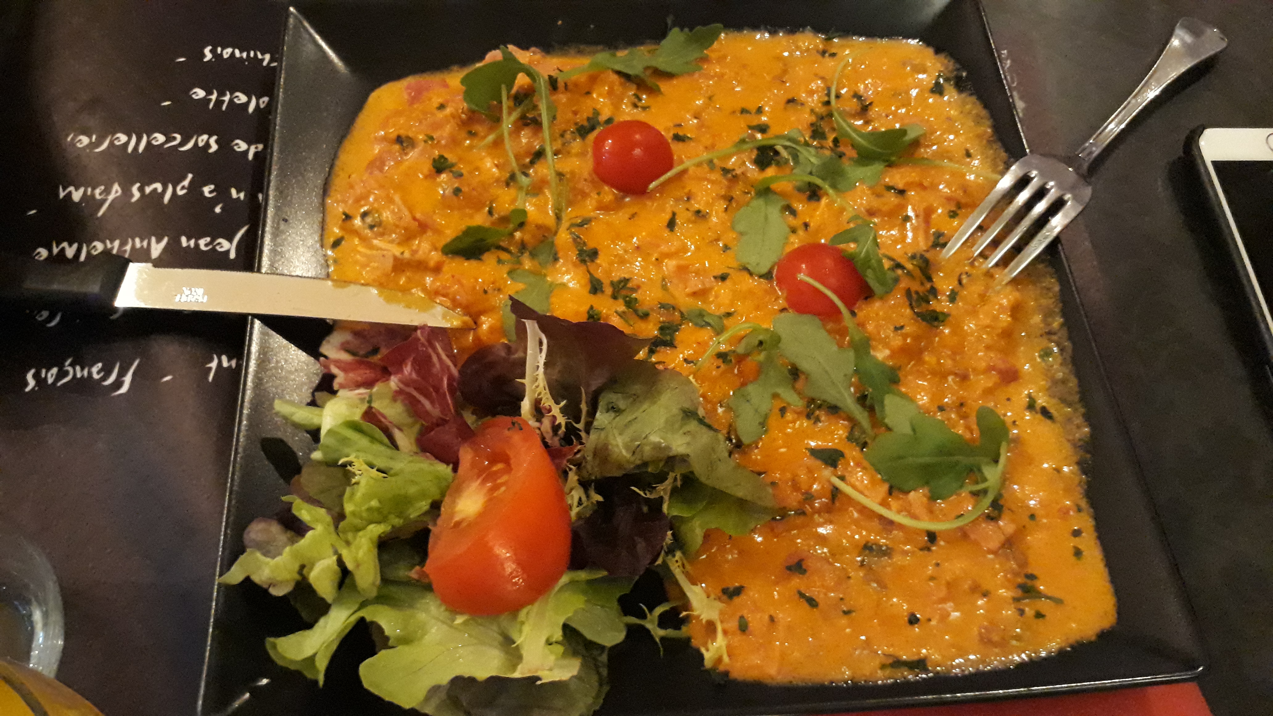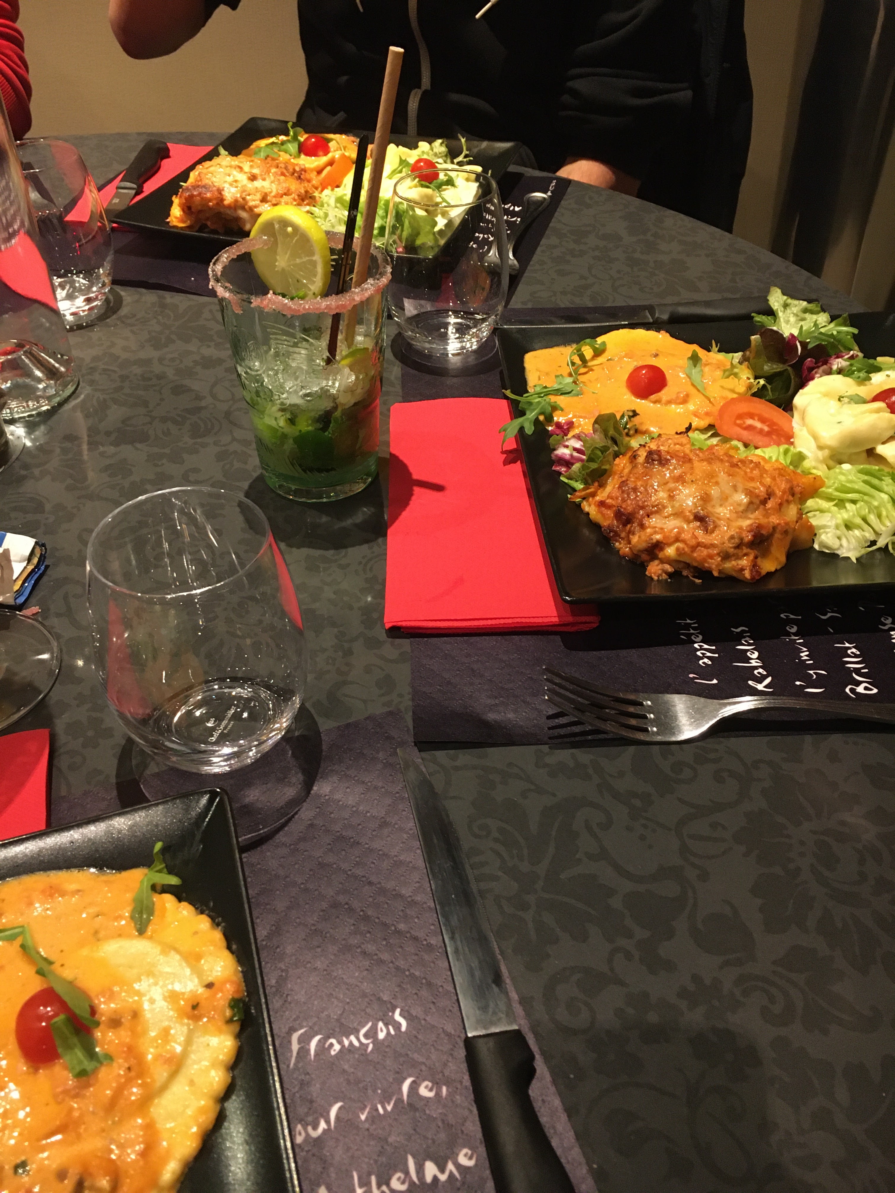 Endroit vraiment chic avec une déco qui n a pas manqué de me plaire. Service rapide. Du choix dans la carte. Du gout dans l assiette. Du pain maison chaud. Que demander de plus. Je regrette juste l intérieur de mes délicieuses lasagnes qui étaient froides et dont je n ai pas pu terminer le plat. Le désert aurait pu être offert pour ce genre de désagrément. Dommage.