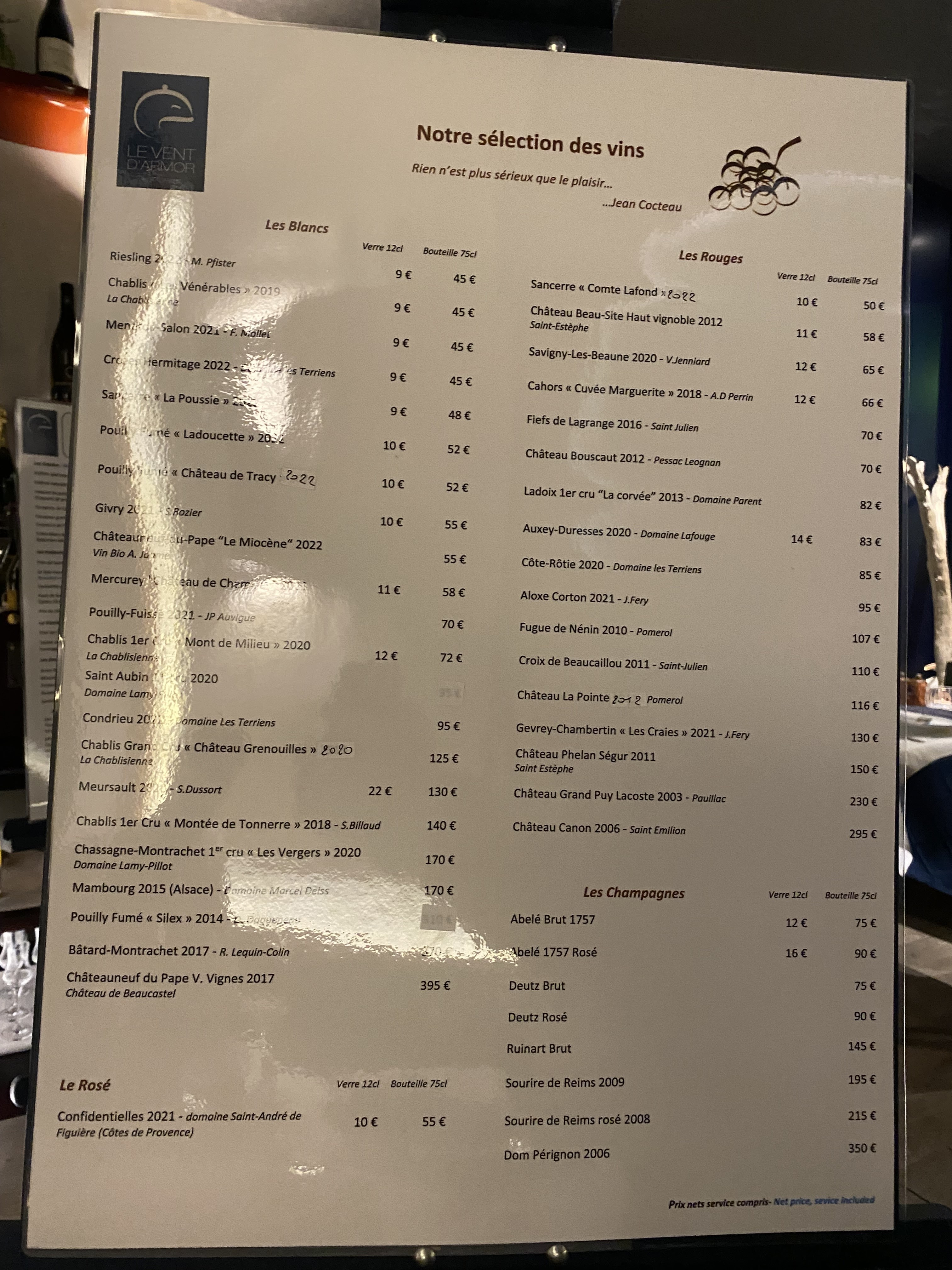 Nous avons mangé pour 4 au restaurant Le vent d'Armor le 24/07. Tout était exceptionnel : l'accueil, le repas et l'expérience. Ce restaurant est un bijou que les habitués chérissent. Merci pour cette belle soirée.