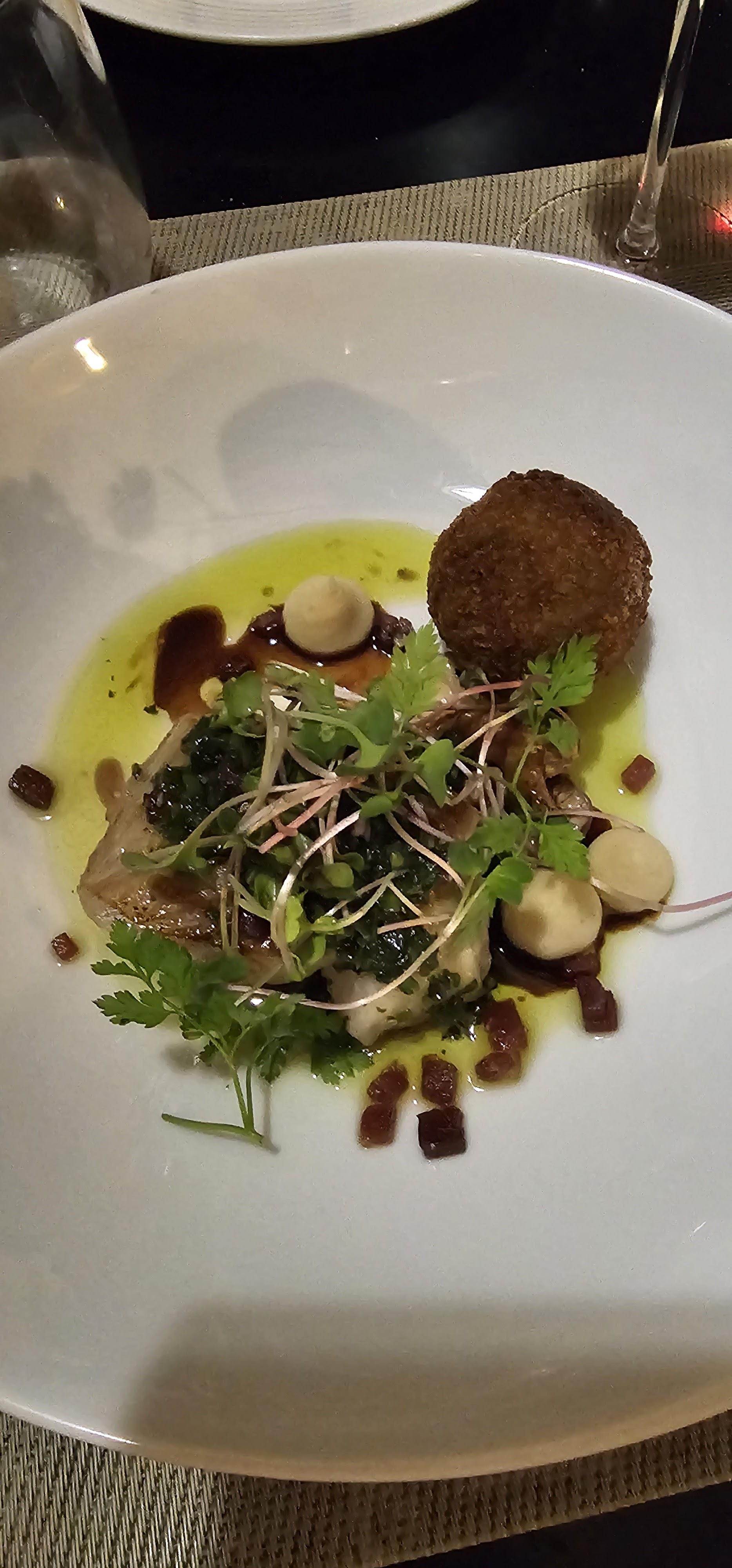 Repas excellent du début à la fin. J'ai beaucoup aimé la salade aux asperges crumble de parmesan. Je ne suis pas arrivée à définir les ingrédients de la sauce verte. Je fais appel au cuisinier...très bonne