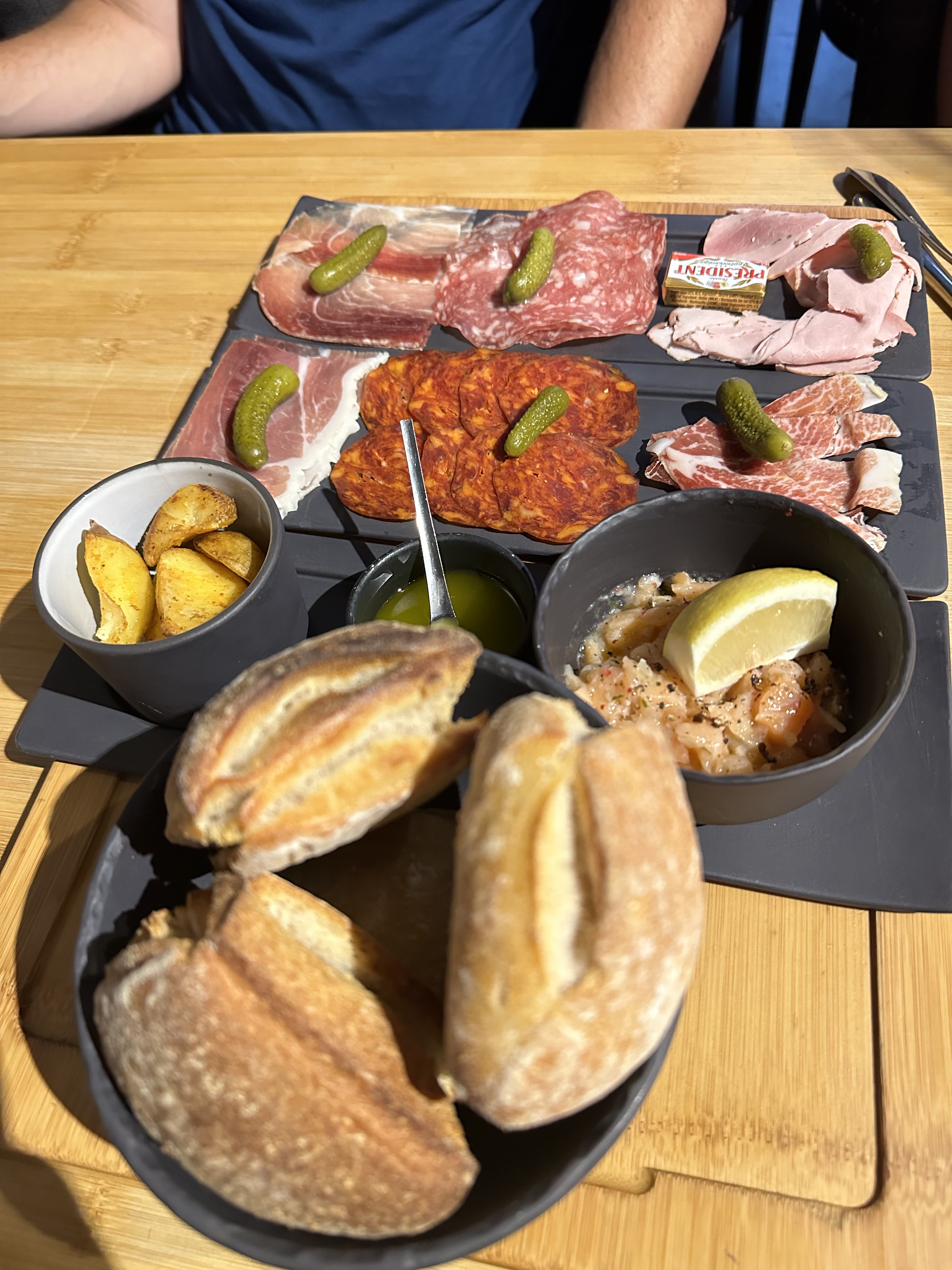Très bonne expérience. Je conseille le tartare de saumon et rillettes. Beaucoup de saveurs ! Un peu déçu de l'ardoise de charcuteries. Le jambon truffé ne sentait pas la truffe. Très content d'avoir eu du pain chaud et croustillant ! Salles pouvant accueillir beaucoup de monde. Bon service.