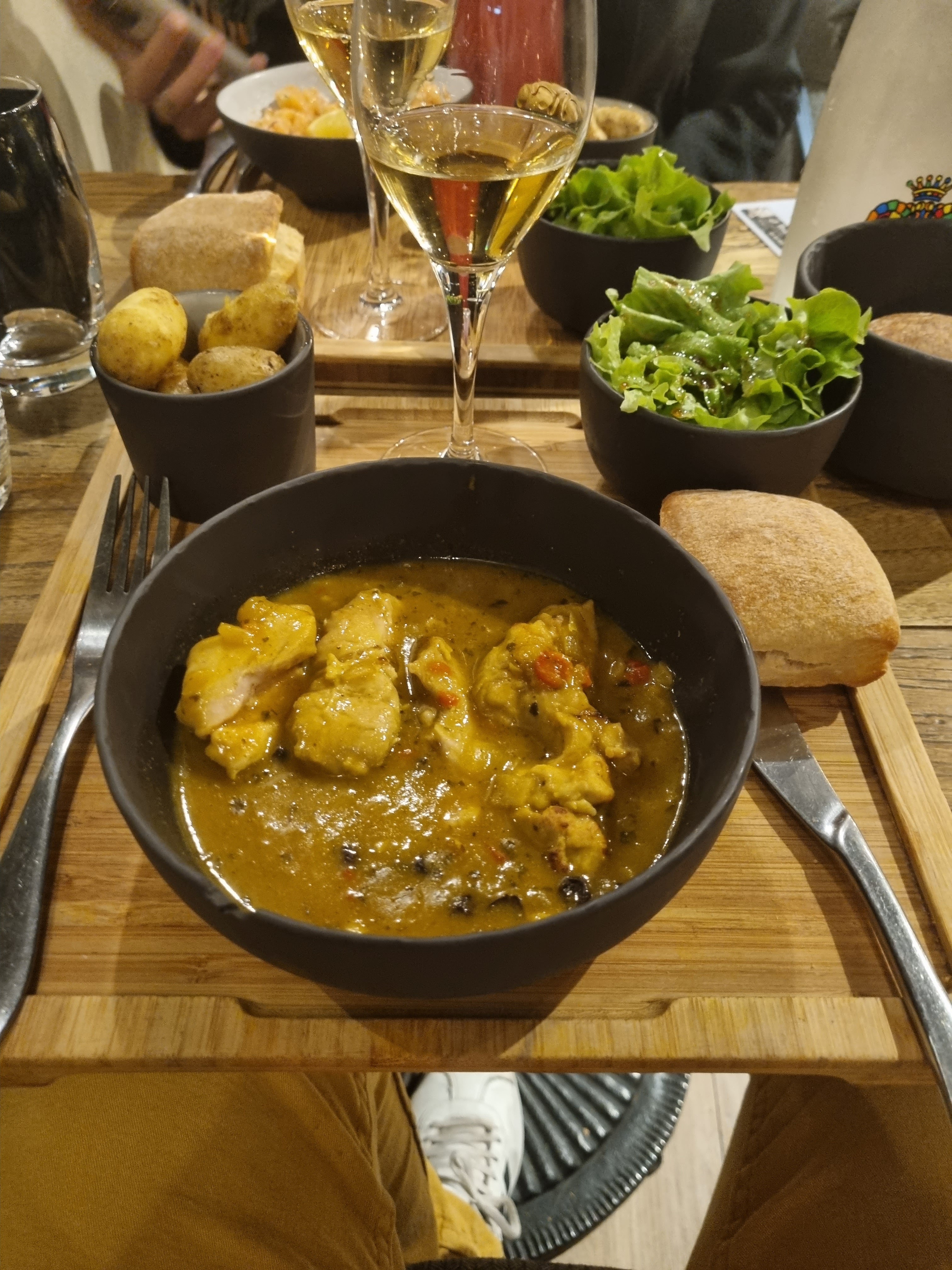 Quelle déception! Nous y sommes allés à 4. Assiettes de charcuterie bof ! Une salade jambon cru avec une salade entière je pense!! 4 curry de poulet : le poulet mou et pas cuit un sauce médiocre avec pommes de terre Et une salade (encore !! ) bonne pour les lapins fripée et mal nettoyée. Le vin au verre sans savoir ce que l on boit. C est si difficile de faire du correct ??? A fuir