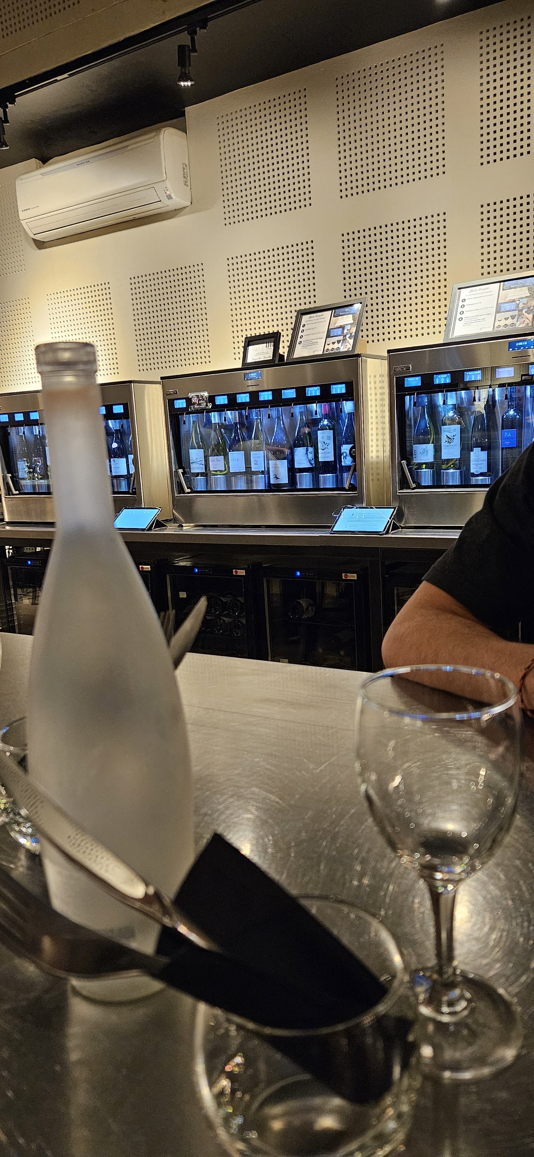 Nous sommes venus un soir manger des tapas. Le service déplorable. On a dû attendre 1h pour avoir seulement notre entrée ! Vous imaginez la suite... Le serveur était poli mais défaillant étant donné qu’il arrive avec une chose à la fois (1 pain par un pain, etc.). Là nourriture est bonne mais pour l’attente c’est déplorable ! Le concept du vin au verre par des machines est une bonne idée, à la base. Cependant les portions sont toutes petites, la machine envoie très vite le vin dès que tu lui as mis ta carte. Ce qui fait que tu perds une partie de ton vin car tu as mis ton verre trop tard sous la machine ! Restaurant que je déconseille fortement pour éviter une perte de temps.