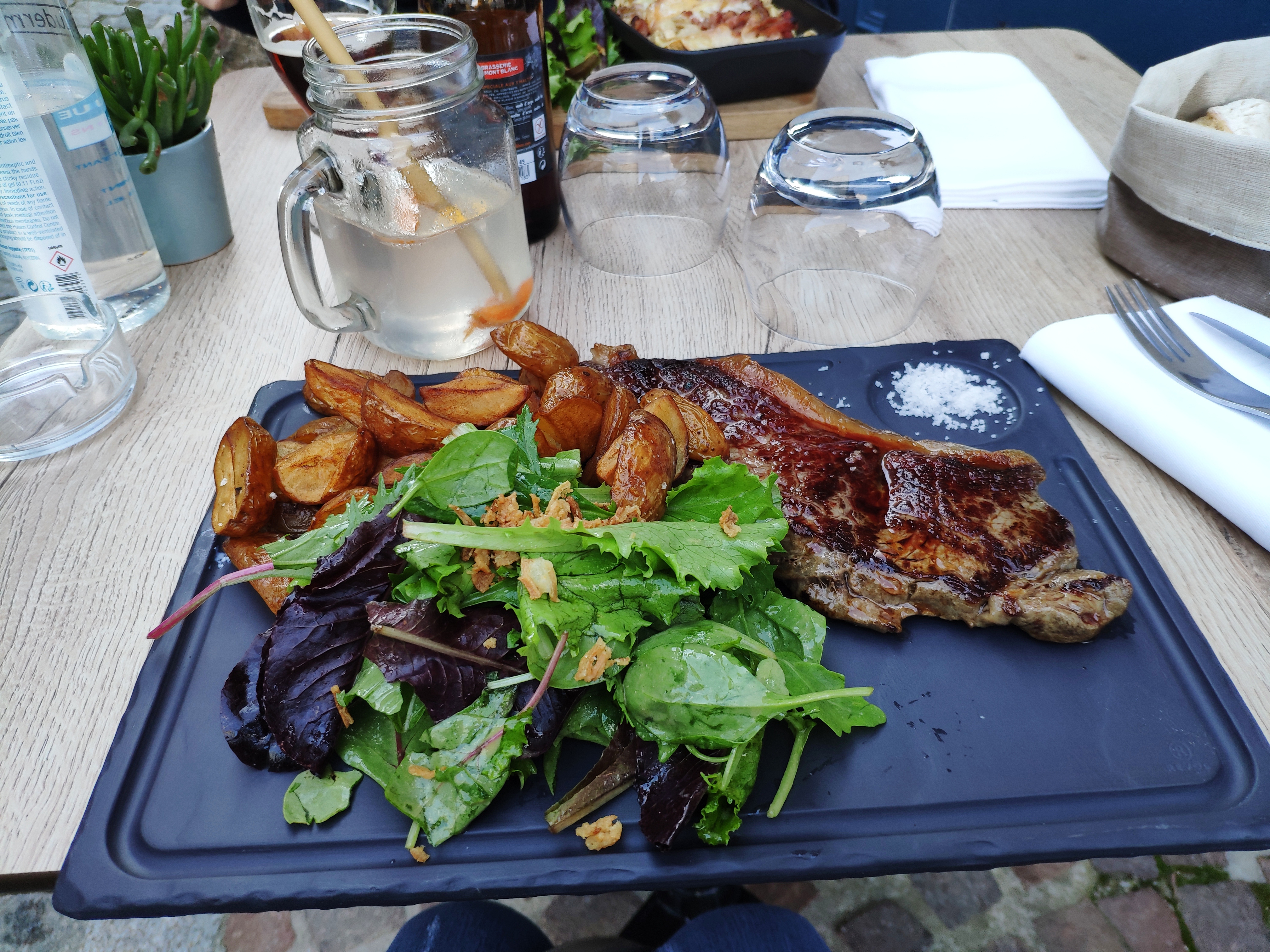 Petit restaurant avec du potentiel. Un chouette restaurant dans le quartier de la Boucherie à Limoges, cadre idéal, chaleureux et authentique. Nous avons passé un bon moment lors de nos deux visites, nonobstant quelques critiques sur nos plats, mais aussi de belles qualités. Un burger raclette trop fort en fromage, et pourtant, je suis clairement un amateur de raclette. Probablement le seul burger que je n'ai pas fini de ma vie. Mais pas de panique, vous aurez le droit à une belle entrecôte, avec ses frites (trop peu par rapport au poids de la viande !), et surtout à une belle tartiflette, qui reflète le restaurant. Nous avions commandé des cafés pour la fin du repas, qui ne sont jamais arrivés, hélas. Pressés, nous sommes donc partis. Ceci dit, nous y reviendrons avec plaisir.