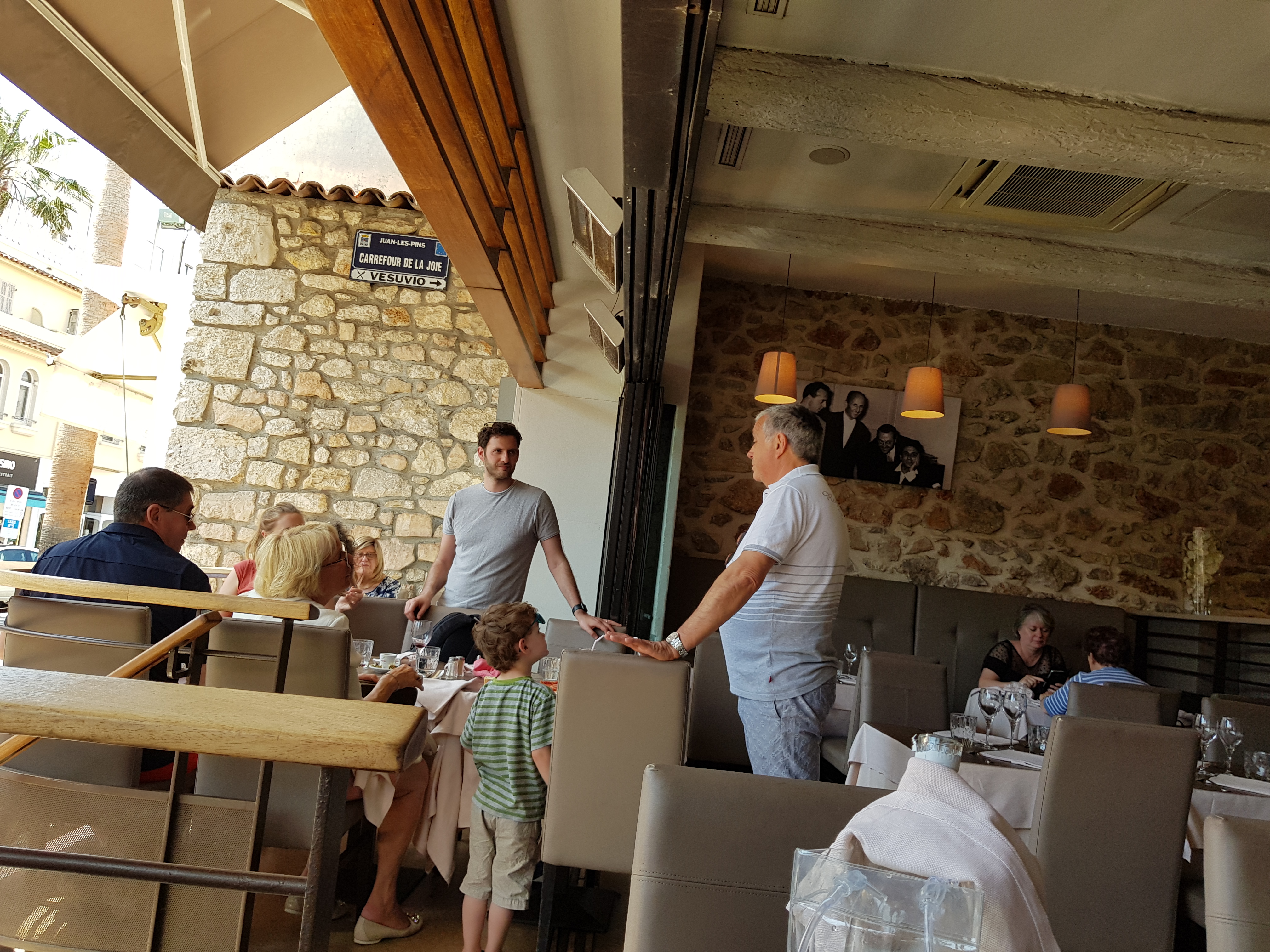 Avec Charly plein de tact qui se précipite pour aider la personne âgée a s'installer pour apprécier la vue plongeante de sa terrasse supérieure. Pour 17 euros: plat du jour(ce jeudi:bavette aux échalotes et café très gourmand ) A Juan les Pins c'est un bon plan.