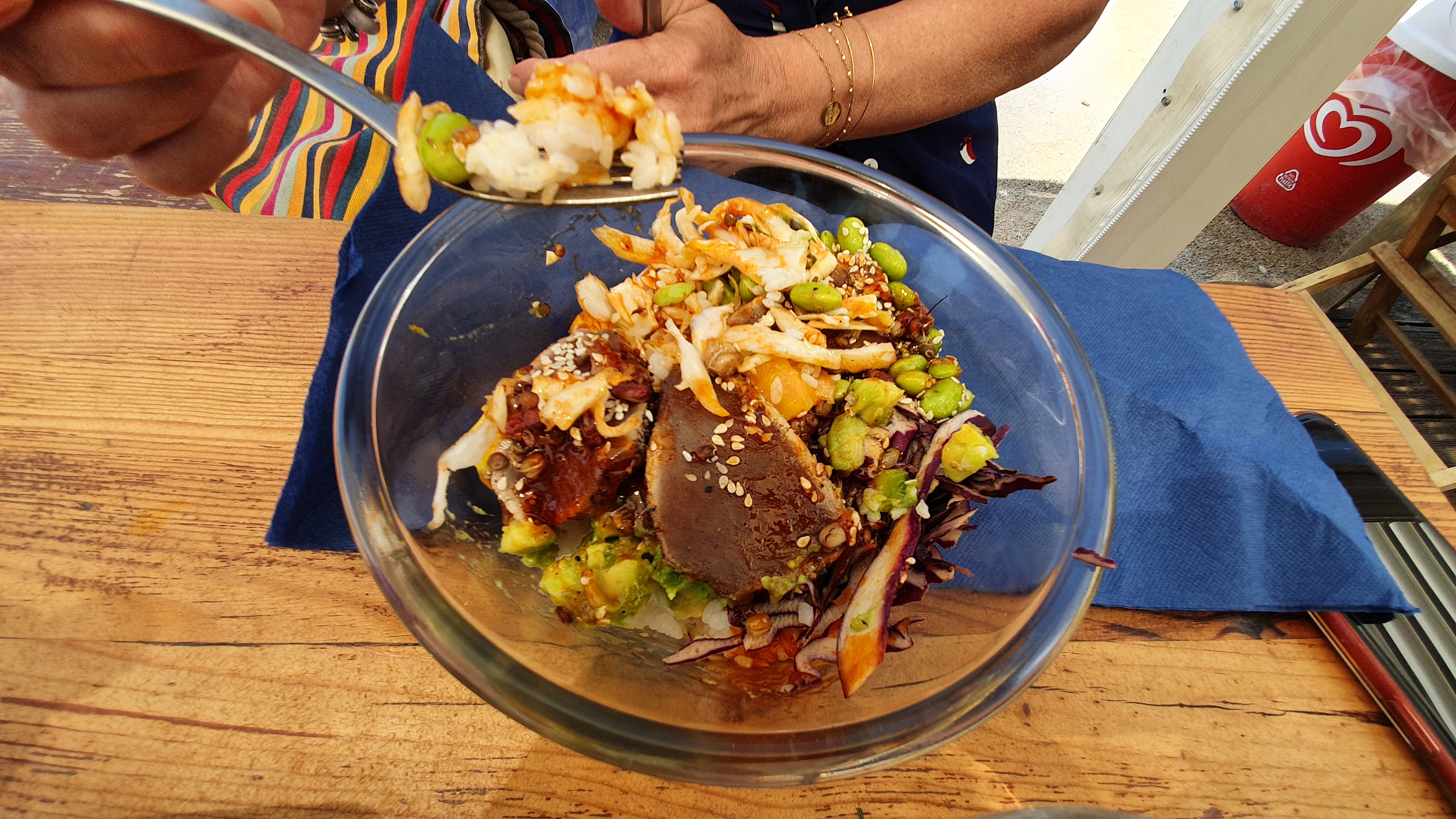 On y mange probablement bien, mais le problème était la présence de nombreux fumeurs, et même si le style paillote semi-ouverte peut se comparer à un espace ouvert, les cloisons plastique pour se protéger du vent font qu'on retrouve l'ambiance d'avant la loi sur le tabac. Dommage de revenir en arrière. Donc on est reparti.