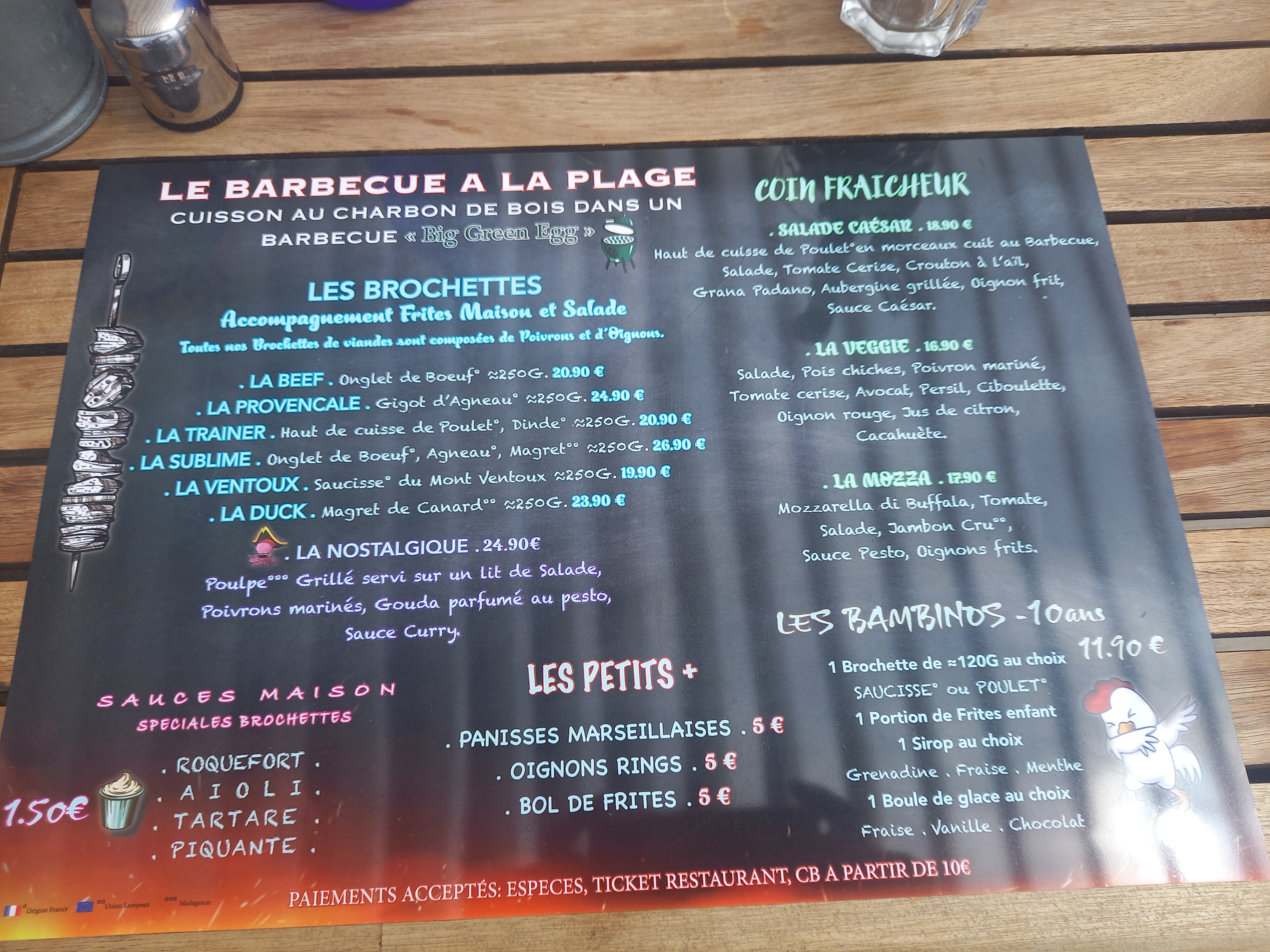 Superbe expérience. Nous sommes arrivés après le coucher du soleil sur cette magnifique petite plage. Super accueil, service professionnel et agréable. Spécialités de brochettes de thon, poulet, boeuf et poulpe. Excellent. Menu enfant 11,90 moins de 10 ans. Je conseille.