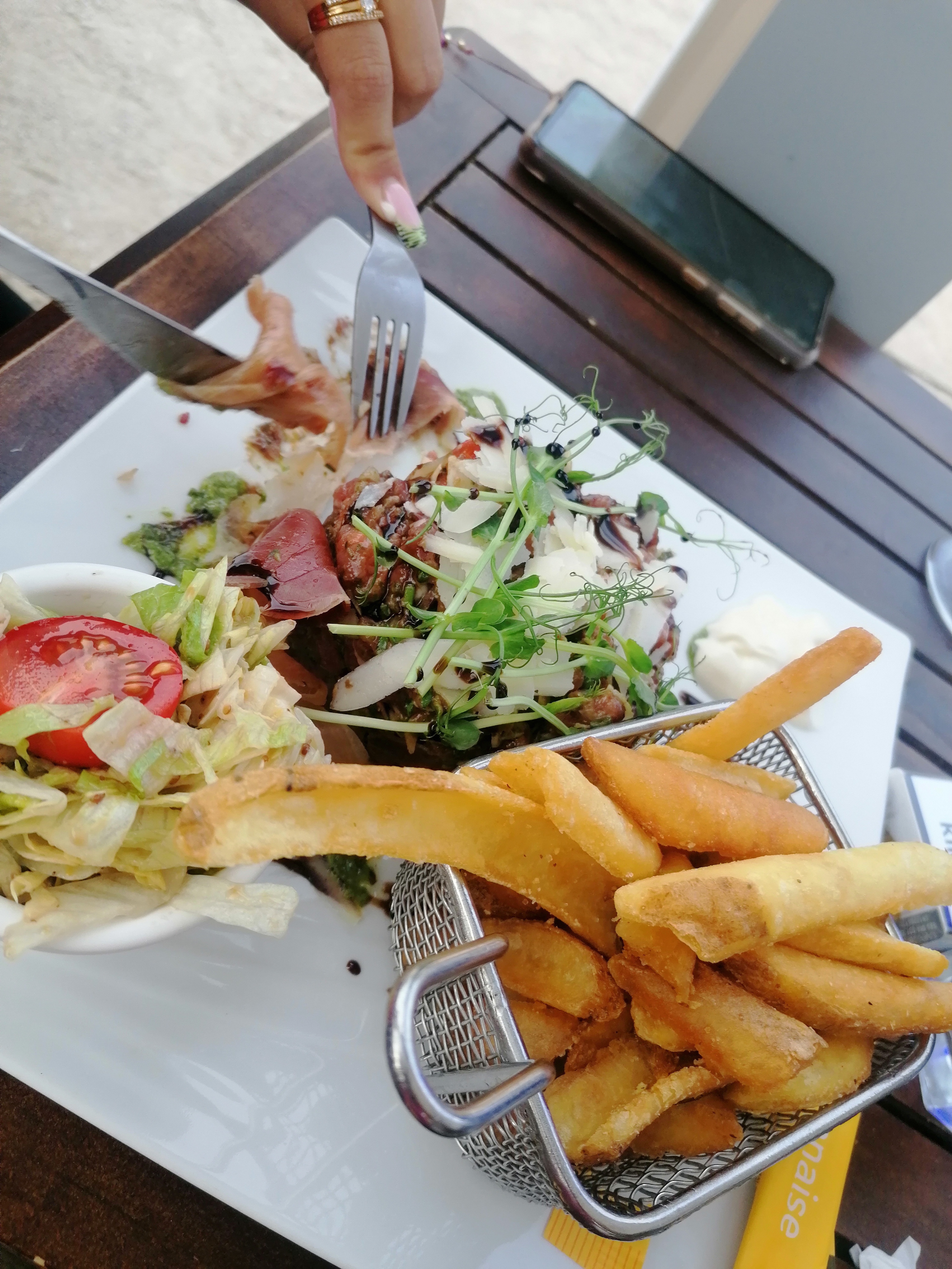 Tous les plats étaient excellents : on a testé tous les burgers (poulet, boeuf, poulpe), ribs de porc, pièce de boeuf, tout le monde était contents. Service très sympathique (un peu lent s'il fallait chipoter mais c'était plein et en bord de mer ça passe mieux 😊), prix tout à fait corrects, bref une bonne surprise pour ce resto de plage ! À noter : pas possible de juste boire un verre au dîner quand c'est plein (logique mais il faut le savoir)