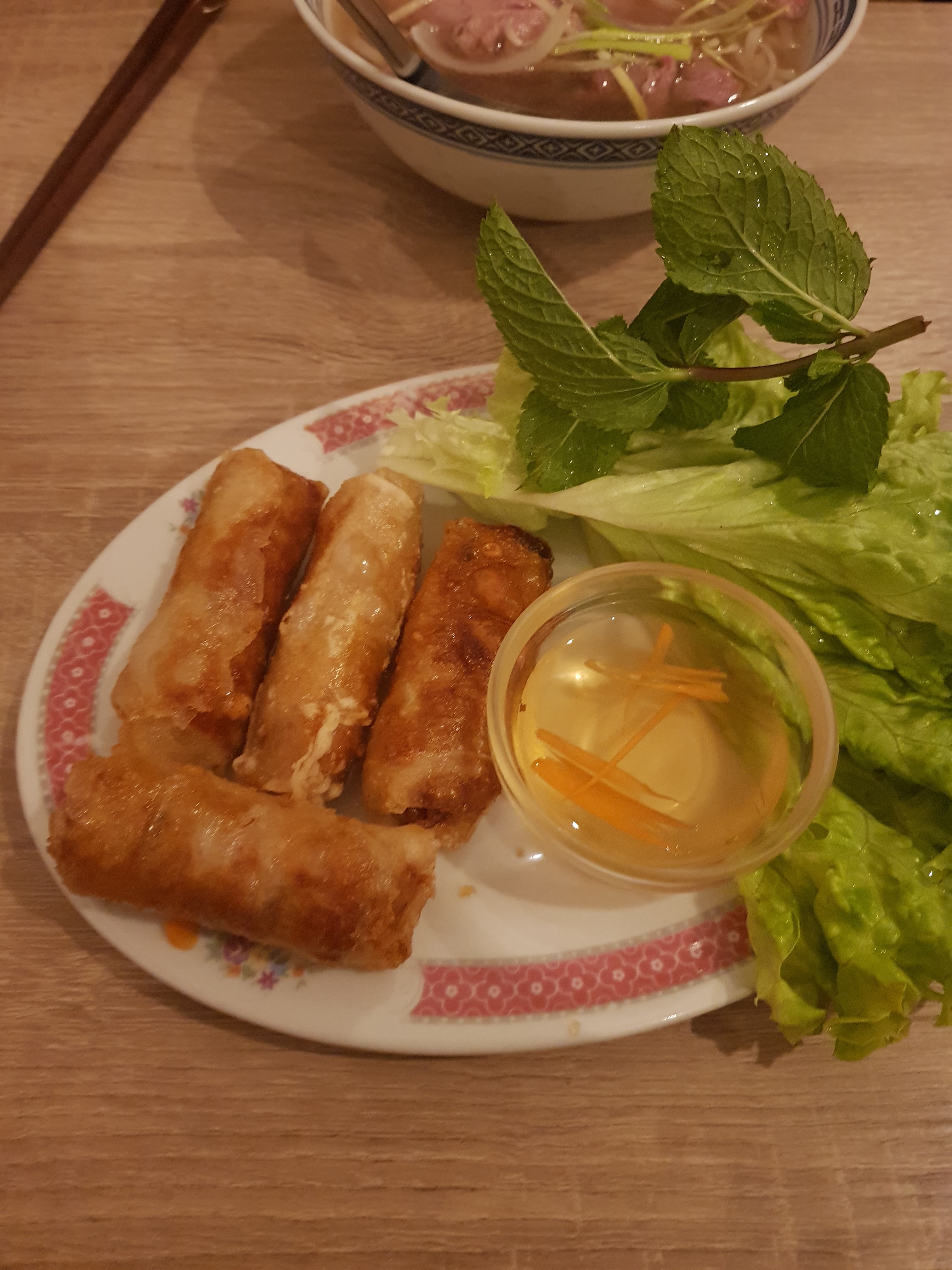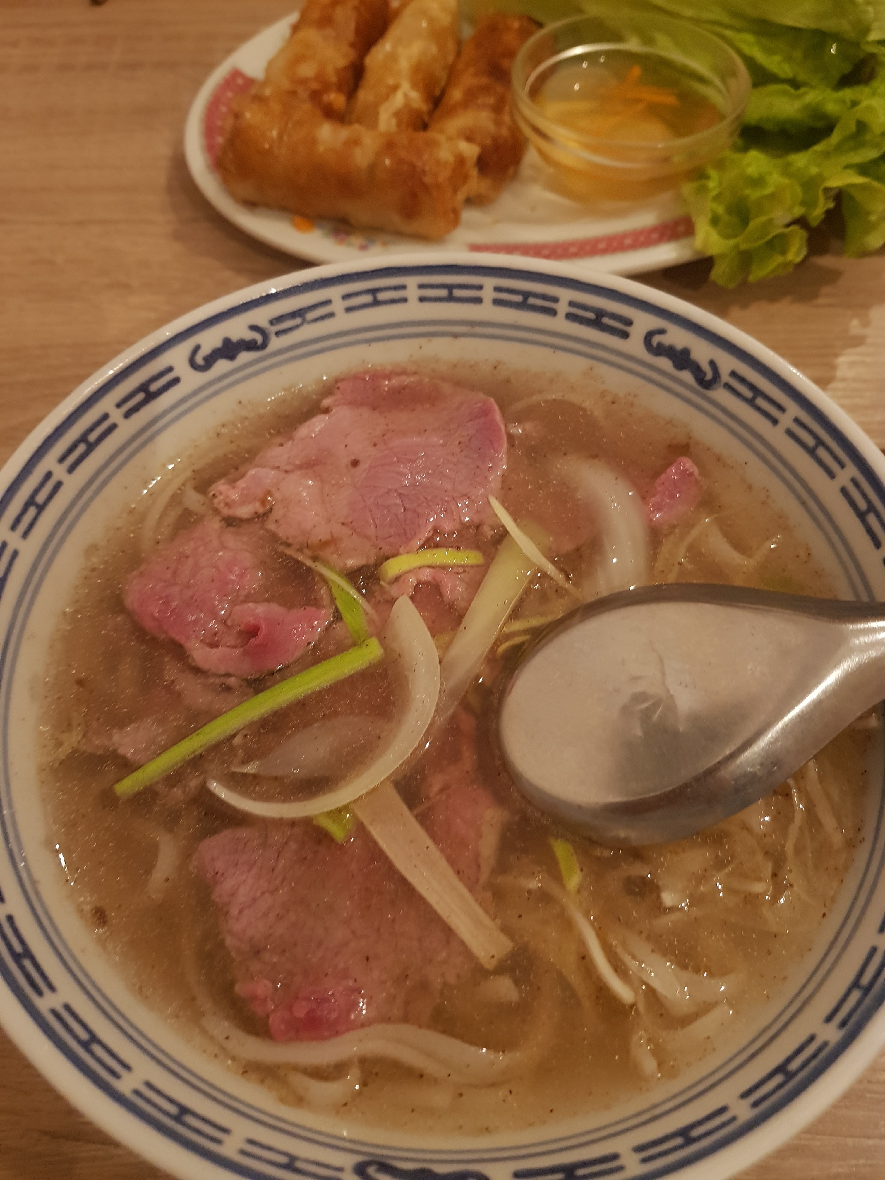 le pho est bon mais pas assez chaud. quand vous avez envie d'une soupe aux nouilles, elle devrait être chaude ! le rouleau de printemps est délicieux. . meilleur que prévu.