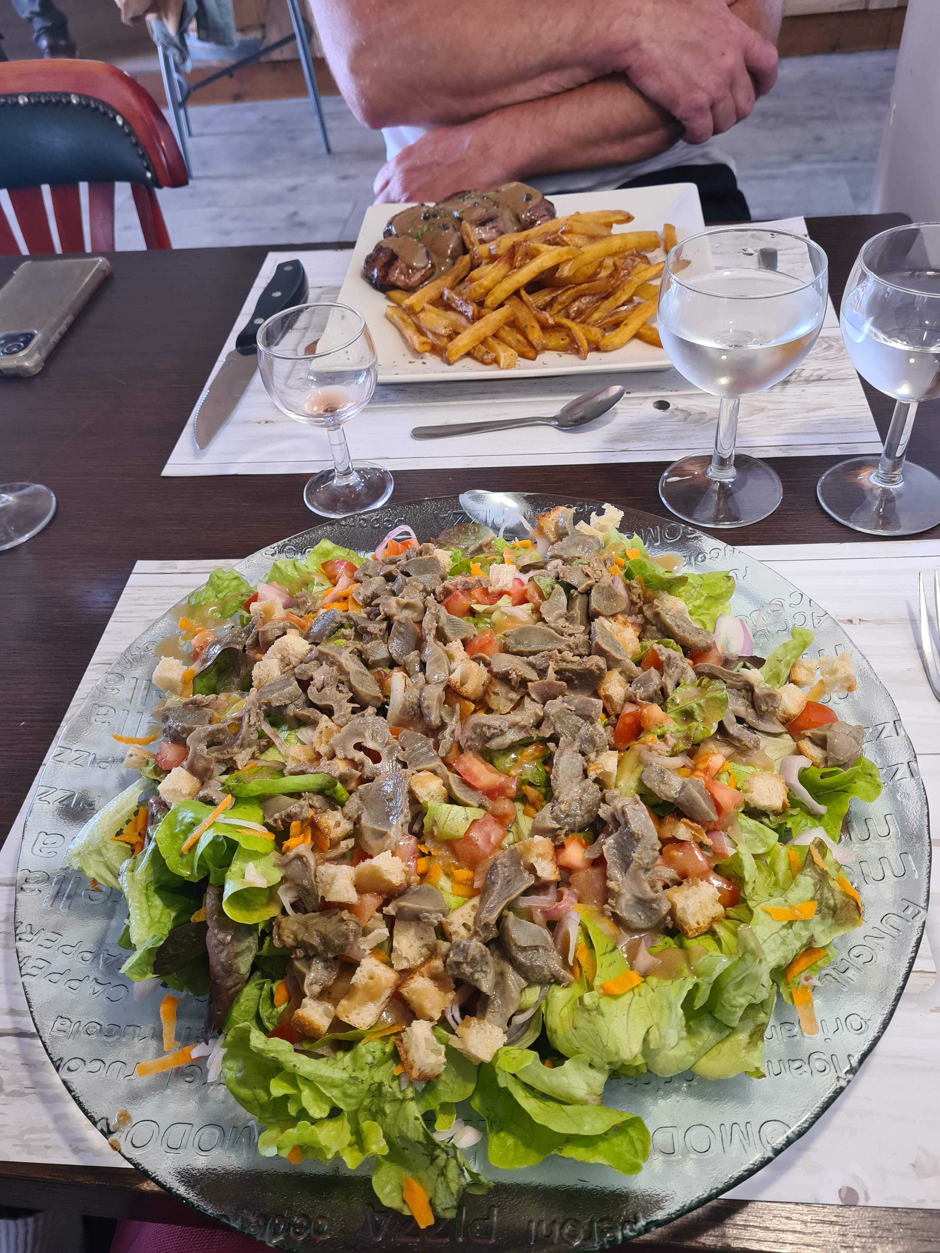 Joli petit bar restaurant avec terrasse arrière spacieuse. Propriétaire sympathique et animaux acceptés également. Il y avait un entrecôte avec salade de canard et frites maison et une belle bouteille de vin rouge et de bons desserts de tarte aux pommes et d'Ile flottante. Nous avons eu l'assiette complète mais le menu du jour est également disponible. Prix très raisonnables pour la qualité des steaks et de la sauce aux champignons. Bel endroit
